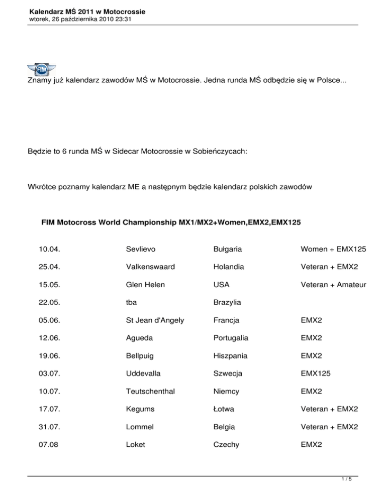 Kalendarz MŚ 2011 w Motocrossie wtorek, 26 października 2010 23:31 Znamy już kalendarz zawodów MŚ w Motocrossie. Jedna runda MŚ odbędzie się w Polsce... Będzie to 6 runda MŚ w Sidecar Motocrossie w Sobieńczycach: Wkrótce poznamy kalendarz ME a następnym będzie kalendarz polskich zawodów FIM Motocross World Championship MX1/MX2+Women,EMX2,EMX125 10.04. Sevlievo Bułgaria Women + EMX125 25.04. Valkenswaard Holandia Veteran + EMX2 15.05. Glen Helen USA Veteran + Amateur 22.05. tba Brazylia 05.06. St Jean d'Angely Francja EMX2 12.06. Agueda Portugalia EMX2 19.06. Bellpuig Hiszpania EMX2 03.07. Uddevalla Szwecja EMX125 10.07. Teutschenthal Niemcy EMX2 17.07. Kegums Łotwa Veteran + EMX2 31.07. Lommel Belgia Veteran + EMX2 07.08 Loket Czechy EMX2 1/5 Kalendarz MŚ 2011 w Motocrossie wtorek, 26 października 2010 23:31 21.08. Matterly Basin Wlk Brytania 04.09. tba tba Veteran+EMX2+EMX125 11.09. tba Włochy EMX2 FIM Motocross World Championship MX3+women 17.04. Megalopolis Grecja Woman 24.04. Troyan Bułgaria 15.05. Laguna Caren Chile 22.05. La Rioja Argentyna 29.05. tba Brazylia 12.06. Vantaa Finlandia Woman 19.06. Holice Czechy Woman 26.06. Senkvice Słowacja Woman 10.07 Chernivtsy Ukraina 17.07. Orehova Vas Słowenia Woman 31.07. Schwedt Niemcy Woman 04.09. Geneva Szwajcaria Woman 11.09. La Bañeza Hiszpania Woman FIM Women’s Motocross World Championship 10.04. Sevlievo Bułgaria 17.04. Megalopolis Grecja 2/5 Kalendarz MŚ 2011 w Motocrossie wtorek, 26 października 2010 23:31 12.06. Vantaa Finlandia 19.06. Holice Czechy 26.06. Senkvice Słowacja 17.07. Orehova Vas Słowenia 31.07. Schwedt Niemcy 04.09. Geneva Szwajcaria 11.09. La Bañeza Hiszpania FIM Veteran Motocross World Cup 25.04. Valkenswaard Holandia 15.05. Glen Helen USA 17.07. Kegums Łotwa 31.07. Lommel Belgia 21.08. Matterly Basin Wlk. Brytania 04.09. tba tba FIM Motocross of Nations 25.09. St Jean d'Angely Francja FIM Junior Motocross World Championship 3/5 Kalendarz MŚ 2011 w Motocrossie wtorek, 26 października 2010 23:31 14.08. Cingoli Włochy FIM Sidecar Motocross World Championship 03.04. Oss Holandia 17.04. Castelnau de Levis francja 25.04. Frauenfeld Szwajcaria 08.05. Chernivtsi Ukraina 13.06. Brou Francja 26.06. Sobienczyce Polska 03.07. Genk Belgia 24.07. Strassbessenbach Niemcy 07.08. Kegums Łotwa 14.08. Kivioli Estonia 21.08. Kamensk-Uralskiy Rosja 04.09. Slagelse Dania 11.09. Rudersberg Niemcy FIM Freestyle Motocross World Championship 18.02. Turin Włochy tbc 19.02. Turin Włochy tbc 05.03. Berlin Niemcy 4/5 Kalendarz MŚ 2011 w Motocrossie wtorek, 26 października 2010 23:31 06.03. Berlin Niemcy 25.03. Basel Szwajcaria 26.03. Basel Szwajcaria 07.05. Adana Turcja tbc 18.06. Penza Rosja tbc tba Windhoek Namibia tba tba tba 22.10. Riga Łotwa tba Ostrava Czechy 26.11. Wien Austria tbc 27.11. Wien Austria tbc 10.12. tba Brazylia tbc 5/5