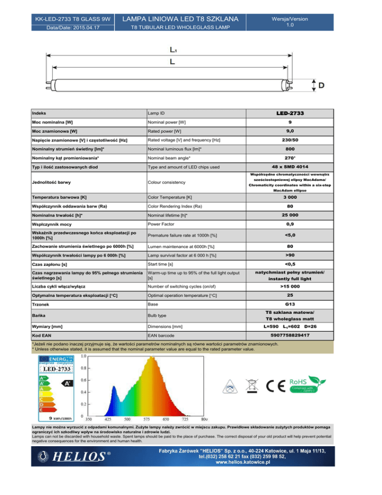 KK-LED-2733 T8 GLASS 9W LAMPA LINIOWA LED T8 SZKLANA Data/Date: 2015.04.17 T8 TUBULAR LED WHOLEGLASS LAMP Wersja/Version 1.0 LED-2733 Indeks Lamp ID Moc nominalna [W] Nominal power [W] Moc znamionowa [W] Rated power [W] Napięcie znamionowe [V] i częstotliwość [Hz] Rated voltage [V] and frequency [Hz] Nominalny strumień świetlny [lm]* Nominal luminous flux [lm]* 800 Nominalny kąt promieniowania* Nominal beam angle* 270° Typ i ilość zastosowanych diod Type and amount of LED chips used 9 9,0 230/50 48 x SMD 4014 Współrzędne chromatyczności wewnątrz sześciostopniowej elipsy MacAdama/ Jednolitość barwy Colour consistency Temperatura barwowa [K] Color Temperature [K] Współczynnik oddawania barw (Ra) Color Rendering Index (Ra) Nominalna trwałość [h]* Nominal lifetime [h]* Wspłczynnik mocy Power Factor Wskaźnik przedwczesnego końca eksploatacji po 1000h [%] Premature failure rate at 1000h [%] <5,0 Zachowanie strumienia świetlnego po 6000h [%] Lumen maintenance at 6000h [%] 80 Współczynnik trwałości lampy po 6 000h [%] Lamp survival factor at 6 000 h [%] >90 Czas zapłonu [s] Start time [s] <0,5 Czas nagrzewania lampy do 95% pełnego strumienia świetlnego [s] Warm-up time up to 95% of the full light output [s] Liczba cykli włącz/wyłącz Number of switching cycles (on/of) >15 000 Optymalna temperatura eksploatacji [°C] Optimal operation temperature [°C] 25 Trzonek Base Chromaticity coordinates within a six-step MacAdam ellipse Bańka Bulb type Wymiary [mm] Dimensions [mm] Kod EAN EAN barcode 3 000 80 25 000 0,9 natychmiast pełny strumień/ instantly full light G13 T8 szklana matowa/ T8 wholeglass matt L=590 L1=602 D=26 5907758829417 *Jeżeli nie podano inaczej przyjmuje się, że wartości parametrów nominalnych są równe wartości parametrów znamionowych. * Unless otherwise stated, it is assumed that the nominal parameter value are equal to the rated parameter value. Lampy nie można wyrzucić z odpadami komunalnymi. Zużyte lampy należy zwrócić w miejscu zakupu. Prawidłowe składowanie zużytych produktów pomaga ograniczyć ich szkodliwy wpływ na środowisko naturalne i zdrowie ludzi. Lamps can not be discarded with household waste. Spent lamps should be paid to the place of purchase. The correct disposal of your old product will help prevent potential negative consequences for the environment and human health.