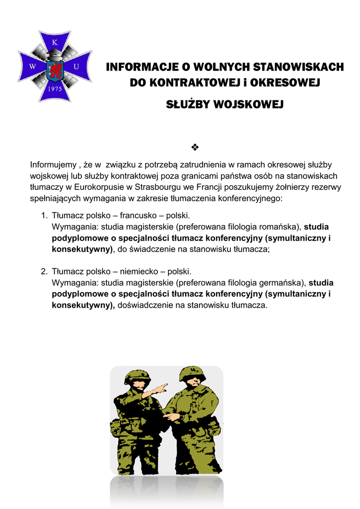 INFORMACJE O WOLNYCH STANOWISKACH DO KONTRAKTOWEJ i OKRESOWEJ SŁUŻBY WOJSKOWEJ Informujemy , że w związku z potrzebą zatrudnienia w ramach okresowej służby wojskowej lub służby kontraktowej poza granicami państwa osób na stanowiskach tłumaczy w Eurokorpusie w Strasbourgu we Francji poszukujemy żołnierzy rezerwy spełniających wymagania w zakresie tłumaczenia konferencyjnego: 1. Tłumacz polsko – francusko – polski. Wymagania: studia magisterskie (preferowana filologia romańska), studia podyplomowe o specjalności tłumacz konferencyjny (symultaniczny i konsekutywny), do świadczenie na stanowisku tłumacza; 2. Tłumacz polsko – niemiecko – polski. Wymagania: studia magisterskie (preferowana filologia germańska), studia podyplomowe o specjalności tłumacz konferencyjny (symultaniczny i konsekutywny), doświadczenie na stanowisku tłumacza.