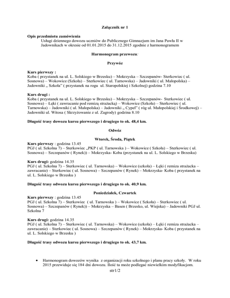 Załącznik nr 1 Opis przedmiotu zamówienia Usługi dziennego dowozu uczniów do Publicznego Gimnazjum im Jana Pawła II w Jadownikach w okresie od 01.01.2015 do 31.12.2015 zgodnie z harmonogramem Harmonogram przewozu: Przywóz Kurs pierwszy : Koba ( przystanek na ul. L. Solskiego w Brzesku) – Mokrzyska – Szczepanów- Sterkowiec ( ul. Sosnowa) – Wokowice (Szkoła) – Sterkowiec ( ul. Tarnowska) – Jadowniki ( ul. Małopolska) – Jadowniki „ Szkoła” ( przystanek na rogu ul. Staropolskiej i Szkolnej) godzina 7.10 Kurs drugi : Koba ( przystanek na ul. L. Solskiego w Brzesku) – Mokrzyska – Szczepanów- Sterkowiec ( ul. Sosnowa) – Łęki ( zawracanie pod remizą strażacką) – Wokowice (Szkoła) – Sterkowiec ( ul. Tarnowska) – Jadowniki ( ul. Małopolska) – Jadowniki „ Cypel” ( róg ul. Małopolskiej i Środkowej) – Jadowniki ul. Witosa ( Skrzyżowanie z ul. Zagrody) godzina 8.10 Długość trasy dowozu kursu pierwszego i drugiego to ok. 48,4 km. Odwóz Wtorek, Środa, Piątek Kurs pierwszy : godzina 13.45 PGJ ( ul. Szkolna 7) – Sterkowiec „PKP ( ul. Tarnowska ) – Wokowice ( Szkoła) – Sterkowiec ( ul. Sosnowa) – Szczepanów ( Rynek)) – Mokrzyska- Koba (przystanek na ul. L. Solskiego w Brzesku) Kurs drugi: godzina 14.35 PGJ ( ul. Szkolna 7) – Sterkowiec ( ul. Tarnowska) – Wokowice (szkoła) – Łęki ( remiza strażacka – zawracanie) – Sterkowiec ( ul. Sosnowa) – Szczepanów ( Rynek) – Mokrzyska- Koba ( przystanek na ul. L. Solskiego w Brzesku ) Długość trasy odwozu kursu pierwszego i drugiego to ok. 40,9 km. Poniedziałek, Czwartek Kurs pierwszy : godzina 13.45 PGJ ( ul. Szkolna 7) – Sterkowiec ( ul. Tarnowska ) – Wokowice ( Szkoła) – Sterkowiec ( ul. Sosnowa) – Szczepanów ( Rynek)) – Mokrzyska – Basen ( Brzesko, ul. Wiejska) – Jadowniki PGJ ul. Szkolna 7 Kurs drugi: godzina 14.35 PGJ ( ul. Szkolna 7) – Sterkowiec ( ul. Tarnowska) – Wokowice (szkoła) – Łęki ( remiza strażacka – zawracanie) – Sterkowiec ( ul. Sosnowa) – Szczepanów ( Rynek) – Mokrzyska- Koba ( przystanek na ul. L. Solskiego w Brzesku ) Długość trasy odwozu kursu pierwszego i drugiego to ok. 43,7 km. Harmonogram dowozów wynika z organizacji roku szkolnego i planu pracy szkoły. W roku 2015 przewiduje się 184 dni dowozu. Ilość ta może podlegać niewielkim modyfikacjom. str1/2 W przypadku awarii któregokolwiek z autobusów Przewoźnik zapewnia autobus zastępczy. Przewoźnik zapewnia każdorazowo autobus przystosowany do przewozu minimum 86 osób. Płatności za w/w usługi będą dokonywane przez Zamawiającego przelewem w terminie 14 dni od daty otrzymania faktury VAT. Przewoźnik zobowiązuje się do sporządzania wykazu ilości wykonanych dowozów. Wykaz ten powinien stanowić integralną część faktury i być podpisany przez osobę upoważnioną. str2/2