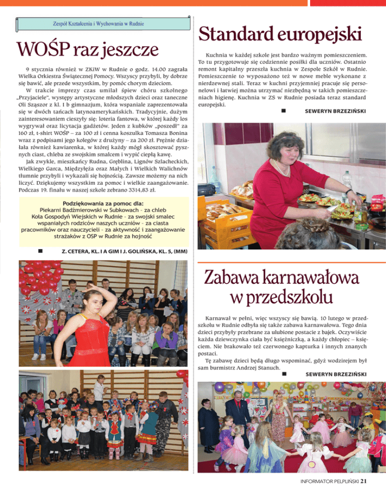WOŚP raz jeszcze 9 stycznia również w ZKiW w Rudnie o godz. 14.00 zagrała Wielka Orkiestra Świątecznej Pomocy. Wszyscy przybyli, by dobrze się bawić, ale przede wszystkim, by pomóc chorym dzieciom. W trakcie imprezy czas umilał śpiew chóru szkolnego „Przyjaciele”, występy artystyczne młodszych dzieci oraz taneczne Oli Sząszor z kl. I b gimnazjum, która wspaniale zaprezentowała się w dwóch tańcach latynoamerykańskich. Tradycyjnie, dużym zainteresowaniem cieszyły się: loteria fantowa, w której każdy los wygrywał oraz licytacja gadżetów. Jeden z kubków „poszedł” za 160 zł, t-shirt WOŚP – za 100 zł i cenna koszulka Tomasza Bonina wraz z podpisami jego kolegów z drużyny – za 200 zł. Prężnie działała również kawiarenka, w której każdy mógł skosztować pysznych ciast, chleba ze swojskim smalcem i wypić ciepłą kawę. Jak zwykle, mieszkańcy Rudna, Gręblina, Lignów Szlacheckich, Wielkiego Garca, Międzyłęża oraz Małych i Wielkich Walichnów tłumnie przybyli i wykazali się hojnością. Zawsze możemy na nich liczyć. Dziękujemy wszystkim za pomoc i wielkie zaangażowanie. Podczas 19. finału w naszej szkole zebrano 3314,83 zł. Standard europejski Kuchnia w każdej szkole jest bardzo ważnym pomieszczeniem. To tu przygotowuje się codziennie posiłki dla uczniów. Ostatnio remont kapitalny przeszła kuchnia w Zespole Szkół w Rudnie. Pomieszczenie to wyposażono też w nowe meble wykonane z nierdzewnej stali. Teraz w kuchni przyjemniej pracuje się personelowi i łatwiej można utrzymać niezbędną w takich pomieszczeniach higienę. Kuchnia w ZS w Rudnie posiada teraz standard europejski. Seweryn BrzezińSki Podziękowania za pomoc dla: Piekarni Badźmierowski w Subkowach – za chleb Koła Gospodyń Wiejskich w Rudnie – za swojski smalec wspaniałych rodziców naszych uczniów – za ciasta pracowników oraz nauczycieli – za aktywność i zaangażowanie strażaków z OSP w Rudnie za hojność z. cetera, kl. i a giM i J. golińSka, kl. 5, (MM) Zabawa karnawałowa w przedszkolu Karnawał w pełni, więc wszyscy się bawią. 10 lutego w przedszkolu w Rudnie odbyła się także zabawa karnawałowa. Tego dnia dzieci przybyły przebrane za ulubione postacie z bajek. Oczywiście każda dziewczynka ciała być księżniczką, a każdy chłopiec – księciem. Nie brakowało też czerwonego kapturka i innych znanych postaci. Tę zabawę dzieci będą długo wspominać, gdyż wodzirejem był sam burmistrz Andrzej Stanuch. Seweryn BrzezińSki INFORMATOR PELPLIŃSKI 21