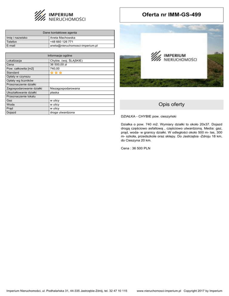 Oferta nr IMM-GS-499 Dane kontaktowe agenta Imię i nazwisko Telefon E-mail Aneta Machowska +48 660 126 771 [email protected] Informacje ogólne Lokalizacja Cena Pow. całkowita [m2] Standard Opłaty w czynszu Opłaty wg liczników Przeznaczenie działki Zagospodarowanie działki Ukształtowanie działki Przeznaczenie lokalu Gaz Woda Prąd Dojazd Chybie, (woj. ŚLĄSKIE) 36 500,00 zł 740,00 Niezagospodarowana płaska w ulicy w ulicy w ulicy droga utwardzona Opis oferty DZIAŁKA - CHYBIE pow. cieszyński Działka o pow. 740 m2. Wymiary działki to około 20x37. Dojazd drogą częściowo asfaltową , częściowo utwardzoną. Media: gaz, prąd, woda- w granicy działki. W odległości około 500 m- las, 300 m- szkoła, przedszkole oraz sklepy. Do Jastrzębia -Zdroju 18 km, do Cieszyna 20 km. Cena : 36 500 PLN Imperium Nieruchomości, ul. Podhalańska 31, 44-335 Jastrzębie-Zdrój, tel. 32 47 10 115 www.nieruchomosci-imperium.pl Copyright 2017 by Imperium