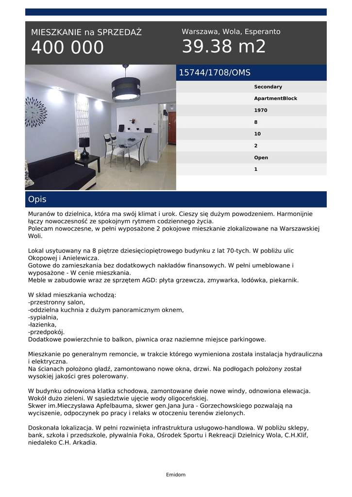 MIESZKANIE na SPRZEDAŻ 400 000 Warszawa, Wola, Esperanto 39.38 m2 15744/1708/OMS Secondary ApartmentBlock 1970 8 10 2 Open 1 Opis Muranów to dzielnica, która ma swój klimat i urok. Cieszy się dużym powodzeniem. Harmonijnie łączy nowoczesność ze spokojnym rytmem codziennego życia. Polecam nowoczesne, w pełni wyposażone 2 pokojowe mieszkanie zlokalizowane na Warszawskiej Woli. Lokal usytuowany na 8 piętrze dziesięciopiętrowego budynku z lat 70-tych. W pobliżu ulic Okopowej i Anielewicza. Gotowe do zamieszkania bez dodatkowych nakładów finansowych. W pełni umeblowane i wyposażone - W cenie mieszkania. Meble w zabudowie wraz ze sprzętem AGD: płyta grzewcza, zmywarka, lodówka, piekarnik. W skład mieszkania wchodzą: -przestronny salon, -oddzielna kuchnia z dużym panoramicznym oknem, -sypialnia, -łazienka, -przedpokój. Dodatkowe powierzchnie to balkon, piwnica oraz naziemne miejsce parkingowe. Mieszkanie po generalnym remoncie, w trakcie którego wymieniona została instalacja hydrauliczna i elektryczna. Na ścianach położono gładź, zamontowano nowe okna, drzwi. Na podłogach położony został wysokiej jakości gres polerowany. W budynku odnowiona klatka schodowa, zamontowane dwie nowe windy, odnowiona elewacja. Wokół dużo zieleni. W sąsiedztwie ujęcie wody oligoceńskiej. Skwer im.Mieczysława Apfelbauma, skwer gen.Jana Jura - Gorzechowskiego pozwalają na wyciszenie, odpoczynek po pracy i relaks w otoczeniu terenów zielonych. Doskonała lokalizacja. W pełni rozwinięta infrastruktura usługowo-handlowa. W pobliżu sklepy, bank, szkoła i przedszkole, pływalnia Foka, Ośrodek Sportu i Rekreacji Dzielnicy Wola, C.H.Klif, niedaleko C.H. Arkadia. Emidom Blisko centrum miasta. Miejsce dobrze skomunikowanie z innymi dzielnicami Warszawy, liczne przystanki autobusowe i tramwajowe. Polecam. Osoby zainteresowane zapraszam na prezentacje mieszkania. Treść niniejszego ogłoszenia nie stanowi oferty handlowej w rozumieniu Kodeksu Cywilnego. Anna Misiejuk tel. 513 139 199 tel. 22 566 30 40 email: [email protected] Emidom Powered by TCPDF (www.tcpdf.org)