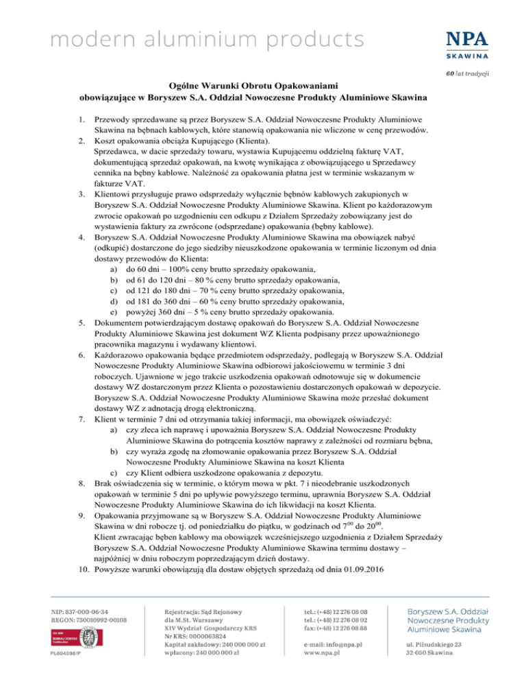 Ogólne Warunki Obrotu Opakowaniami obowiązujące w Boryszew S.A. Oddział Nowoczesne Produkty Aluminiowe Skawina 1. 2. 3. 4. 5. 6. 7. 8. 9. 10. Przewody sprzedawane są przez Boryszew S.A. Oddział Nowoczesne Produkty Aluminiowe Skawina na bębnach kablowych, które stanowią opakowania nie wliczone w cenę przewodów. Koszt opakowania obciąża Kupującego (Klienta). Sprzedawca, w dacie sprzedaży towaru, wystawia Kupującemu oddzielną fakturę VAT, dokumentującą sprzedaż opakowań, na kwotę wynikająca z obowiązującego u Sprzedawcy cennika na bębny kablowe. Należność za opakowania płatna jest w terminie wskazanym w fakturze VAT. Klientowi przysługuje prawo odsprzedaży wyłącznie bębnów kablowych zakupionych w Boryszew S.A. Oddział Nowoczesne Produkty Aluminiowe Skawina. Klient po każdorazowym zwrocie opakowań po uzgodnieniu cen odkupu z Działem Sprzedaży zobowiązany jest do wystawienia faktury za zwrócone (odsprzedane) opakowania (bębny kablowe). Boryszew S.A. Oddział Nowoczesne Produkty Aluminiowe Skawina ma obowiązek nabyć (odkupić) dostarczone do jego siedziby nieuszkodzone opakowania w terminie liczonym od dnia dostawy przewodów do Klienta: a) do 60 dni – 100% ceny brutto sprzedaży opakowania, b) od 61 do 120 dni – 80 % ceny brutto sprzedaży opakowania, c) od 121 do 180 dni – 70 % ceny brutto sprzedaży opakowania, d) od 181 do 360 dni – 60 % ceny brutto sprzedaży opakowania, e) powyżej 360 dni – 5 % ceny brutto sprzedaży opakowania. Dokumentem potwierdzającym dostawę opakowań do Boryszew S.A. Oddział Nowoczesne Produkty Aluminiowe Skawina jest dokument WZ Klienta podpisany przez upoważnionego pracownika magazynu i wydawany klientowi. Każdorazowo opakowania będące przedmiotem odsprzedaży, podlegają w Boryszew S.A. Oddział Nowoczesne Produkty Aluminiowe Skawina odbiorowi jakościowemu w terminie 3 dni roboczych. Ujawnione w jego trakcie uszkodzenia opakowań odnotowuje się w dokumencie dostawy WZ dostarczonym przez Klienta o pozostawieniu dostarczonych opakowań w depozycie. Boryszew S.A. Oddział Nowoczesne Produkty Aluminiowe Skawina może przesłać dokument dostawy WZ z adnotacją drogą elektroniczną. Klient w terminie 7 dni od otrzymania takiej informacji, ma obowiązek oświadczyć: a) czy zleca ich naprawę i upoważnia Boryszew S.A. Oddział Nowoczesne Produkty Aluminiowe Skawina do potrącenia kosztów naprawy z zależności od rozmiaru bębna, b) czy wyraża zgodę na złomowanie opakowania przez Boryszew S.A. Oddział Nowoczesne Produkty Aluminiowe Skawina na koszt Klienta c) czy Klient odbiera uszkodzone opakowania z depozytu. Brak oświadczenia się w terminie, o którym mowa w pkt. 7 i nieodebranie uszkodzonych opakowań w terminie 5 dni po upływie powyższego terminu, uprawnia Boryszew S.A. Oddział Nowoczesne Produkty Aluminiowe Skawina do ich likwidacji na koszt Klienta. Opakowania przyjmowane są w Boryszew S.A. Oddział Nowoczesne Produkty Aluminiowe Skawina w dni robocze tj. od poniedziałku do piątku, w godzinach od 7 00 do 2000. Klient zwracając bęben kablowy ma obowiązek wcześniejszego uzgodnienia z Działem Sprzedaży Boryszew S.A. Oddział Nowoczesne Produkty Aluminiowe Skawina terminu dostawy – najpóźniej w dniu roboczym poprzedzającym dzień dostawy. Powyższe warunki obowiązują dla dostaw objętych sprzedażą od dnia 01.09.2016