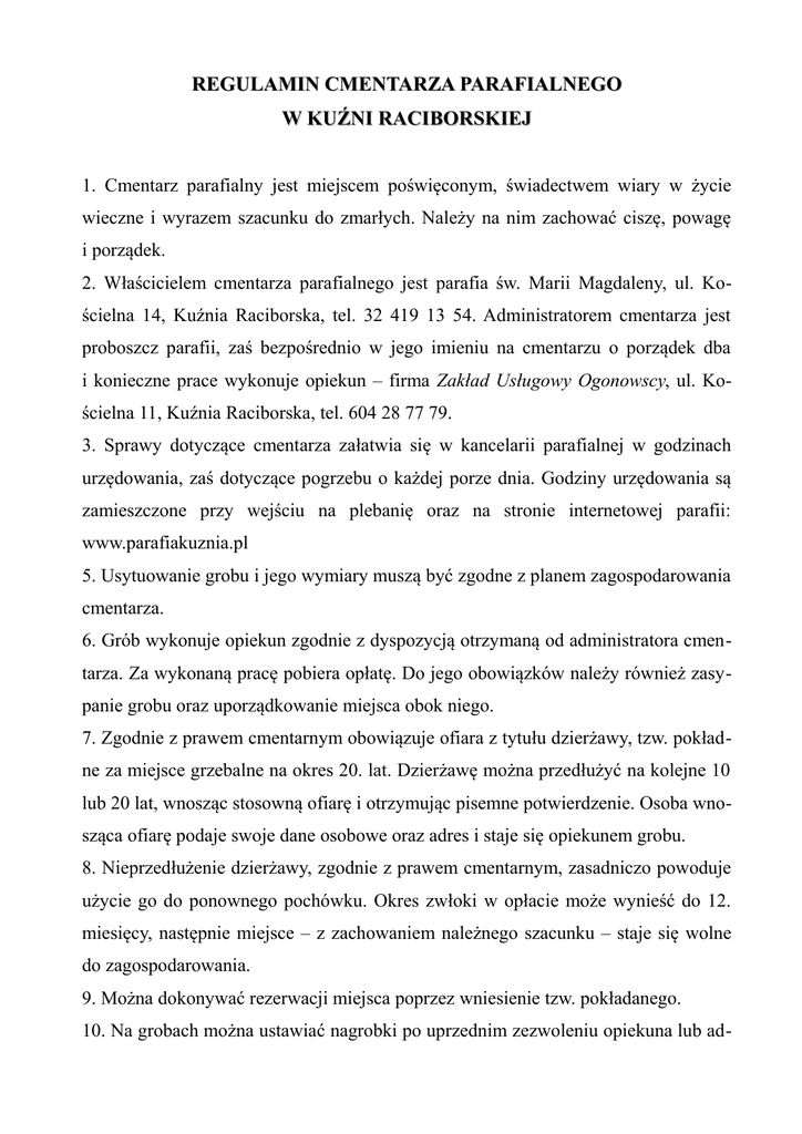 REGULAMIN CMENTARZA PARAFIALNEGO W KUŹNI RACIBORSKIEJ 1. Cmentarz parafialny jest miejscem poświęconym, świadectwem wiary w życie wieczne i wyrazem szacunku do zmarłych. Należy na nim zachować ciszę, powagę i porządek. 2. Właścicielem cmentarza parafialnego jest parafia św. Marii Magdaleny, ul. Kościelna 14, Kuźnia Raciborska, tel. 32 419 13 54. Administratorem cmentarza jest proboszcz parafii, zaś bezpośrednio w jego imieniu na cmentarzu o porządek dba i konieczne prace wykonuje opiekun – firma Zakład Usługowy Ogonowscy, ul. Kościelna 11, Kuźnia Raciborska, tel. 604 28 77 79. 3. Sprawy dotyczące cmentarza załatwia się w kancelarii parafialnej w godzinach urzędowania, zaś dotyczące pogrzebu o każdej porze dnia. Godziny urzędowania są zamieszczone przy wejściu na plebanię oraz na stronie internetowej parafii: www.parafiakuznia.pl 5. Usytuowanie grobu i jego wymiary muszą być zgodne z planem zagospodarowania cmentarza. 6. Grób wykonuje opiekun zgodnie z dyspozycją otrzymaną od administratora cmentarza. Za wykonaną pracę pobiera opłatę. Do jego obowiązków należy również zasypanie grobu oraz uporządkowanie miejsca obok niego. 7. Zgodnie z prawem cmentarnym obowiązuje ofiara z tytułu dzierżawy, tzw. pokładne za miejsce grzebalne na okres 20. lat. Dzierżawę można przedłużyć na kolejne 10 lub 20 lat, wnosząc stosowną ofiarę i otrzymując pisemne potwierdzenie. Osoba wnosząca ofiarę podaje swoje dane osobowe oraz adres i staje się opiekunem grobu. 8. Nieprzedłużenie dzierżawy, zgodnie z prawem cmentarnym, zasadniczo powoduje użycie go do ponownego pochówku. Okres zwłoki w opłacie może wynieść do 12. miesięcy, następnie miejsce – z zachowaniem należnego szacunku – staje się wolne do zagospodarowania. 9. Można dokonywać rezerwacji miejsca poprzez wniesienie tzw. pokładanego. 10. Na grobach można ustawiać nagrobki po uprzednim zezwoleniu opiekuna lub ad- ministratora. Aby uzyskać zgodę, należy przedstawić projekt nagrobka. Projekt ten przygotowuje wykonawca i winien on zawierać wymiary, kształt i napisy pomnika. 11. Kamieniarz ma prawo wykonywać swoje prace posiadając pisemne zezwolenie administratora. Klucz do bramy wjazdowej otrzymuje się u opiekuna lub na plebanii. 12. Prace przy nagrobkach należy tak wykonywać, by nie spowodowały szkód na sąsiednich grobach ani sporów z sąsiednimi użytkownikami. Osoba ustawiająca nagrobek musi bezwzględnie zachować poziom montażu sąsiednich nagrobków (za poziom nagrobka uznaje się poziom fundamentów). W tej materii należy się konsultować z opiekunem cmentarza. Przeprowadzający prace dba też o uprzątnięcie miejsca po ich wykonaniu. 13. Ze względu na estetykę i bezpieczeństwo nie wolno utwardzać terenu (wykładać kostki itd.) wokół grobu. To samo dotyczy budowy ławek, kwietników, sadzenia krzewów i innych elementów ozdobnych umiejscowionych wokół grobu. 14. Rodzina zmarłego lub inni opiekunowie są zobowiązani do utrzymania porządku na grobie zmarłego, w jego otoczeniu, a także na całym cmentarzu. To samo dotyczy miejsc zarezerwowanych, które winny być utrzymane w należytym porządku. 15. Odpady oraz śmieci (tylko cmentarne!) powinny być składowane i segregowane jedynie w wyznaczonym na ten cel miejscu. 16. Stare nagrobki, ziemię oraz gruz, czy też inne elementy z rozbiórki nagrobków i fundamentów powinny być wywożone poza teren cmentarza we własnym zakresie. 17. Ekshumacja zwłok lub szczątków ludzkich jest możliwa w przepisanym prawem czasie, po przedstawieniu administratorowi cmentarza decyzji kompetentnych organów (inspektor sanitarny, prokuratura lub sąd). 18. Zakazuje się: - wjazdu pojazdami mechanicznymi bez zgody administratora - wprowadzania zwierząt - zanieczyszczania cmentarza - samowolnego usuwania oraz sadzenia drzew i krzewów - picia alkoholu, palenia papierosów, słuchania muzyki, hałasowania oraz niestosownego zachowania. 19. Administrator cmentarza nie odpowiada za szkody na grobach powstałe na skutek klęsk żywiołowych, kradzieży i aktów wandalizmu oraz za rzeczy pozostawione bez nadzoru. Zaleca się indywidualne ubezpieczenie kosztownych nagrobków. 20. Likwidowanie grobu należy zgłosić opiekunowi. 21.Obsługą pogrzebu zasadniczo zajmuje się opiekun: Zakład Usługowy Ogonowscy. Istnieje możliwość, by obsługą zajęła się inna firma, ale obowiązuje wtedy dodatkowa opłata: 100 zł – za obsługę kaplicy dla opiekuna i 100 zł dla parafii. Opłatę tę wnosi firma zajmująca się pochówkiem, a nie rodzina zmarłego. Jeżeli obsługą pogrzebu zajmuje się obca firma, wszelkie opłaty należy uiścić przed pogrzebem. 22. Osoby spoza Kościoła Katolickiego, ze względu na brak regularnej troski o cmentarz i systematycznego łożenia na niego, obowiązuje dodatkowa jednorazowa opłata przy pochówku w wysokości 300 zł. 23. Tabliczki informujące o likwidacji grobu są ważne 3 miesiące, po upływie 3. miesięcy grób może zostać zlikwidowany. 23. Cennik usług za grobowce, groby i pochówek urny w grobie ziemnym są dostępne u administratora i opiekuna cmentarza. Regulamin powyższy obowiązuje od 1.01.2014 r.