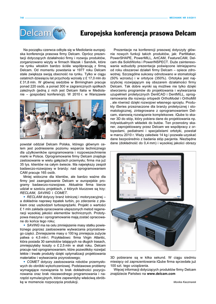 748 MECHANIK NR 8-9/2011 Europejska konferencja prasowa Delcam Na początku czerwca odbyła się w Mediolanie europejska konferencja prasowa firmy Delcam. Oprócz prezentacji dotyczących działalności firmy i rozwoju produktów, zorganizowano wizyty w firmach Mazak i Sandvik, które na rynku włoskim bardzo ściśle współpracują z firmą Delcam. Od momentu powstania w 1977 roku Delcam stale zwiększa swoją obecność na rynku. Tylko w ciągu ostatnich dziesięciu lat przychody wzrosły z £ 17,0 mln do £ 31,8 mln. W głównej siedzibie w Birmingham pracuje ponad 220 osób, a ponad 300 w zagranicznych spółkach zależnych (jedną z nich jest Delcam Italia w Mediolanie – gospodarz konferencji). W 2010 r. w Warszawie powstał oddział Delcam Polska, którego głównym celem jest podniesienie poziomu wsparcia technicznego dla użytkowników oprogramowania i rozpowszechnienie marki w Polsce. Oprogramowanie firmy Delcam znajduje zastosowanie w wielu gałęziach przemysłu; firma ma już 35 tys. klientów na całym świecie. Ma największy zespół badawczo-rozwojowy w branży: nad oprogramowaniem CAM pracuje 165 osób. Mniej widoczne dla klientów, ale bardzo ważne dla firmy jest zaangażowanie Delcam w europejskie programy badawczo-rozwojowe. Aktualnie firma bierze udział w sześciu projektach, z których kluczowe są trzy: RECLAIM, SAVING i COMET. RECLAIM dotyczy branż lotniczej i motoryzacyjnej – a dokładnie naprawy łopatek turbin, po zderzenie z ptakiem oraz uszkodzeń turbosprężarki. Projekt o wartości £ 1 mln zakłada opracowanie ulepszonych metod regeneracji wysokiej jakości elementów technicznych. Prototypowa maszyna i oprogramowanie mają zostać opracowane do końca tego roku; SAVING ma na celu zmniejszenie masy statku powietrznego poprzez zastosowanie wytwarzania przyrostowego części. Zmniejszenie masy o 100 kg zmniejsza zużycie paliwa o 4,5 mln l. Przykładowo: firma Virgin Atlantic, która posiada 30 samolotów latających na długich trasach, zmniejszyłaby koszty o £ 2,5 mln w skali roku. Delcam pracuje nad oprogramowaniem, które pozwoliłoby rozwijać lekkie i trwałe produkty dzięki optymalizacji projektowania materiałów i wytwarzania przyrostowego; COMET dotyczy zastosowania robotów przemysłowych do obróbki wykończeniowej. Podstawowe problemy wymagające rozwiązania to brak dokładności pozycjonowania oraz brak niezawodnego programowania i narzędzi symulacyjnych, które zapewniłyby właściwą obróbkę w momencie rozpoczęcia produkcji. Prezentacje na konferencji prasowej dotyczyły głównie nowych funkcji takich produktów, jak: PartMaker, PowerSHAPE, PowerMILL, ArtCAM, FeatureCAM, Delcam dla SolidWorks i PowerINSPECT. Duże zainteresowanie wzbudziły prezentacje poświęcone istniejącemu od roku obszarowi działań firmy Delcam – opiece zdrowotnej. Szczególne sukcesy odnotowano w stomatologii (50% wzrostu) i w ortotyce (350%). Ortotyka jest najszybciej rozwijającym się obszarem działalności firmy Delcam. Tak dobre wyniki są możliwe nie tylko dzięki stworzeniu programów do projektowania i wytwarzania uzupełnień protetycznych DentCAD i DentMILL, oprogramowania dla rozwoju ortopedii OrthoModel i OrthoMill , ale również dzięki rozwojowi własnego sprzętu. Produkty iSeries przeznaczone dla branży protetycznej i stomatologicznej, zintegrowane z oprogramowaniem Delcam, stanowią rozwiązanie kompleksowe. iQube to skaner 3D do stóp, który pobiera dane do projektowania np. indywidualnych wkładek do butów. Ten przenośny skaner, zaprojektowany przez Delcam we współpracy z ortopedami, pediatrami i specjalistami ortotyki, powstał w marcu 2010 r. Waży zaledwie 14 kg i pozwala uzyskać dane bezpośrednio z badania stóp pacjenta. Niezbędne dane (dokładność do 0,4 mm) i wysokiej jakości obrazy 3D pobierane są w kilka sekund. W ciągu siedmiu miesięcy od zaprezentowania iQube firma sprzedała już 100 szt. tego urządzenia. Więcej informacji dotyczących produktów firmy Delcam znajdziecie Państwo na www.delcam.com Monika Kaczmarek