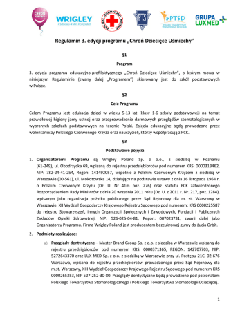Regulamin 3. edycji programu „Chroń Dziecięce Uśmiechy” §1 Program 3. edycja programu edukacyjno-profilaktycznego „Chroń Dziecięce Uśmiechy”, o którym mowa w niniejszym Regulaminie (zwany dalej „Programem”) skierowany jest do szkół podstawowych w Polsce. §2 Cele Programu Celem Programu jest edukacja dzieci w wieku 5-13 lat (klasy 1-6 szkoły podstawowej) na temat prawidłowej higieny jamy ustnej oraz przeprowadzenie darmowych przeglądów stomatologicznych w wybranych szkołach podstawowych na terenie Polski. Zajęcia edukacyjne będą prowadzone przez wolontariuszy Polskiego Czerwonego Krzyża oraz nauczycieli, którzy współpracują z PCK. §3 Podstawowe pojęcia 1. Organizatorami Programu są Wrigley Poland Sp. z o.o., z siedzibą w Poznaniu (61-249), ul. Obodrzycka 69, wpisaną do rejestru przedsiębiorców pod numerem KRS: 0000313462, NIP: 782-24-41-254, Regon: 141492057, wspólnie z Polskim Czerwonym Krzyżem z siedzibą w Warszawie (00-561), ul. Mokotowska 14, działający na podstawie ustawy z dnia 16 listopada 1964 r. o Polskim Czerwonym Krzyżu (Dz. U. Nr 41m poz. 276) oraz Statutu PCK zatwierdzonego Rozporządzeniem Rady Ministrów z dnia 20 września 2011 roku (Dz. U. z 2011 r. Nr. 217, poz. 1284), wpisanym jako organizacja pożytku publicznego przez Sąd Rejonowy dla m. st. Warszawy w Warszawie, XII Wydział Gospodarczy Krajowego Rejestru Sądowego pod numerem: KRS 0000225587 do rejestru Stowarzyszeń, Innych Organizacji Społecznych i Zawodowych, Fundacji i Publicznych Zakładów Opieki Zdrowotnej, NIP: 526-025-04-81, Regon: 007023731, zwani dalej jako Organizatorzy Programu. Firma Wrigley Poland jest producentem bezcukrowej gumy do żucia Orbit. 2. Podmioty realizujące: a) Przeglądy dentystyczne – Master Brand Group Sp. z o.o. z siedzibą w Warszawie wpisaną do rejestru przedsiębiorców pod numerem KRS: 0000371365, REGON: 142707703, NIP: 5272643370 oraz LUX MED Sp. z o.o. z siedzibą w Warszawie przy ul. Postępu 21C, 02-676 Warszawa, wpisana do rejestru przedsiębiorców prowadzonego przez Sąd Rejonowy dla m.st. Warszawy, XIII Wydział Gospodarczy Krajowego Rejestru Sądowego pod numerem KRS 0000265353, NIP 527-252-30-80. Przeglądy dentystyczne będą prowadzone pod patronatem Polskiego Towarzystwa Stomatologicznego i Polskiego Towarzystwa Stomatologii Dziecięcej. 1 3. Partnerami Programu są Polskie Towarzystwo Stomatologiczne z siedzibą w Krakowie (31-155), ul. Montelupich 4, NIP: 522-00-16-336, KRS: 0000111016 oraz Polskie Towarzystwo Stomatologii Dziecięcej z siedzibą w Krakowie (31-155), ul. Montelupich 4, NIP: 676-24-76-879, KRS: 0000510025. 4. Uczestnik Programu – uczestnikiem Programu może być wyłącznie szkoła podstawowa (opcjonalnie: szkoła podstawowa publiczna), która zostanie wskazana wybrana przez Organizatorów Programu. 5. Beneficjent Programu - beneficjentem Programu jest osoba w wieku 5-13 lat (klasy 1-6 szkoły podstawowej), która jest uczniem szkoły podstawowej. §4 Warunki uczestnictwa oraz realizacji Programu 1. Program będzie trwać od 7 września 2015 r. do 24 czerwca 2016 r. 2. Ramowy harmonogram Programu: a) 7 września 2015 r. – start Programu, w tym lekcji edukacyjnych oraz przeglądów dentystycznych. b) 13 listopada 2015 r. – zakończenie przeglądów stomatologicznych. c) 24 czerwca 2016 r. – zakończenie zajęć edukacyjnych. 3. Przeglądy stomatologiczne w ramach Programu będą realizowane na terenie 6 województw: dolnośląskiego, kujawsko-pomorskiego, lubuskiego, małopolskiego, śląskiego i wielkopolskiego. 4. Akcja promocyjna w sklepach, dzięki której będą zbierane środki na przeprowadzenie Programu, będzie trwała od 1 września 2015 r. do 31 października 2015 r. Na potrzeby wsparcia Programu zostanie przeznaczony 1% wartości ze sprzedaży gum do żucia Orbit®, niezależnie od ich rodzaju, smaku, rozmiaru opakowania czy miejsca ich zakupu (w tym również gumy Orbit® zakupione przez sklep internetowy www.jedz-pij-zuj.pl). W ramach oferty specjalnej w sieciach sklepów Piotr i Paweł, Polo Market, Topaz oraz SPAR na potrzeby wsparcia Programu zostanie przeznaczone 2% wartości ze sprzedaży dowolnych opakowań gum do żucia Orbit® w analogicznym okresie, czyli od 1 września 2015 r. do 31 października 2015 r. Informacje o promocjach można znaleźć u partnerów handlowych Wrigley Poland. 5. Przystąpienie do Programu jest równoznaczne z akceptacją przez Uczestnika Programu regulaminu inicjatywy „Chroń Dziecięce Uśmiechy”. Uczestnik zobowiązuje się do przestrzegania określonych zasad w tym regulaminie, jak również potwierdza, iż spełnia warunki, które uprawniają go do udziału w Programie. 6. Ostateczna kwalifikacja Uczestnika do Programu podejmowana jest przez Organizatorów Programu. 2 7. Uczestnik zakwalifikowany do Programu zostanie poinformowany o tym fakcie drogą elektroniczną lub telefoniczną. 8. Organizator nie jest zobowiązany do uzasadnienia decyzji, z jakiego powodu niektóre szkoły podstawowe nie zakwalifikowały się do Programu. 9. Uczestnik Programu wyraża zgodę na przesyłanie mu za pomocą środków komunikacji elektronicznej, w szczególności poczty elektronicznej, informacji i korespondencji dotyczącej Programu. 10. Warunkiem przeprowadzenia przeglądu u Beneficjenta jest jego punktualne przybycie na miejsce przeglądu (zgodnie z ustalonym wcześniej harmonogramem). 11. Uczestnik Programu zobowiązuje się do zapewnienia sali lekcyjnej oraz wspólnego ustalenia harmonogramu zajęć edukacyjnych prowadzonych przez nauczycieli i wolontariuszy PCK w ramach Programu. 12. Materiały edukacyjne przekazane Uczestnikowi nie mogą być zmieniane, modyfikowane i są chronione prawem autorskim. Materiały nie mogą być przeznaczone do użytku komercyjnego. 13. Udział Uczestników i Beneficjentów w Programie oraz materiały edukacyjne są bezpłatne. 14. Uczestnikom Programu nie przysługuje jakiekolwiek wynagrodzenie za użyczenie p