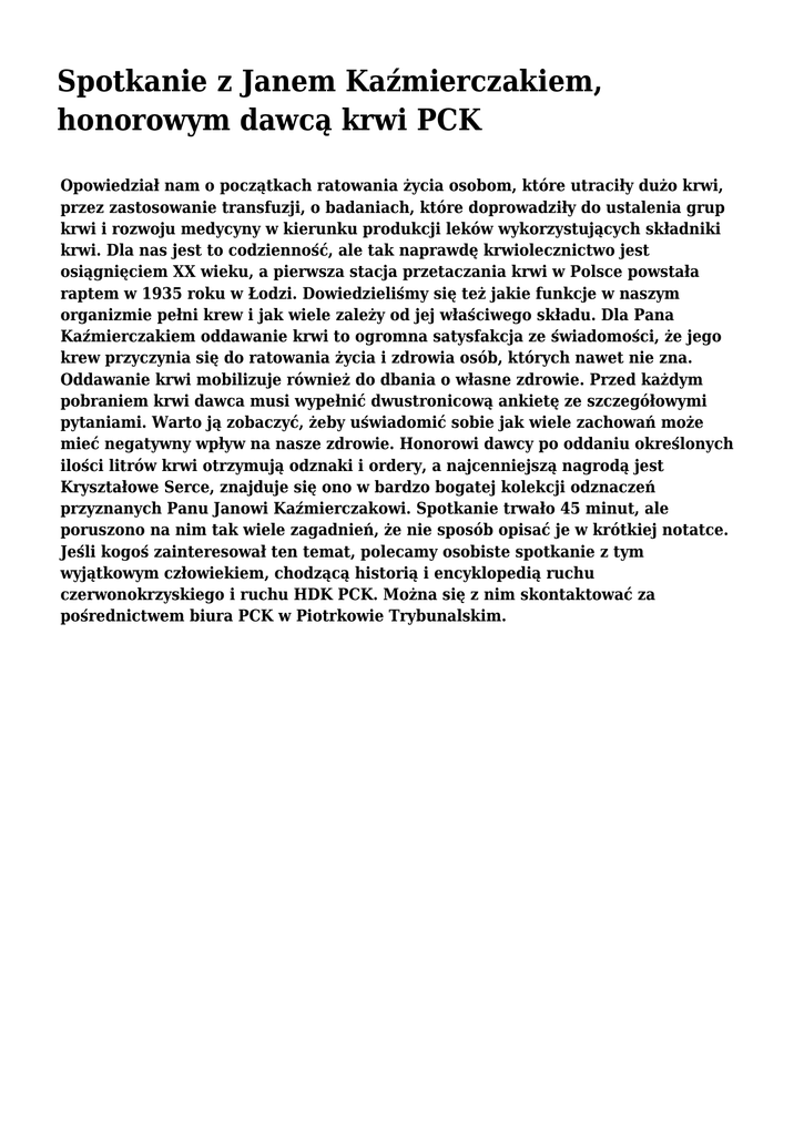 Spotkanie z Janem Kaźmierczakiem, honorowym dawcą krwi PCK Opowiedział nam o początkach ratowania życia osobom, które utraciły dużo krwi, przez zastosowanie transfuzji, o badaniach, które doprowadziły do ustalenia grup krwi i rozwoju medycyny w kierunku produkcji leków wykorzystujących składniki krwi. Dla nas jest to codzienność, ale tak naprawdę krwiolecznictwo jest osiągnięciem XX wieku, a pierwsza stacja przetaczania krwi w Polsce powstała raptem w 1935 roku w Łodzi. Dowiedzieliśmy się też jakie funkcje w naszym organizmie pełni krew i jak wiele zależy od jej właściwego składu. Dla Pana Kaźmierczakiem oddawanie krwi to ogromna satysfakcja ze świadomości, że jego krew przyczynia się do ratowania życia i zdrowia osób, których nawet nie zna. Oddawanie krwi mobilizuje również do dbania o własne zdrowie. Przed każdym pobraniem krwi dawca musi wypełnić dwustronicową ankietę ze szczegółowymi pytaniami. Warto ją zobaczyć, żeby uświadomić sobie jak wiele zachowań może mieć negatywny wpływ na nasze zdrowie. Honorowi dawcy po oddaniu określonych ilości litrów krwi otrzymują odznaki i ordery, a najcenniejszą nagrodą jest Kryształowe Serce, znajduje się ono w bardzo bogatej kolekcji odznaczeń przyznanych Panu Janowi Kaźmierczakowi. Spotkanie trwało 45 minut, ale poruszono na nim tak wiele zagadnień, że nie sposób opisać je w krótkiej notatce. Jeśli kogoś zainteresował ten temat, polecamy osobiste spotkanie z tym wyjątkowym człowiekiem, chodzącą historią i encyklopedią ruchu czerwonokrzyskiego i ruchu HDK PCK. Można się z nim skontaktować za pośrednictwem biura PCK w Piotrkowie Trybunalskim.