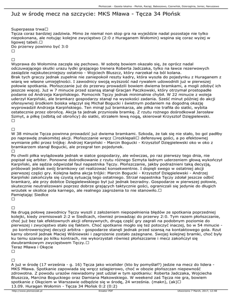 Płońszczak - Gazeta lokalna - Płońsk, Raciąż, Baboszewo, Czerwińsk, Dzierzążnia, Joniec, Naruszewo Już w środę mecz na szczycie: MKS Mława - Tęcza 34 Płońsk Superpassa trwa Tęcza coraz bardziej zadziwia. Mimo że niemal non stop gra na wyjeździe nadal pozostaje nie tylko niepokonana, ale notując kolejne zwycięstwo (2:0 z Huraganem Wołomin) wspina się coraz wyżej w ligowej tabeli. Do przerwy powinno być 3:0 Wyprawa do Wołomina zaczęła się pechowo. W sobotę bowiem okazało się, że oprócz nadal odczuwającego skutki urazu łydki grającego trenera Roberta Jadczaka, tylko na ławce rezerwowych zasiądzie najskuteczniejszy ostatnio - Wojciech Bluszcz, który narzekał na ból kolana. Brak tych graczy jednak zupełnie nie zaniepokoił reszty kadry, która wyszła do pojedynku z Huraganem z wiarą we własne umiejętności. I zawodnicy swoją wyższość nad rywalem udowodnili już w pierwszej połowie spotkania. Płońszczanie już do przerwy prowadzili bowiem dwiema bramkami, a mogli zdobyć ich jeszcze więcej. Już w 7 minucie przed szansą stanął Gracjan Paczkowski, który otrzymał prostopadłe podanie od Andrzeja Karpińskiego. Pomocnik Tęczy jednak minimalnie chybił. W 22 minucie z woleja uderzył Karpiński, ale bramkarz gospodarzy stanął na wysokości zadania. Sześć minut później do akcji ofensywnej środkiem boiska włączył się Michał Bogucki i świetnym podaniem na dogodną okazję wyprowadził Andrzeja Karpińskiego. Ten minął już bramkarza, ale piłka nie trafiła do siatki, wybita ostatecznie przez obrońcę. Akcja ta jednak przyniosła bramkę. Z rzutu rożnego dośrodkował Jarosław Szmyt, a piłkę (odbitą od obrońcy) do siatki, strzałem lewą nogą, skierował Krzysztof Dzięgielewski. W 38 minucie Tęcza powinna prowadzić już dwiema bramkami. Szkoda, że tak się nie stało, bo gol padłby po naprawdę znakomitej akcji. Płońszczanie wręcz rozklepali defensywę gości, a po efektownej wymianie piłki przez trójkę: Andrzej Karpiński - Marcin Bogucki - Krzysztof Dzięgielewski oko w oko z bramkarzem stanął Bogucki, ale przegrał ten pojedynek. Po chwili piłka wylądowała jednak w siatce gospodarzy, ale wówczas, po raz pierwszy tego dnia, nie popisał się arbiter. Ponowne dośrodkowanie z rzutu różnego Szmyta ładnym uderzeniem głową wykończył Karpiński, ale sędzia odgwizdał faul napastnika Tęczy. Płońszczanie, jakby podrażnieni taką decyzją, próbowali jednak swój bramkowy cel realizować konsekwentnie. I dopięli swego w ostatniej akcji pierwszej części gry. Kolejna ładna akcja trójki: Marcin Bogucki - Krzysztof Dzięgielewski - Andrzej Karpiński zakończyła się czystą sytuacją tego ostatniego. Strzał napastnika Tęczy zdołał jeszcze odbić bramkarz, ale przy dobitce Dzięgielewskiego był już jednak bezradny. Gospodarze w pierwszej połowie, skutecznie neutralizowani poprzez dobrze grających taktycznie gości, ograniczali się jedynie do długich wrzutek w okolice pola karnego, ale realnego zagrożenia to nie stanowiło. Pamiętając Siedlce Na drugą połowę zawodnicy Tęczy wyszli z założeniem niepopełnienia błędów ze spotkania poprzedniej kolejki, kiedy zremisowali 2:2 w Siedlcach, również prowadząc do przerwy 2:0. Tym razem płońszczanie, choć już bez tak efektownych akcji ofensywnych, drugą część gry zagrali na podobnym poziomie do pierwszej i zwycięstwo stało się faktem. Choć spotkanie mogło się też potoczyć inaczej, bo w 54 minucie po kontrowersyjnej decyzji arbitra - gospodarze stanęli jednak przed szansą na kontaktowego gola. Rzut karny obronił jednak Maciej Wiśniewski i zagrożenie zostało zażegnane. Swojej kolejnej bramki, choć były ku temu szanse po kilku kontrach, nie wykorzystali również płońszczanie i mecz zakończył się dwubramkowym zwycięstwem Tęczy. Teraz Mława i Okęcie A już w środę (17 września - g. 16) Tęcza jako wicelider (kto by pomyślał?) jedzie na mecz do lidera MKS Mława. Spotkanie zapowiada się wręcz szlagierowo, choć w obozie płońszczan niepewność zdrowotna. Z powodu urazów niewiadomy jest udział w tym spotkaniu: Roberta Jadczaka, Wojciecha Bluszcza, Marcina Boguckiego oraz Damiana Makowskiego. W weekend zaś Tęcza nie gra, bowiem spotkanie z Okęciem w Warszawie odbędzie się w środę, 24 września. (makn), (ak) 13.09. Huragan Wołomin - Tęcza 34 Płońsk 0:2 (0:2) http://www.plonszczak.pl Kreator PDF Utworzono 7 March, 2017, 12:48 Płońszczak - Gazeta lokalna - Płońsk, Raciąż, Baboszewo, Czerwińsk, Dzierzążnia, Joniec, Naruszewo bramki: Dzięgielewski (29, asysta Szmyt), Dzięgielewski (45, asysta Karpiński). Tęcza: Maciej Wiśniewski - Radosław Jankowski, Sławomir Daniszewski, Michał Bogucki, Damian Makowski, Gracjan Paczkowski (82, Szymon Piekarzewski), Jarosław Szmyt, Marcin Bogucki (86, Hubert Wierzchowski), Łukasz Barankiewicz (70, Hubert Lewandowski), Andrzej Karpiński, Krzysztof Dzięgielewski. Wyniki VII kolejki (13-14 września): * Podlasie Sokołów Podlaski - Naprzód Zielonki 2:0 * MKS Ciechanów - Korona Ostrołęka 1:2 * Przyszłość Włochy Warszawa - MKS Przasnysz 1:0 * Mazur Radzymin - Okęcie Warszawa 0:1 * Kormoran Łąck - MKS Mława 2:3 * Huragan Wołomin - Tęcza 34 Płońsk 0:2 * Polonia II Warszawa - Kryształ Glinojeck 1:2 * Victoria Sulejówek - Hutnik Warszawa 3:0. W VIII kolejce (środa, 17 września) zagrają: * Naprzód Zielonki - Hutnik Warszawa * Kryształ Glinojeck Victoria Sulejówek * Pogoń Siedlce - Polonia II Warszawa * MKS Mława - Tęcza 34 Płońsk (Mława, 17.09., g. 16) * Okęcie Warszawa - Kormoran Łąck * MKS Przasnysz - Mazur Radzymin * Korona Ostrołęka - Przyszłość Włochy Warszawa * Podlasie Sokołów Podlaski - MKS Ciechanów. Pauza: Huragan Wołomin. W IX kolejce (sob.-niedz. 20-21 września) zagrają: * MKS Ciechanów - Naprzód Zielonki * Przyszłość Włochy Warszawa - Podlasie Sokołów Podlaski * Mazur Radzymin
