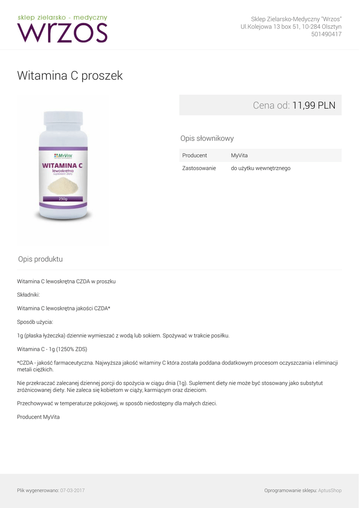 Sklep Zielarsko-Medyczny "Wrzos" Ul.Kolejowa 13 box 51, 10-284 Olsztyn 501490417 Witamina C proszek Cena od: 11,99 PLN Opis słownikowy Producent MyVita Zastosowanie do użytku wewnętrznego Opis produktu Witamina C lewoskrętna CZDA w proszku Składniki: Witamina C lewoskrętna jakości CZDA* Sposób użycia: 1g (płaska łyżeczka) dziennie wymieszać z wodą lub sokiem. Spożywać w trakcie posiłku. Witamina C - 1g (1250% ZDS) *CZDA - jakość farmaceutyczna. Najwyższa jakość witaminy C która została poddana dodatkowym procesom oczyszczania i eliminacji metali ciężkich. Nie przekraczać zalecanej dziennej porcji do spożycia w ciągu dnia (1g). Suplement diety nie może być stosowany jako substytut zróżnicowanej diety. Nie zaleca się kobietom w ciąży, karmiącym oraz dzieciom. Przechowywać w temperaturze pokojowej, w sposób niedostępny dla małych dzieci. Producent MyVita Plik wygenerowano: 07-03-2017 Oprogramowanie sklepu: AptusShop Sklep Zielarsko-Medyczny "Wrzos" Ul.Kolejowa 13 box 51, 10-284 Olsztyn 501490417 Warianty produktu Plik wygenerowano: 07-03-2017 Powered by TCPDF (www.tcpdf.org) Witamina C proszek 100 g 11,99 PLN Witamina C proszek 250 g 16,99 PLN Witamina C proszek 500 g 28,99 PLN Witamina C proszek 1000 g 49,99 PLN Oprogramowanie sklepu: AptusShop