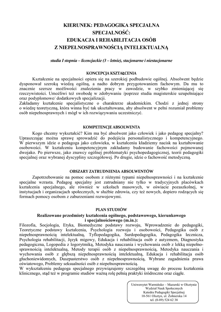 KIERUNEK: PEDAGOGIKA SPECJALNA SPECJALNOŚĆ: EDUKACJA I REHABILITACJA OSÓB Z NIEPEŁNOSPRAWNOŚCIĄ INTELEKTUALNĄ studia I stopnia – licencjackie (3 – letnie), stacjonarne i niestacjonarne KONCEPCJA KSZTAŁCENIA Kształcenie na specjalności opiera się na szerokiej podbudowie ogólnej. Absolwent będzie dysponował szeroką wiedzą ogólną, a nadto dobrym przygotowaniem fachowym. Da mu to znacznie szersze możliwości znalezienia pracy w zawodzie, w szybko zmieniającej się rzeczywistości. Umożliwi też swobodę w zdobywaniu /poprzez studia magisterskie uzupełniające oraz podyplomowe/ dodatkowych specjalizacji. Zakładamy kształcenie specjalistyczne o charakterze akademickim. Chodzi z jednej strony o wiedzę teoretyczną, która winna być tak ukształtowana, aby absolwent w pełni rozumiał problemy osób niepełnosprawnych i mógł w ich rozwiązywaniu uczestniczyć. KOMPETENCJE ABSOLWENTA Kogo chcemy wykształcić? Kim ma być absolwent jako człowiek i jako pedagog specjalny? Upraszczając można sprawę sprowadzić do podejścia personalistycznego i kompetencyjnego. W pierwszym idzie o pedagoga jako człowieka, w kształceniu kładziemy nacisk na kształtowanie osobowości. W kształceniu kompetencyjnym zakładamy budowanie fachowości pojmowanej dwojako. Po pierwsze, jako znawcy ogólnej problematyki psychopedagogicznej, teorii pedagogiki specjalnej oraz wybranej dyscypliny szczegółowej. Po drugie, idzie o fachowość metodyczną. OBSZARY ZATRUDNIENIA ABSOLWENTÓW Zapotrzebowanie na pomoc osobom z różnymi typami niepełnosprawności i na kształcenie specjalne wzrasta. Pedagog specjalny jest zatrudniany nie tylko w tradycyjnych placówkach kształcenia specjalnego, ale również w szkołach masowych, w oświacie pozaszkolnej, w instytucjach i organizacjach społecznych, w służbie zdrowia, czy też nowych, dopiero rodzących się formach pomocy osobom z zaburzeniami rozwojowymi. PLAN STUDIÓW Realizowane przedmioty kształcenia ogólnego, podstawowego, kierunkowego i specjalnościowego (m.in.): Filozofia, Socjologia, Etyka, Biomedyczne podstawy rozwoju, Wprowadzenie do pedagogiki, Teoretyczne podstawy kształcenia, Psychologia rozwoju i osobowości, Pedagogika osób z niepełnosprawnością intelektualną, Tyflopedagogika, Surdopedagogika, Pedagogika lecznicza, Psychologia rehabilitacji, Język migowy, Edukacja i rehabilitacja osób z autyzmem, Diagnostyka pedagogiczna, Logopedia z logorytmiką, Metodyka nauczania i wychowania osób z lekką niepełnosprawnością intelektualną, Metody terapii osób z niepełnosprawnością, Metodyka nauczania i wychowania osób z głębszą niepełnosprawnością intelektualną, Edukacja i rehabilitacja osób głuchoniewidomych, Duszpasterstwo osób z niepełnosprawnością, Wybrane zagadnienia prawa oświatowego, Problemy seksualności osób z niepełnosprawnością. W wykształceniu pedagoga specjalnego przywiązujemy szczególną uwagę do procesu kształcenia klinicznego, stąd też w programie studiów ważną rolę pełnią praktyki śródroczne oraz ciągłe. Uniwersytet Warmińsko – Mazurski w Olsztynie Wydział Nauk Społecznych Katedra Pedagogiki Specjalnej 10-561 Olsztyn, ul. Żołnierska 14 tel. (0-89) 524 62 38