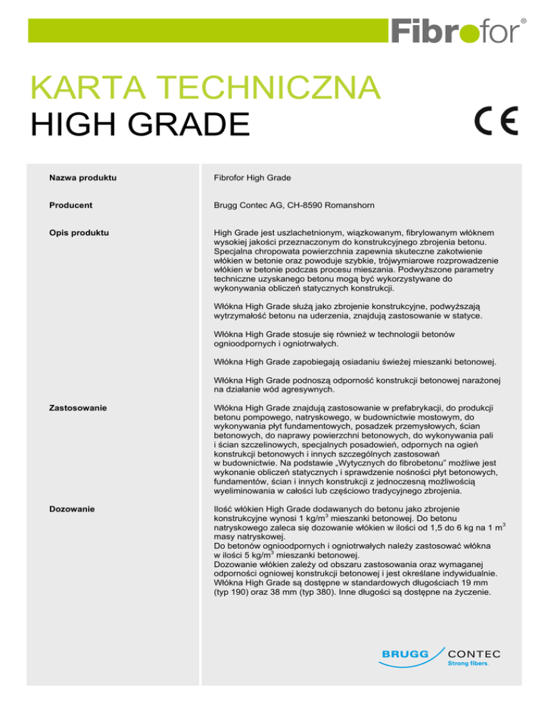 KARTA TECHNICZNA HIGH GRADE Nazwa produktu Fibrofor High Grade Producent Brugg Contec AG, CH-8590 Romanshorn Opis produktu High Grade jest uszlachetnionym, wiązkowanym, fibrylowanym włóknem wysokiej jakości przeznaczonym do konstrukcyjnego zbrojenia betonu. Specjalna chropowata powierzchnia zapewnia skuteczne zakotwienie włókien w betonie oraz powoduje szybkie, trójwymiarowe rozprowadzenie włókien w betonie podczas procesu mieszania. Podwyższone parametry techniczne uzyskanego betonu mogą być wykorzystywane do wykonywania obliczeń statycznych konstrukcji. Włókna High Grade służą jako zbrojenie konstrukcyjne, podwyższają wytrzymałość betonu na uderzenia, znajdują zastosowanie w statyce. Włókna High Grade stosuje się również w technologii betonów ognioodpornych i ogniotrwałych. Włókna High Grade zapobiegają osiadaniu świeżej mieszanki betonowej. Włókna High Grade podnoszą odporność konstrukcji betonowej narażonej na działanie wód agresywnych. Zastosowanie Włókna High Grade znajdują zastosowanie w prefabrykacji, do produkcji betonu pompowego, natryskowego, w budownictwie mostowym, do wykonywania płyt fundamentowych, posadzek przemysłowych, ścian betonowych, do naprawy powierzchni betonowych, do wykonywania pali i ścian szczelinowych, specjalnych posadowień, odpornych na ogień konstrukcji betonowych i innych szczególnych zastosowań w budownictwie. Na podstawie „Wytycznych do fibrobetonu” możliwe jest wykonanie obliczeń statycznych i sprawdzenie nośności płyt betonowych, fundamentów, ścian i innych konstrukcji z jednoczesną możliwością wyeliminowania w całości lub częściowo tradycyjnego zbrojenia. Dozowanie Ilość włókien High Grade dodawanych do betonu jako zbrojenie konstrukcyjne wynosi 1 kg/m3 mieszanki betonowej. Do betonu natryskowego zaleca się dozowanie włókien w ilości od 1,5 do 6 kg na 1 m3 masy natryskowej. Do betonów ognioodpornych i ogniotrwałych należy zastosować włókna w ilości 5 kg/m3 mieszanki betonowej. Dozowanie włókien zależy od obszaru zastosowania oraz wymaganej odporności ogniowej konstrukcji betonowej i jest określane indywidualnie. Włókna High Grade są dostępne w standardowych długościach 19 mm (typ 190) oraz 38 mm (typ 380). Inne długości są dostępne na życzenie. Właściwości fizyczne Materiał Postać Gęstość Długości Kolor Odporność na kwasy/zasady Siła zrywająca Moduł sprężystości Temperatura mięknienia Grubość folii Mieszanie czysty, uszlachetniony poliolefin włókno skręcone, fibrylowane 0,91 standardowe i na życzenie dokładność +/- 5% beż obojętny ok 400 N/mm2 ok 4900 N/mm2 ok 150° C ok 80 μm Dodanie w betoniarni włókien High Grade do suchej mieszanki nie wymaga wydłużonego czasu mieszania. Przyjęte czasy mieszania stosowanych receptur betonu mogą pozostać bez zmiany. W przypadku specjalnych mieszanek dla specyficznych produktów może okazać się koniecznym zastosowanie dłuższego czasu mieszania. Włókna High Grade można dodawać również bezpośrednio do betoniarki samochodowej. W takim przypadku obowiązuje zasada: na każdy 1 m3 betonu 1 minuta mieszania przy najwyższych obrotach bębna mieszalnika. Minimalny czas mieszania 3 minuty. Włókna High Grade mogą być przetwarzane ze wszystkimi powszechnie stosowanymi domieszkami do betonu. Uwaga: dodanie włókien High Grade może zmniejszyć płynność mieszanki betonowej! Pożądaną konsystencję można uzyskać poprzez dodanie domieszek upłynniających do betonu! Nie wolno uzupełniać mieszanki dodatkową ilością wody! Opakowanie (torby papierowe) Torby Kartony Inne opakowania na życzenie. Gwarancja Włókna High Grade spełniają wszystkie określone normy EN 14889/2 i gwarantują przy tym niezmiennie wysoką jakość. 1 kg 12 toreb po 1 kg Brugg Contec AG Aachstrasse 11 CH-8590 Romanshorn Tel. +41 71 466 12 12 Fax +41 71 466 12 10 [email protected] www.bruggcontec.com 01/2011 Brugg Contec AG nie ma kontroli nad wytwarzaniem produktów z zastosowaniem włókien High Grade i dlatego nie może przyjąć na siebie żadnej odpowiedzialności za jakość produktu końcowego.