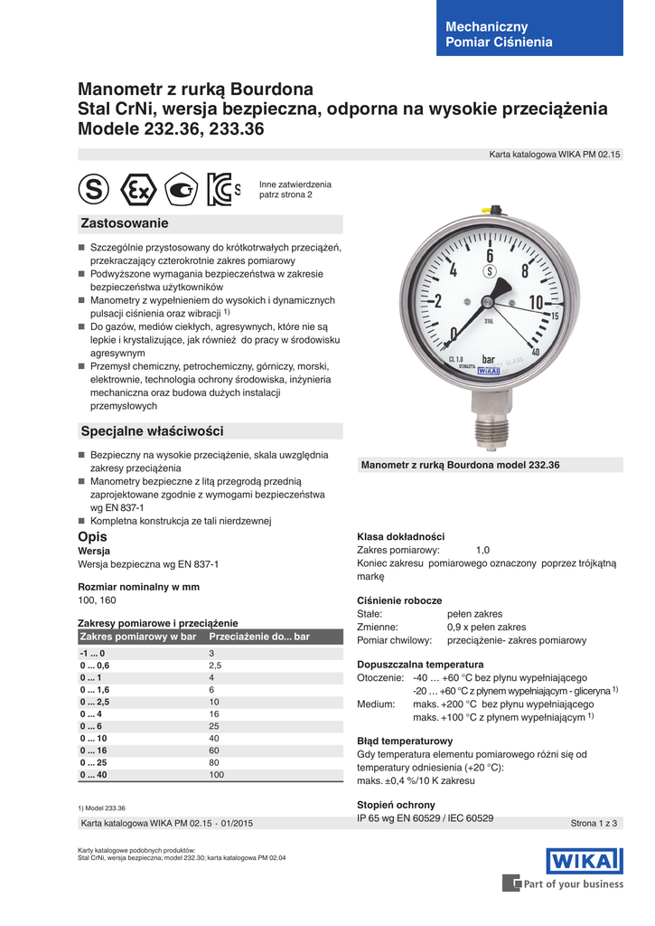 Mechaniczny Pomiar Ciśnienia Manometr z rurką Bourdona Stal CrNi, wersja bezpieczna, odporna na wysokie przeciążenia Modele 232.36, 233.36 Karta katalogowa WIKA PM 02.15 k Inne zatwierdzenia patrz strona 2 Zastosowanie ■■ Szczególnie przystosowany do krótkotrwałych przeciążeń, przekraczający czterokrotnie zakres pomiarowy ■■ Podwyższone wymagania bezpieczeństwa w zakresie bezpieczeństwa użytkowników ■■ Manometry z wypełnieniem do wysokich i dynamicznych pulsacji ciśnienia oraz wibracji 1) ■■ Do gazów, mediów ciekłych, agresywnych, które nie są lepkie i krystalizujące, jak również do pracy w środowisku agresywnym ■■ Przemysł chemiczny, petrochemiczny, górniczy, morski, elektrownie, technologia ochrony środowiska, inżynieria mechaniczna oraz budowa dużych instalacji przemysłowych Specjalne właściwości ■■ Bezpieczny na wysokie przeciążenie, skala uwzględnia zakresy przeciążenia ■■ Manometry bezpieczne z litą przegrodą przednią zaprojektowane zgodnie z wymogami bezpieczeństwa wg EN 837-1 ■■ Kompletna konstrukcja ze tali nierdzewnej Opis Wersja Wersja bezpieczna wg EN 837-1 Rozmiar nominalny w mm 100, 160 Zakresy pomiarowe i przeciążenie Zakres pomiarowy w bar Przeciażenie do... bar -1 ... 0 0 ... 0,6 0 ... 1 0 ... 1,6 0 ... 2,5 0 ... 4 0 ... 6 0 ... 10 0 ... 16 0 ... 25 0 ... 40 3 2,5 4 6 10 16 25 40 60 80 100 1) Model 233.36 Karta katalogowa WIKA PM 02.15 ∙ 01/2015 Karty katalogowe podobnych produktów: Stal CrNi, wersja bezpieczna; model 232.30; karta katalogowa PM 02.04 Manometr z rurką Bourdona model 232.36 Klasa dokładności Zakres pomiarowy: 1,0 Koniec zakresu pomiarowego oznaczony poprzez trójkątną markę Ciśnienie robocze Stałe: pełen zakres Zmienne: 0,9 x pełen zakres Pomiar chwilowy: przeciążenie- zakres pomiarowy Dopuszczalna temperatura Otoczenie: -40 … +60 °C bez płynu wypełniającego -20 … +60 °C z płynem wypełniającym - gliceryna 1) Medium: maks. +200 °C bez płynu wypełniającego maks. +100 °C z płynem wypełniającym 1) Błąd temperaturowy Gdy temperatura elementu pomiarowego różni się od temperatury odniesienia (+20 °C): maks. ±0,4 %/10 K zakresu Stopień ochrony IP 65 wg EN 60529 / lEC 60529 Strona 1 z 3 Wersja standardowa Opcjonalnie Przyłącze procesowe Stal CrNi 316L, Przyłącze dolne Gwint zew.: G ½ B, SW 22 ■■ Inne przyłącza procesowe Element pomiarowy Stal CrNi 316L ■■ Kołnierz przedni lub tylny, stal CrNi Mechanizm Stal CrNi Podzielnia Aluminium białe, czarna skala, Zakres przeciążenia zaznaczony w czarnym sektorze Wskazówka Aluminium czarne Obudowa Stal CrNi, z litą przegrodą przednią (Solidfront) i zabezpieczeniem przeciwwybuchowym z tyłu ■■ Uszczelki (model 910.17, patrz karta katalogowa AC 09.08) ■■ Montaż z separatorem patrz folder separatory ■■ Inne zakresy pomiarowe, np. -1 ... 1,5 bar ■■ Temperatura otoczenia -40 °C: wypełnienie silikonowe ■■ Stopień ochrony IP 66 / IP 67 ■■ Urządzenia kontaktowe (tylko dla NS 100, karta katalogowa AC 08.01) Deklaracja CE Dyrektywa ATEX 1) Ochrona typu „c“, konstrukcja bezpieczna Aprobaty Szyba Szyba wielowarstwowa bezpieczna ■■ GOST, certyfikat metrologii/ techniki pomiaru, Rosja Pokrywa Typu Twist, stal CrNi ■■ KOSHA, ochrona iskrobezpieczna „i“ , Południowa Korea Płyn wypełniający (dla modelu 233.36) Gliceryna 99,7 % (Gliceryna 86,5 % dla zakresów pomiarowych ≤ 0 ... 2,5 bar) Certyfikaty/Świadectwa 1) ■■ CRN, bezpieczeństwo (np. bezpieczeństwo elektryczne, przeciążenia, ...), Kanada ■■ 2.2-certyfikat fabryczny wg EN 10204 (np. wykonany zgodnie ze stanem techniki, potwierdzenie materiału, klasy dokładności) ■■ 3.1-certyfikat sprawdzenia wg EN 10204 (np. klasa dokładności) 1) Opcjonalnie Zatwierdzenia i certyfikaty dostępne są na stronie internetowej Strona 2 z 3 Karta katalogowa WIKA PM 02.15 ∙ 01/2015 Wymiary w mm Wersja standardowa 1034588.02 Przyłącze radialne dolne ≤ 16 bar z zaworem odpowietrzającym > 16 bar bez zaworu odpowietrzającego NS Wymiary w mm a b D1 D2 e G h ±1 SW 100 25 59,5 101 100 17 G½B 87 22 160 27 65 161 159 17,5 G½B 118 22 Waga w kg 0,65 1,30 Przyłącze procesowe wg EN 837-1 / 7.3 01/2015 PL based on 01/2015 DE Dane do zamówienia Model / rozmiar nominalny / zakres pomiarowy / rozmiar przyłącza / opcjonalnie © 2003 WIKA Alexander Wiegand SE & Co. KG, wszelkie prawa zastrzeżone Specyfikacje i wymiary podane w niniejszej karcie przedstawiają stan konstrukcyjny aktualny w momencie wydruku. Istnieje możliwość wprowadzenia modyfikacji i zmian specyfikacji materiałowej bez wcześniejszego powiadomienia. Karta katalogowa WIKA PM 02.15 ∙ 01/2015 Strona 3 z 3 WIKA Polska spółka z ograniczoną odpowiedzialnością sp. k. Ul. Łęgska 29/35, 87-800 Włocławek 87-800 Włocławek Tel.: (+48) 54 23 01 100 Fax: (+48) 54 23 01 101 E-mail: [email protected] www.wikapolska.pl
