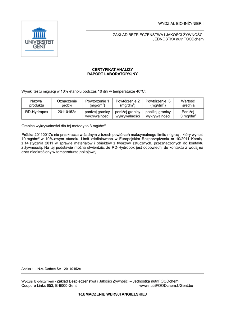 WYDZIAŁ BIO-INŻYNIERII ZAKŁAD BEZPIECZEŃSTWA I JAKOŚCI ŻYWNOŚCI JEDNOSTKA nutriFOODchem CERTYFIKAT ANALIZY RAPORT LABORATORYJNY Wyniki testu migracji w 10% etanolu podczas 10 dni w temperaturze 40ºC: Nazwa produktu Oznaczenie próbki Powtórzenie 1 (mg/dm2) Powtórzenie 2 (mg/dm2) Powtórzenie 3 (mg/dm2) Wartość średnia RD-Hydropox 20110152c poniżej granicy wykrywalności poniżej granicy wykrywalności poniżej granicy wykrywalności Poniżej 3 mg/dm2 Granica wykrywalności dla tej metody to 3 mg/dm2 Próbka 20110017c nie przekracza w żadnym z trzech powtórzeń maksymalnego limitu migracji, który wynosi 10 mg/dm2 w 10%-owym etanolu. Limit zdefiniowano w Europejskim Rozporządzeniu nr 10/2011 Komisji z 14 stycznia 2011 w sprawie materiałów i obiektów z tworzyw sztucznych, przeznaczonych do kontaktu z żywnością. Na tej podstawie można stwierdzić, że RD-Hydropox jest odpowiedni do kontaktu z wodą na czas nieokreślony w temperaturze pokojowej. Aneks 1 – N.V. Dothee SA - 20110152c Wydział Bio-Inżynierii - Zakład Bezpieczeństwa i Jakości Żywności – Jednostka nutriFOODchem Coupure Links 653, B-9000 Gent www.nutriFOODchem.UGent.be TŁUMACZENIE WERSJI ANGIELSKIEJ