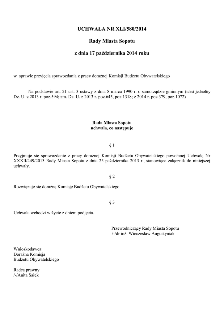 UCHWAŁA NR XLI/580/2014 Rady Miasta Sopotu z dnia 17 października 2014 roku w sprawie przyjęcia sprawozdania z pracy doraźnej Komisji Budżetu Obywatelskiego Na podstawie art. 21 ust. 3 ustawy z dnia 8 marca 1990 r. o samorządzie gminnym (tekst jednolity Dz. U. z 2013 r. poz.594; zm. Dz. U. z 2013 r. poz.645, poz.1318; z 2014 r. poz.379, poz.1072) Rada Miasta Sopotu uchwala, co następuje §1 Przyjmuje się sprawozdanie z pracy doraźnej Komisji Budżetu Obywatelskiego powołanej Uchwałą Nr XXXII/449/2013 Rady Miasta Sopotu z dnia 25 października 2013 r., stanowiące załącznik do niniejszej uchwały. §2 Rozwiązuje się doraźną Komisję Budżetu Obywatelskiego. §3 Uchwała wchodzi w życie z dniem podjęcia. Przewodniczący Rady Miasta Sopotu /-/dr inż. Wieczesław Augustyniak Wnioskodawca: Doraźna Komisja Budżetu Obywatelskiego Radca prawny /-/Anita Sałek Załącznik do Uchwały Nr XLI/580/2014 Rady Miasta Sopotu z dnia 17 października 2014 r. Sprawozdanie z pracy doraźnej Komisji ds. Budżetu Obywatelskiego Komisja doraźna ds. Budżetu Obywatelskiego została powołana uchwałą nr XXXII/449/2013 Rady Miasta Sopotu z dnia 25 października 2013 roku. Zadaniem Komisji było opracowanie zasad budżetu obywatelskiego w porozumieniu z Prezydentem Miasta Sopotu, promowanie idei budżetu obywatelskiego, sprawowanie nadzoru nad realizacją budżetu obywatelskiego, weryfikacja zgłoszonych projektów pod względem gospodarności oraz formalno – prawnym, wskazanie propozycji zadań zgłoszonych do budżetu obywatelskiego, które zostaną poddane pod głosowanie mieszkańcom Sopotu oraz propozycji zadań negatywnie zweryfikowanych wraz z uzasadnieniem, nadzorowanie przebiegu głosowania dotyczącego wyboru propozycji zadań zgłoszonych do budżetu obywatelskiego, które zostały pozytywnie zweryfikowane, monitorowanie realizacji zadań przyjętych do budżetu obywatelskiego, nadzór nad realizacją kampanii informacyjnej związanej z budżetem obywatelskim, współpraca z Prezydentem Miasta Sopotu, Skarbnikiem Miasta Sopotu oraz Zespołem ds. konsultacji w zakresie monitorowania i nadzoru nad realizacją zadań związanych z budżetem obywatelskim. W skład komisji wchodzili: Piotr Bagiński, Grażyna Czajkowska, Piotr Kurdziel, Bartosz Łapiński, Piotr Meler, Lesław Orski oraz przewodniczący Zbigniew Duzinkiewicz. Zgodnie z załącznikiem nr 1 do uchwały nr XXXVII/510/2014 Rady Miasta Sopotu z dnia 4 kwietnia 2014 r. w sprawie przeprowadzenia konsultacji społecznych z mieszkańcami Sopotu na temat Budżetu Miasta Sopotu na 2015 rok postulowano, aby na projekty mieszkańców została przeznaczona kwota nie mniejsza niż 4 mln zł. W pierwszej kolejności na wniosek Komisji rozpoczął się cykl spotkań z mieszkańcami, które odbyły się: 22 kwietnia o godz. 17.00 w Domu Pomocy Społecznej, 22 kwietnia o godz. 19.00 w Miejskiej Bibliotece Publicznej na ul. Cieszyńskiego, 23 kwietnia o godz. 17.00 w Miejskiej Bibliotece Publicznej na ul. 3 Maja, 23 kwietnia o godz. 19.00 w Dworku Sierakowskich. Od 5 do 28 kwietnia mieszkańcy mieli możliwość składania propozycji inwestycji i zadań do budżetu na rok 2015 w formie pisemnej na formularzach, które zostały rozesłane do sopockich mieszkań oraz dostępnych w Urzędzie Miasta, filiach Miejskiej Biblioteki Publicznej w Sopocie, bądź pobierając na stronie internetowej www.sopot.pl. Wzór formularza stanowił załącznik nr 2 do uchwały nr XXXVII/510/2014 Rady Miasta Sopotu z dnia 4 kwietnia 2014 r. w sprawie przeprowadzenia konsultacji społecznych z mieszkańcami Sopotu na temat Budżetu Miasta Sopotu na 2015 rok. Do 28 maja Komisja dokonała weryfikacji zgłoszonych projektów w wraz z Prezydentem Miasta Sopotu. Komisja zweryfikowała zgłoszone wnioski pod względem formalno - prawnym i wykluczyła wnioski, które nie leżą w kompetencji miasta lub są sprzeczne z przepisami – ustawami wyższego rzędu. Druga ulotka skierowana do Sopocian zapraszająca na kolejną turę spotkań zawierała 2 tabele: jedną z projektami lokalnymi i drugą z ogólnomiejskimi. Komisja przez cały okres współpracowała z panem Prezydentem oraz jego przedstawicielami p. Marcinem Skwierawskim i p. Katarzyną Alesionek oraz ze skarbnikiem p. Mirosławem Goślickim. Od 9 czerwca do 22 czerwca odbywało się głosowanie w Urzędzie Miasta Sopotu w godzinach funkcjonowania urzędu oraz można było zagłosować internetowo. Dnia 15 czerwca odbyło się głosowanie w wyznaczonych punktach do głosowania na terenie miasta. Zgodnie z załącznikiem nr 1 do uchwały nr XXXVII/510/2014 Rady Miasta Sopotu z dnia 4 kwietnia 2014 r. w sprawie przeprowadzenia konsultacji społecznych z mieszkańcami Sopotu na temat Budżetu Miasta Sopotu na 2014 rok, propozycję projektu do zrealizowania w ramach budżetu obywatelskiego mógł zgłosić każdy mieszkaniec Sopotu, który ukończył 16 rok życia, lub organizacja pozarządowa, której siedziba, siedziba oddziału lub realizacja zadań publicznych odbywa się na terenie Gminy Miasta Sopotu na podstawie ustawy o działalności pożytku publicznego i wolontariacie. Natomiast prawo udziału w głosowaniu miał każdy mieszkaniec Sopotu, który ukończył 16 rok życia. Zasada głosowania polegała na wyborze maksymalnie 5 inwestycji z tabeli projektów lokalnych oraz maksymalnie 5 z tabeli projektów ogólnomiejskich. Głosowanie odbywało się poprzez postawienie znaku „X” przy wybranych projektach na karcie do głosowania. W pierwszej edycji Budżetu Obywatelskiego wzięło udział około 2 400 osób, w kolejnej frekwencja nieco zmalała i wyniosła ponad 1400 osób, w ubiegłorocznej wpłynęło 2151 głosów. W tegorocznej, czwartej już edycji budżetu obywatelskiego zagłosowało 4800 osób co stanowi 15,14% mieszkańców uprawnionych do głosowania, 2982 głosów oddano internetowo. Prezydent Miasta Sopotu zdecydował o rozszerzeniu listy projektów ogólnomiejskich o 3 kolejne, oraz 