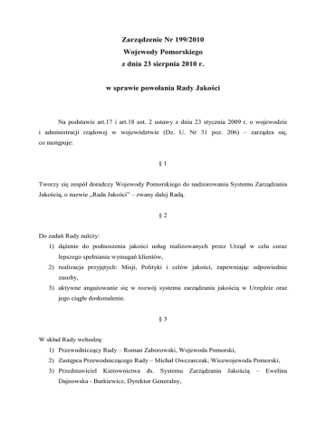 Zarządzenie Nr 199/2010 Wojewody Pomorskiego z dnia 23 sierpnia 2010 r. w sprawie powołania Rady Jakości Na podstawie art.17 i art.18 ust. 2 ustawy z dnia 23 stycznia 2009 r. o wojewodzie i administracji rządowej w województwie (Dz. U. Nr 31 poz. 206) – zarządza się, co następuje: §1 Tworzy się zespół doradczy Wojewody Pomorskiego do nadzorowania Systemu Zarządzania Jakością, o nazwie „Rada Jakości” – zwany dalej Radą. §2 Do zadań Rady naleŜy: 1) dąŜenie do podnoszenia jakości usług realizowanych przez Urząd w celu coraz lepszego spełniania wymagań klientów, 2) realizacja przyjętych: Misji, Polityki i celów jakości, zapewniając odpowiednie zasoby, 3) aktywne angaŜowanie się w rozwój systemu zarządzania jakością w Urzędzie oraz jego ciągłe doskonalenie. §3 W skład Rady wchodzą: 1) Przewodniczący Rady – Roman Zaborowski, Wojewoda Pomorski, 2) Zastępca Przewodniczącego Rady – Michał Owczarczak, Wicewojewoda Pomorski, 3) Przedstawiciel Kierownictwa ds. Systemu Zarządzania Jakością – Ewelina Dajnowska - Burkiewicz, Dyrektor Generalny, 4) Sekretarz Rady Jakości – Katarzyna Towpasz, Starszy Inspektor w Oddziale Organizacyjnym i Kontroli Wewnętrznej Wydziału Organizacyjno – Administracyjnego, 5) Członkowie Rady: a) Maria Opinc – Bennich –Dyrektor Biura Wojewody, b) Ewa Kuczyńska – Dyrektor Wydziału Nadzoru i Kontroli, c) Piotr Kurdziel – Zastępca Dyrektora Wydziału Nadzoru i Kontroli, d) Marta Literska – Dyrektor Wydziału Organizacyjno - Administracyjnego, e) Alina Reiter – Zastępca Dyrektora Wydziału Organizacyjno - Administracyjnego, f) Władysław Kanka – Dyrektor Wydziału Polityki Społecznej, g) Jerzy Przystrzelski – Zastępca Dyrektora Wydziału Polityki Społecznej, h) Bernard Mathea – Dyrektor Wydziału Spraw Obywatelskich i Cudzoziemców, i) Bogusława Cierpisz – Zastępca Dyrektora Wydziału Spraw Obywatelskich i Cudzoziemców, j) Władysław Ryszard Sulęta – Dyrektor Wydziału Bezpieczeństwa i Zarządzania Kryzysowego, k) Jarosław Kopczyński – Zastępca Dyrektora Wydziału Bezpieczeństwa i Zarządzania Kryzysowego, l) Danuta Janiak – Dyrektor Wydziału Finansów i BudŜetu, m) Magdalena Goldszmidt – Zastępca Dyrektora Wydziału Finansów i BudŜetu, n) Andrzej Kondracki – Dyrektor Wydziału Infrastruktury, o) Adam Madejski – Zastępca Dyrektora Wydziału Infrastruktury, p) Romuald Nowak – Dyrektor Wydziału Geodezji, q) Sylwia KałuŜa - Ruesta – Zastępca Dyrektora Wydziału Geodezji, r) Marek Goliński – Dyrektor Wydziału Zarządzania Funduszami Europejskimi, s) Sylwia Ronowska - Socha – Zastępca Dyrektora Wydziału Zarządzania Funduszami Europejskimi, t) BoŜena Sitnik - Pietrzykowska – Dyrektor Wydziału Instytucji Pośredniczącej w Certyfikacji, u) Jolanta Staszak – Zastępca Dyrektora Wydziału Instytucji Pośredniczącej w Certyfikacji, v) Jerzy Karpiński – Dyrektor Wydziału Zdrowia – Pomorskiego Centrum Zdrowia Publicznego, w) Natalia Garczyńska-Klaman – Kierownik Zespołu Audytu Wewnętrznego, x) GraŜyna Sykut – Pełnomocnik Wojewody ds. Ochrony Informacji Niejawnych, y) Sylwia Gaik – Zastępca Pełnomocnika Wojewody ds. Ochrony Informacji Niejawnych. §4 Obsługę Rady zapewnia Wydział Organizacyjno - Administracyjny. §5 Rada powołana jest na czas nieokreślony. §6 Traci moc zarządzenie Nr 166/2009 Wojewody Pomorskiego z dnia 17 lipca 2009 r. w sprawie powołania Rady Jakości. §7 Zarządzenie wchodzi w Ŝycie z dniem podpisania. WOJEWODA POMORSKI /-/ Roman Zaborowski UZASADNIENIE W związku ze zmianą struktury organizacyjnej Pomorskiego Urzędu Wojewódzkiego w Gdańsku polegającą na utworzeniu Wydziału Zdrowia – Pomorskiego Centrum Zdrowia Publicznego na podstawie Zarządzenia Nr 262/2009 Wojewody Pomorskiego z dnia 16 listopada 2009 r. zmieniającego zarządzenie w sprawie nadania statutu Pomorskiemu Urzędowi Wojewódzkiemu w Gdańsku oraz w związku ze zmianami personalnymi, zaistniała konieczność zmiany składu Rady Jakości.