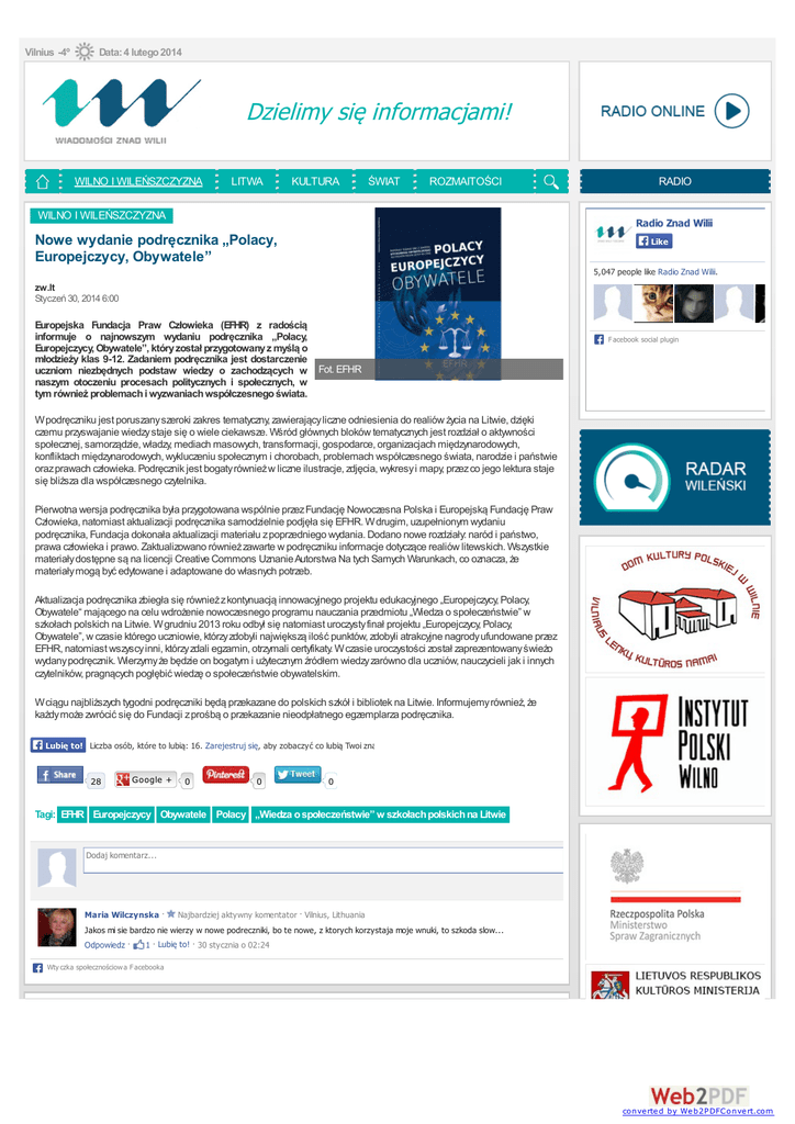 Vilnius -4º Data: 4 lutego 2014 Dzielimy się informacjami! WILNO I WILEŃSZCZYZNA LITWA KULTURA ŚWIAT ROZMAITOŚCI WILNO I WILEŃSZCZYZNA RADIO Radio Znad Wilii Nowe wydanie podręcznika „Polacy, Europejczycy, Obywatele” Like 5,047 people like Radio Znad Wilii. zw.lt Styczeń 30, 2014 6:00 Europejska Fundacja Praw Człowieka (EFHR) z radością informuje o najnowszym wydaniu podręcznika „Polacy, Europejczycy, Obywatele”, który został przygotowany z myślą o młodzieży klas 9-12. Zadaniem podręcznika jest dostarczenie uczniom niezbędnych podstaw wiedzy o zachodzących w Fot. EFHR naszym otoczeniu procesach politycznych i społecznych, w tym również problemach i wyzwaniach współczesnego świata. F acebook social plugin W podręczniku jest poruszany szeroki zakres tematyczny, zawierający liczne odniesienia do realiów życia na Litwie, dzięki czemu przyswajanie wiedzy staje się o wiele ciekawsze. Wśród głównych bloków tematycznych jest rozdział o aktywności społecznej, samorządzie, władzy, mediach masowych, transformacji, gospodarce, organizacjach międzynarodowych, konfliktach międzynarodowych, wykluczeniu społecznym i chorobach, problemach współczesnego świata, narodzie i państwie oraz prawach człowieka. Podręcznik jest bogaty również w liczne ilustracje, zdjęcia, wykresy i mapy, przez co jego lektura staje się bliższa dla współczesnego czytelnika. Pierwotna wersja podręcznika była przygotowana wspólnie przez Fundację Nowoczesna Polska i Europejską Fundację Praw Człowieka, natomiast aktualizacji podręcznika samodzielnie podjęła się EFHR. W drugim, uzupełnionym wydaniu podręcznika, Fundacja dokonała aktualizacji materiału z poprzedniego wydania. Dodano nowe rozdziały: naród i państwo, prawa człowieka i prawo. Zaktualizowano również zawarte w podręczniku informacje dotyczące realiów litewskich. Wszystkie materiały dostępne są na licencji Creative Commons Uznanie Autorstwa Na tych Samych Warunkach, co oznacza, że materiały mogą być edytowane i adaptowane do własnych potrzeb. Aktualizacja podręcznika zbiegła się również z kontynuacją innowacyjnego projektu edukacyjnego „Europejczycy, Polacy, Obywatele“ mającego na celu wdrożenie nowoczesnego programu nauczania przedmiotu „Wiedza o społeczeństwie” w szkołach polskich na Litwie. W grudniu 2013 roku odbył się natomiast uroczysty finał projektu „Europejczycy, Polacy, Obywatele”, w czasie którego uczniowie, którzy zdobyli największą ilość punktów, zdobyli atrakcyjne nagrody ufundowane przez EFHR, natomiast wszyscy inni, którzy zdali egzamin, otrzymali certyfikaty. W czasie uroczystości został zaprezentowany świeżo wydany podręcznik. Wierzymy że będzie on bogatym i użytecznym źródłem wiedzy zarówno dla uczniów, nauczycieli jak i innych czytelników, pragnących pogłębić wiedzę o społeczeństwie obywatelskim. W ciągu najbliższych tygodni podręczniki będą przekazane do polskich szkół i bibliotek na Litwie. Informujemy również, że każdy może zwrócić się do Fundacji z prośbą o przekazanie nieodpłatnego egzemplarza podręcznika. Lubię to! Liczba osób, które to lubią: 16. Zarejestruj się, aby zobaczyć co lubią Twoi znajomi. 28 Google + 0 0 0 Tagi: EFHR Europejczycy Obywatele Polacy „Wiedza o społeczeństwie” w szkołach polskich na Litwie Dodaj komentarz... Maria Wilczynska · Najbardziej aktywny komentator · Vilnius, Lithuania Jakos mi sie bardzo nie wierzy w nowe podreczniki, bo te nowe, z ktorych korzystaja moje wnuki, to szkoda slow... Odpowiedz · 1 · Lubię to! · 30 stycznia o 02:24 Wty czka społecznościow a F acebooka converted by Web2PDFConvert.com Józef Rybak: Możemy z pewnością patrzeć w przyszłość W ubiegłym roku w okręgu wileńskim popełniono ponad 24 tys. przestępstw Pani Szuka Pana w USA „Mamy bogaty program“. Olimpiada Literatury i Języka Polskiego na Litwie Za spacer przy granicy 600 litów kary W lutym w Wilnie bezpłatne lekcje nordic walking W rejonie solecznickim zatrzymano Gruzinów Obchody kanonizacji JPII w szkołach rejonu wileńskiego „Ludzie przyszli i mogli wypowiedzieć swoje zdanie”. Prezentacja książki o powstaniu OSSKPL W Pałacu Władców wykłady poświęcone zabytkom historycznym Wilna 1 EFHR wywalczyła rekompensatę w wysokości ponad 30 tys. litów Antoni Jankowski: Ruch uniwersytetów dla seniorów jest bardzo potrzebny Dziś w Wilnie zawyją syreny Wilnianie są najbardziej niezadowoleni z dróg Forum Rodziców: Odwaga Renaty Cytackiej jest godna naśladowania J. Narkiewicz: Cierpliwość mniejszości narodowych jest już na wyczerpaniu 3 Obchody 25-lecia zwrócenia Katedry wiernym W Wilnie kierowca autobusu zmarł za kierownicą Pijany gospodarz nie mógł wytłumaczyć skąd miał 16 tys. białoruskich papierosó w usa.polishhearts.com Tysiące Ogłoszeń Matrymonialnych. Nasz Portal Wybrały Tysiące Polaków ... PORTAL RADIO MUZYKA KONTAKTY Ogłoszenia Litwa Salon polityczny Opinie Kultura Rozmaitości Świat Koncert Życzeń Projekty Konkurs Radio Znad Wilii Ludzie LISTAPL Pogodna Lista Przebojów Polski przebój roku 2013 Radio Znad Wilii Portal zw.lt Reklama Pracownicy Brandbook Rekwizyty UAB "Znad Wilii radijo stotis" | Laisvės pr. 60, LT-05120 Vilnius, Lietuva | tel. (8 5) 249 08 70, faks (8 5) 278 44 46 Realizacja ZnadWilii.lt converted by Web2PDFConvert.com converted by Web2PDFConvert.com