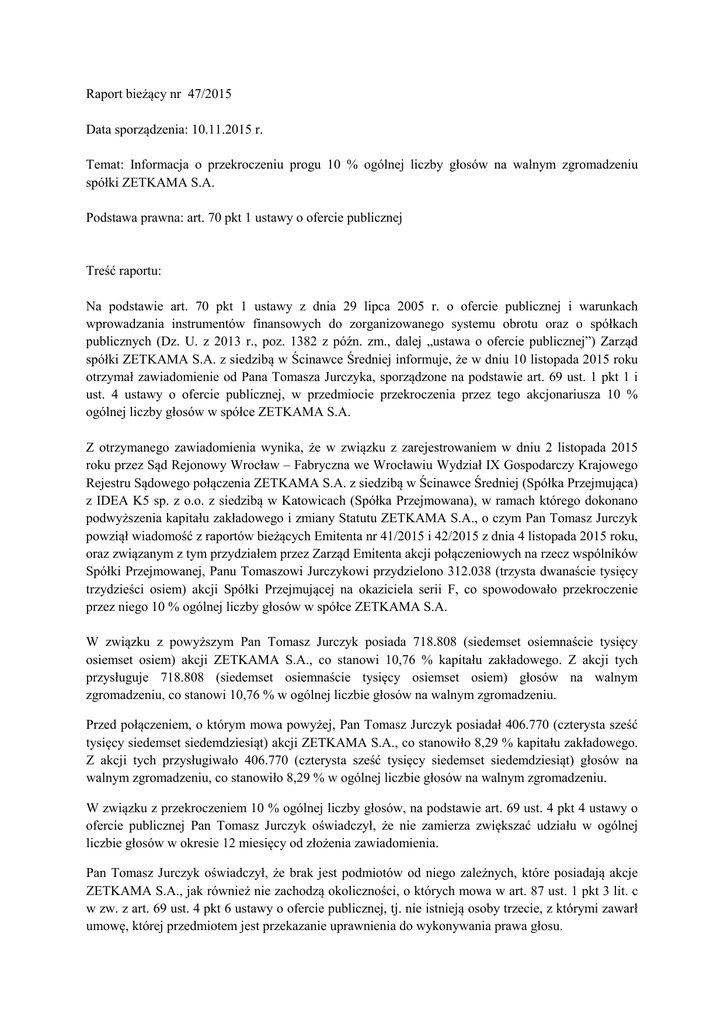 Raport bieżący nr 47/2015 Data sporządzenia: 10.11.2015 r. Temat: Informacja o przekroczeniu progu 10 % ogólnej liczby głosów na walnym zgromadzeniu spółki ZETKAMA S.A. Podstawa prawna: art. 70 pkt 1 ustawy o ofercie publicznej Treść raportu: Na podstawie art. 70 pkt 1 ustawy z dnia 29 lipca 2005 r. o ofercie publicznej i warunkach wprowadzania instrumentów finansowych do zorganizowanego systemu obrotu oraz o spółkach publicznych (Dz. U. z 2013 r., poz. 1382 z późn. zm., dalej „ustawa o ofercie publicznej”) Zarząd spółki ZETKAMA S.A. z siedzibą w Ścinawce Średniej informuje, że w dniu 10 listopada 2015 roku otrzymał zawiadomienie od Pana Tomasza Jurczyka, sporządzone na podstawie art. 69 ust. 1 pkt 1 i ust. 4 ustawy o ofercie publicznej, w przedmiocie przekroczenia przez tego akcjonariusza 10 % ogólnej liczby głosów w spółce ZETKAMA S.A. Z otrzymanego zawiadomienia wynika, że w związku z zarejestrowaniem w dniu 2 listopada 2015 roku przez Sąd Rejonowy Wrocław – Fabryczna we Wrocławiu Wydział IX Gospodarczy Krajowego Rejestru Sądowego połączenia ZETKAMA S.A. z siedzibą w Ścinawce Średniej (Spółka Przejmująca) z IDEA K5 sp. z o.o. z siedzibą w Katowicach (Spółka Przejmowana), w ramach którego dokonano podwyższenia kapitału zakładowego i zmiany Statutu ZETKAMA S.A., o czym Pan Tomasz Jurczyk powziął wiadomość z raportów bieżących Emitenta nr 41/2015 i 42/2015 z dnia 4 listopada 2015 roku, oraz związanym z tym przydziałem przez Zarząd Emitenta akcji połączeniowych na rzecz wspólników Spółki Przejmowanej, Panu Tomaszowi Jurczykowi przydzielono 312.038 (trzysta dwanaście tysięcy trzydzieści osiem) akcji Spółki Przejmującej na okaziciela serii F, co spowodowało przekroczenie przez niego 10 % ogólnej liczby głosów w spółce ZETKAMA S.A. W związku z powyższym Pan Tomasz Jurczyk posiada 718.808 (siedemset osiemnaście tysięcy osiemset osiem) akcji ZETKAMA S.A., co stanowi 10,76 % kapitału zakładowego. Z akcji tych przysługuje 718.808 (siedemset osiemnaście tysięcy osiemset osiem) głosów na walnym zgromadzeniu, co stanowi 10,76 % w ogólnej liczbie głosów na walnym zgromadzeniu. Przed połączeniem, o którym mowa powyżej, Pan Tomasz Jurczyk posiadał 406.770 (czterysta sześć tysięcy siedemset siedemdziesiąt) akcji ZETKAMA S.A., co stanowiło 8,29 % kapitału zakładowego. Z akcji tych przysługiwało 406.770 (czterysta sześć tysięcy siedemset siedemdziesiąt) głosów na walnym zgromadzeniu, co stanowiło 8,29 % w ogólnej liczbie głosów na walnym zgromadzeniu. W związku z przekroczeniem 10 % ogólnej liczby głosów, na podstawie art. 69 ust. 4 pkt 4 ustawy o ofercie publicznej Pan Tomasz Jurczyk oświadczył, że nie zamierza zwiększać udziału w ogólnej liczbie głosów w okresie 12 miesięcy od złożenia zawiadomienia. Pan Tomasz Jurczyk oświadczył, że brak jest podmiotów od niego zależnych, które posiadają akcje ZETKAMA S.A., jak również nie zachodzą okoliczności, o których mowa w art. 87 ust. 1 pkt 3 lit. c w zw. z art. 69 ust. 4 pkt 6 ustawy o ofercie publicznej, tj. nie istnieją osoby trzecie, z którymi zawarł umowę, której przedmiotem jest przekazanie uprawnienia do wykonywania prawa głosu.