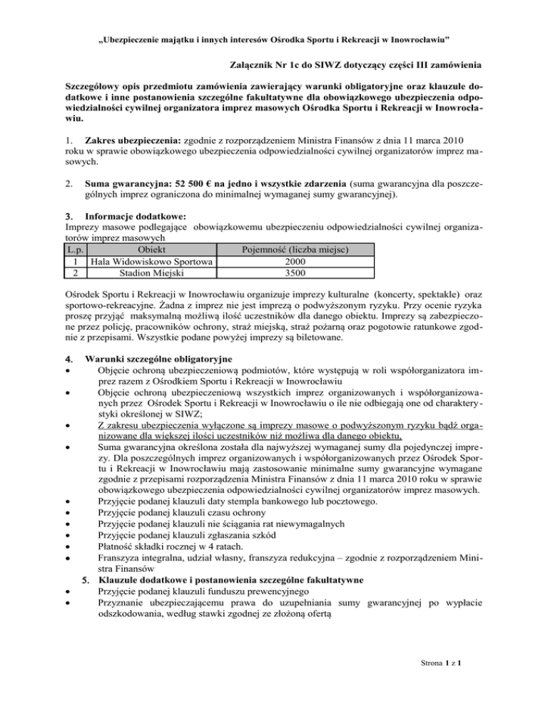 „Ubezpieczenie majątku i innych interesów Ośrodka Sportu i Rekreacji w Inowrocławiu” Załącznik Nr 1c do SIWZ dotyczący części III zamówienia Szczegółowy opis przedmiotu zamówienia zawierający warunki obligatoryjne oraz klauzule dodatkowe i inne postanowienia szczególne fakultatywne dla obowiązkowego ubezpieczenia odpowiedzialności cywilnej organizatora imprez masowych Ośrodka Sportu i Rekreacji w Inowrocławiu. 1. Zakres ubezpieczenia: zgodnie z rozporządzeniem Ministra Finansów z dnia 11 marca 2010 roku w sprawie obowiązkowego ubezpieczenia odpowiedzialności cywilnej organizatorów imprez masowych. 2. Suma gwarancyjna: 52 500 € na jedno i wszystkie zdarzenia (suma gwarancyjna dla poszczególnych imprez ograniczona do minimalnej wymaganej sumy gwarancyjnej). 3. Informacje dodatkowe: Imprezy masowe podlegające obowiązkowemu ubezpieczeniu odpowiedzialności cywilnej organizatorów imprez masowych L.p. Obiekt Pojemność (liczba miejsc) 1 Hala Widowiskowo Sportowa 2000 2 Stadion Miejski 3500 Ośrodek Sportu i Rekreacji w Inowrocławiu organizuje imprezy kulturalne (koncerty, spektakle) oraz sportowo-rekreacyjne. Żadna z imprez nie jest imprezą o podwyższonym ryzyku. Przy ocenie ryzyka proszę przyjąć maksymalną możliwą ilość uczestników dla danego obiektu. Imprezy są zabezpieczone przez policję, pracowników ochrony, straż miejską, straż pożarną oraz pogotowie ratunkowe zgodnie z przepisami. Wszystkie podane powyżej imprezy są biletowane. 4. Warunki szczególne obligatoryjne Objęcie ochroną ubezpieczeniową podmiotów, które występują w roli współorganizatora imprez razem z Ośrodkiem Sportu i Rekreacji w Inowrocławiu Objęcie ochroną ubezpieczeniową wszystkich imprez organizowanych i współorganizowanych przez Ośrodek Sportu i Rekreacji w Inowrocławiu o ile nie odbiegają one od charakterystyki określonej w SIWZ; Z zakresu ubezpieczenia wyłączone są imprezy masowe o podwyższonym ryzyku bądź organizowane dla większej ilości uczestników niż możliwa dla danego obiektu, Suma gwarancyjna określona została dla najwyższej wymaganej sumy dla pojedynczej imprezy. Dla poszczególnych imprez organizowanych i współorganizowanych przez Ośrodek Sportu i Rekreacji w Inowrocławiu mają zastosowanie minimalne sumy gwarancyjne wymagane zgodnie z przepisami rozporządzenia Ministra Finansów z dnia 11 marca 2010 roku w sprawie obowiązkowego ubezpieczenia odpowiedzialności cywilnej organizatorów imprez masowych. Przyjęcie podanej klauzuli daty stempla bankowego lub pocztowego. Przyjęcie podanej klauzuli czasu ochrony Przyjęcie podanej klauzuli nie ściągania rat niewymagalnych Przyjęcie podanej klauzuli zgłaszania szkód Płatność składki rocznej w 4 ratach. Franszyza integralna, udział własny, franszyza redukcyjna – zgodnie z rozporządzeniem Ministra Finansów 5. Klauzule dodatkowe i postanowienia szczególne fakultatywne Przyjęcie podanej klauzuli funduszu prewencyjnego Przyznanie ubezpieczającemu prawa do uzupełniania sumy gwarancyjnej po wypłacie odszkodowania, według stawki zgodnej ze złożoną ofertą Strona 1 z 1