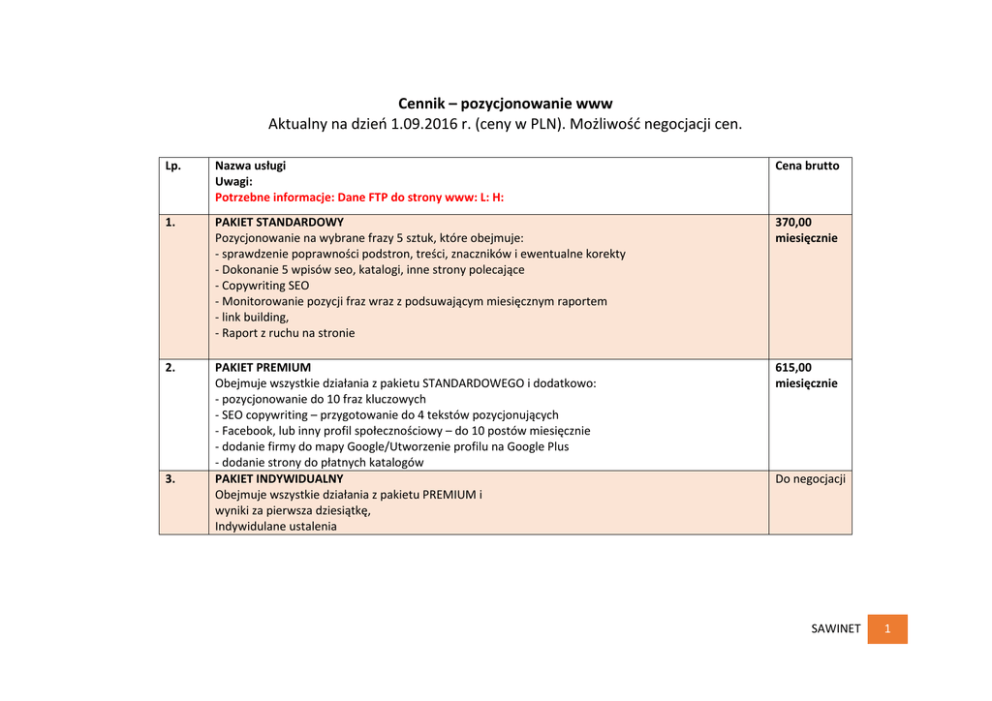 Cennik – pozycjonowanie www Aktualny na dzień 1.09.2016 r. (ceny w PLN). Możliwość negocjacji cen. Lp. Nazwa usługi Uwagi: Potrzebne informacje: Dane FTP do strony www: L: H: Cena brutto 1. PAKIET STANDARDOWY Pozycjonowanie na wybrane frazy 5 sztuk, które obejmuje: - sprawdzenie poprawności podstron, treści, znaczników i ewentualne korekty - Dokonanie 5 wpisów seo, katalogi, inne strony polecające - Copywriting SEO - Monitorowanie pozycji fraz wraz z podsuwającym miesięcznym raportem - link building, - Raport z ruchu na stronie 370,00 miesięcznie 2. PAKIET PREMIUM Obejmuje wszystkie działania z pakietu STANDARDOWEGO i dodatkowo: - pozycjonowanie do 10 fraz kluczowych - SEO copywriting – przygotowanie do 4 tekstów pozycjonujących - Facebook, lub inny profil społecznościowy – do 10 postów miesięcznie - dodanie firmy do mapy Google/Utworzenie profilu na Google Plus - dodanie strony do płatnych katalogów PAKIET INDYWIDUALNY Obejmuje wszystkie działania z pakietu PREMIUM i wyniki za pierwsza dziesiątkę, Indywidulane ustalenia 615,00 miesięcznie 3. Do negocjacji SAWINET 1