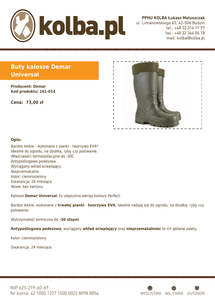 Buty kalosze Demar Universal Producent: Demar Kod produktu: 161-014 Cena: 73,00 zł Opis: Bardzo lekkie - wykonane z pianki - tworzywo EVA* Idealne do ogrodu, na działkę, ryby czy polowanie. Właściwości termoizolacyjne do -30C Antypoślizgowa podeszwa. Wyciągany wkład ocieplający Nieprzemakalne. Kolor: ciemnozielony Gwarancja: 24 miesiące Nowe, bez kartonu Kalosze Demar Universal, to ulepszona wersja kaloszy Perfect. Bardzo lekkie, wykonane z trwałej pianki - tworzywa EVA, idealne nadają się do ogrodu, na działkę, ryby czy polowanie. Wytrzymałość termiczna do -30 stopni. Antypoślizgowa podeszwa, wyciągany wkład ocieplający oraz nieprzemakalnośc to ich główne zalety. Kolor: ciemnozielony Gwarancja: 24 miesiące