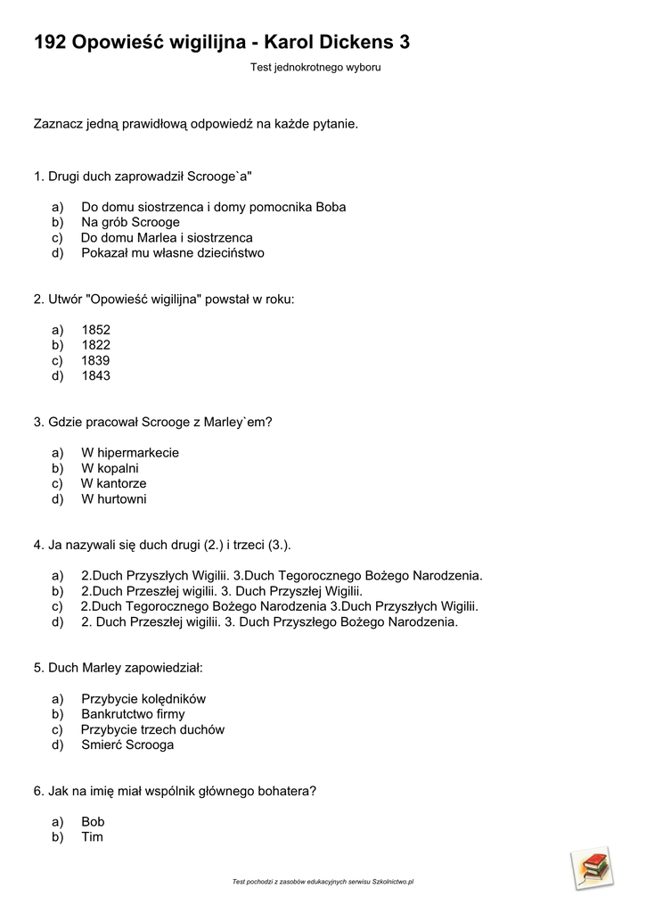 192 Opowieść wigilijna - Karol Dickens 3 Test jednokrotnego wyboru Zaznacz jedną prawidłową odpowiedź na każde pytanie. 1. Drugi duch zaprowadził Scrooge`a" a) b) c) d) Do domu siostrzenca i domy pomocnika Boba Na grób Scrooge Do domu Marlea i siostrzenca Pokazał mu własne dzieciństwo 2. Utwór "Opowieść wigilijna" powstał w roku: a) b) c) d) 1852 1822 1839 1843 3. Gdzie pracował Scrooge z Marley`em? a) b) c) d) W hipermarkecie W kopalni W kantorze W hurtowni 4. Ja nazywali się duch drugi (2.) i trzeci (3.). a) b) c) d) 2.Duch Przyszłych Wigilii. 3.Duch Tegorocznego Bożego Narodzenia. 2.Duch Przeszłej wigilii. 3. Duch Przyszłej Wigilii. 2.Duch Tegorocznego Bożego Narodzenia 3.Duch Przyszłych Wigilii. 2. Duch Przeszłej wigilii. 3. Duch Przyszłego Bożego Narodzenia. 5. Duch Marley zapowiedział: a) b) c) d) Przybycie kolędników Bankrutctwo firmy Przybycie trzech duchów Smierć Scrooga 6. Jak na imię miał wspólnik głównego bohatera? a) b) Bob Tim Test pochodzi z zasobów edukacyjnych serwisu Szkolnictwo.pl c) d) Jakub Fred 7. Akcja powieści rozgrywa się: a) b) c) d) w XX wieku w XIV wieku w XIX wieku w XVIII wieku 8. Gdzie główny bohater spędził Wigilię Bożego Narodzenia? a) b) c) d) długo siedział w kantorze zjadł kolację u Freda był sternikiem na statku rybackim spotkał się z żoną 9. Główny bohater był: a) b) c) d) Przedsiębiorcą, skąpcem Sprzedawcą, miłym człowiekiem Porzyczkodawcą Maklerem giełdowym 10. Co Scrooge podarował rodzinie Boba w pierwszy dzień świąt? a) b) c) d) upieczoną gęś dużo pieniędzy ogromnego indyka podwyżkę 11. Siostrzeniec Scrooga przyszedł do niego: a) b) c) d) Po pieniądzie Na urodziny Zaprosić go na święta Odwiedzić wuja 12. W nocy Scrooga odwiedził: a) b) c) d) Mały Tim Siostra Kolega Duch zmarłego przyjaciela- Marley 13. Jak ma na imię siostrzeniec Ebenezera? Test pochodzi z zasobów edukacyjnych serwisu Szkolnictwo.pl a) b) c) d) Jakub Marley Bob Fred 14. W jaki czasie rozgrywa się akcja? a) b) c) d) w średniowieczu w XXI wieku w dalekiej przyszłości w XIX wieku 15. Główny bohater mieszkał z: a) b) c) d) mieszkał sam z żoną z siostrą z żoną i dziećmi Test pochodzi z zasobów edukacyjnych serwisu Szkolnictwo.pl