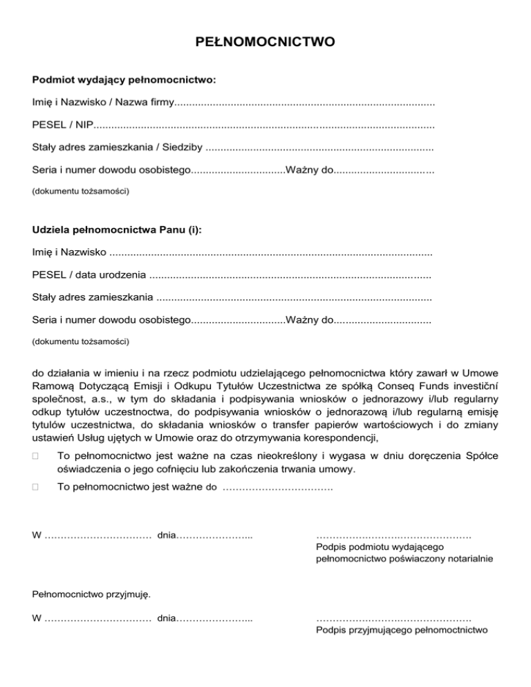 PEŁNOMOCNICTWO Podmiot wydający pełnomocnictwo: Imię i Nazwisko / Nazwa firmy........................................................................................ PESEL / NIP................................................................................................................... Stały adres zamieszkania / Siedziby ............................................................................. Seria i numer dowodu osobistego................................Ważny do.................................. (dokumentu tożsamości) Udziela pełnomocnictwa Panu (i): Imię i Nazwisko ............................................................................................................. PESEL / data urodzenia ............................................................................................... Stały adres zamieszkania ............................................................................................. Seria i numer dowodu osobistego................................Ważny do................................. (dokumentu tożsamości) do działania w imieniu i na rzecz podmiotu udzielającego pełnomocnictwa który zawarł w Umowe Ramową Dotyczącą Emisji i Odkupu Tytułów Uczestnictwa ze spółką Conseq Funds investiční společnost, a.s., w tym do składania i podpisywania wniosków o jednorazowy i/lub regularny odkup tytułów uczestnoctwa, do podpisywania wniosków o jednorazową i/lub regularną emisję tytulów uczestnictwa, do składania wniosków o transfer papierów wartościowych i do zmiany ustawień Usług ujętych w Umowie oraz do otrzymywania korespondencji, To pełnomocnictwo jest ważne na czas nieokreślony i wygasa w dniu doręczenia Spółce oświadczenia o jego cofnięciu lub zakończenia trwania umowy. To pełnomocnictwo jest ważne do ……………………………. W …………………………… dnia…………………... …………….……….…………………. Podpis podmiotu wydającego pełnomocnictwo poświaczony notarialnie Pełnomocnictwo przyjmuję. W …………………………… dnia…………………... …………….……….…………………. Podpis przyjmującego pełnomoctnictwo