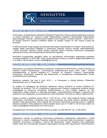 FUNDUSZE UE – DZIAŁANIE 2.2. RPO WM Informujemy, że Mazowiecka Jednostka Wdrażania Programów Unijnych planuje ogłoszenie konkursu w ramach Działania 2.2. „Rozwój e-usług” Regionalnego Programu Operacyjnego Województwa Mazowieckiego. Wnioski o dofinansowanie będzie można składać w okresie czerwiec – lipiec 2012 r. W ramach konkursu wsparcie udzielane będzie na projekty mające na celu rozwój e-usług dla obywateli. O dofinansowanie mogą ubiegać się jednostki samorządu terytorialnego ich związki i stowarzyszenia, zakłady opieki zdrowotnej działające w publicznym systemie ochrony zdrowia (zakontraktowane z NFZ), jednostki naukowe, szkoły wyższe, jednostki sektora finansów publicznych posiadające osobowość prawną oraz przedstawiciele administracji rządowej. Kancelaria przygotowała specjalną ofertę na sporządzenie dokumentacji aplikacyjnej projektów w ramach Działania 2.2 RPO WM. Osoby zainteresowane prosimy o kontakt z Małgorzatą Nejfeld pod nr 22 499 51 80 lub adres e-mail [email protected]. SPOTKANIE INFORMACYJNE – DZIAŁANIE 6.1. POIG Zapraszamy na spotkanie informacyjne poświęcone możliwościom aplikowania o środki finansowe na wsparcie działań eksportowych i promocyjnych podejmowanych przez mikro, małe i średnie przedsiębiorstwa w ramach Działania 6.1 „Paszport do eksportu” Programu Operacyjnego Innowacyjna Gospodarka. Szkolenie jest dedykowane w szczególności przedstawicielom branży architektonicznej i budowlanej. Spotkanie odbędzie się dnia 6 lipca 2012 r., w Warszawie w Szkole Biznesu Politechniki Warszawskiej, przy ul. Koszykowej 79. W związku ze zbliżającym się terminem ogłoszenia naboru wniosków w ramach Działania 6.1 „Paszport do eksportu” PO IG, chcielibyśmy zaproponować Państwu przekazanie unikalnej wiedzy pozwalającej na skuteczne pozyskanie dofinansowania na rzecz działań mających na celu zwiększenie udziału eksportu w całkowitej sprzedaży, zintensyfikowanie powiązań z zagranicznymi partnerami oraz zwiększenie rozpoznawalności marki handlowej i firmowej na rynkach zagranicznych. Opłata za udział w spotkaniu wynosi 160 zł + VAT lub zw. z VAT. Cena obejmuje również materiały informacyjne, konsultacje z ekspertem oraz przerwę kawową. Aby wziąć udział w spotkaniu należy wypełnić kartę zgłoszeniową, która znajduje się na stronie internetowej www.kdg.waw.pl w zakładce aktualne szkolenia. Kartę zgłoszenia należy przesłać faxem pod nr 12 350 47 32 lub skan mailem na adres [email protected] do dnia 2 lipca. Szczegółowych informacji udziela Pani Katarzyna Jaślar, tel. 600 955 407, tel. 12 384 80 80. SPOTKANIE INFORMACYJNE – LOKALE SOCJALNE Zapraszamy również na spotkanie informacyjne poświęcone możliwościom aplikowania o środki finansowe w ramach rządowego Programu wsparcia na tworzenie lokali komunalnych, socjalnych, mieszkań chronionych, noclegowni i domów dla bezdomnych. Celem Programu jest zwiększenie zasobu lokali oraz pomieszczeń służących zaspokajaniu potrzeb osób najuboższych. Dofinansowanie można przeznaczyć zarówno na budowę nowego obiektu lub remont istniejącego, przebudowę, zmianę sposobu użytkowania czy też nabycie lokali. Zmiany wprowadzone w programie począwszy od jesieni 2009 r. istotnie poszerzyły zakres wsparcia i zwiększyły jego rozmiary. Spotkanie adresowane jest przede wszystkim do przedstawicieli jednostek samorządu terytorialnego oraz organizacji pożytku publicznego działających w obszarze przedsięwzięć polegających na tworzeniu noclegowni, domów dla bezdomnych czy mieszkań chronionych. Spotkanie odbędzie się w dniu 26 czerwca 2012 r. w Poznaniu. Opłata za udział w spotkaniu wynosi 320 zł + VAT lub zw. z VAT. Cena obejmuje również materiały informacyjne, konsultacje z ekspertem oraz przerwę kawową. Aby wziąć udział w spotkaniu należy wypełnić kartę zgłoszeniową, która znajduje się na stronie internetowej www.kdg.waw.pl w zakładce aktualne szkolenia. Kartę zgłoszenia należy przesłać faxem pod nr 12 350 47 32 lub skan mailem na adres [email protected] do dnia 21 czerwca.