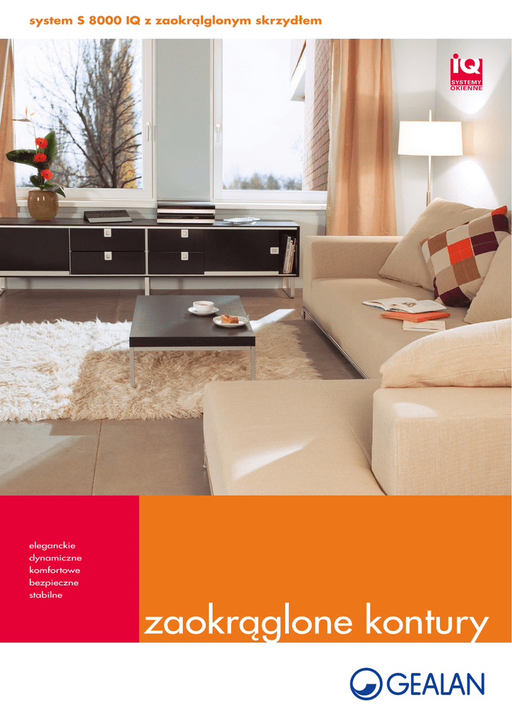 system S 8000 IQ z zaokrąlglonym skrzydłem eleganckie dynamiczne komfortowe bezpieczne stabilne zaokrąglone kontury Kwestia spojrzenia system S 8000 IQ z zaokrąlglonym skrzydłem Widok od wewnątrz Widok z zewnątrz Wygląd Technika Wiele osób, urządzając dom czy też mieszkanie, ogromną wagę przykłada do wypracowania własnego stylu i pełnej harmonii detali. Dla nich okna z systemu profili S 8000 IQ są właściwym rozwiązaniem. Spełniają wszystkie wymogi nowoczesnego wyposażenie mieszkania i podkreślają indywidualny styl właściciela. Zamiłowanie do wyjątkowości przekłada się bowiem na harmonijną całość. Na oryginalną estetykę składają się zarówno kontury okien, jak i zaokrąglone listwy przyszybowe.Tym samym można wyrazić swoją indywidualność i styl życia. Okna z systemu profili S 8000 IQ gwarantują znakomitą izolację cieplną dzięki wielokomorowej konstrukcji i głębokości skrzydła 84,5 mm. Zastosowanie dużych stalowych wzmocnień w ościeżnicy i skrzydle zapewnia wysoką statykę i umożliwia montaż dużych okien, odpornych na znaczne obciążenia wiatrem. A ponieważ ochrona i bezpieczeństwo są ważnymi kryteriami wyboru okien, okna w systemie S 8000 IQ mogą zostać wyposażone w antywłamaniowe szyby i okucia. więcej informacji na www.gealan.pl ościeżnica 8001/ skrzydło 8068 ościeżnica 8001/ skrzydło 8096 1 znakomita termoizolacja za sprawą wielokomorowej budowy 1 bardzo dobra statyka dzięki dużym wzmocnieniom stalowym w ościeżnicy i skrzydle 2 brązowy podkład profilu w oknach w okleinach nadaje naturalny wygląd przy otwartym oknie 2 3 4 5 2 1 6 2 złoty dąb 5 dąb bagienny 3 ciemny dąb 6 orzech © www.gdl-marketing.de / 2008 4 mahoń * profile w okleinach dostępne są w wersji 8001/8068 o tym samym kształcie zewnętrznym co 8001/8096 Partner firmy GEALAN chętnie Państwu doradzi: 2 3 4 5 6 standardowa paleta profili acrylcolor * standardowe okleiny drewonpodobne* 1 oregon IV 3 na zewnątrz klasyczne kontury z zaokrąglonymi krawędziami 1 kremowy / RAL 9001 5 brąz sepii / RAL 8014 9 granatowy / RAL 5011 2 szarość agatu / RAL 7038 6 ciemny brąz / 02 10 zieleń mchu / RAL 6005 3 szary / RAL 7040 7 ciemnoczerwony / RAL 3011 11 silber 4 szarość łupka / RAL 7015 8 niebieski ultramaryna / RAL 5002 profile acrylcolor dostępne są w wersji 8003/8065 o tym samym kształcie co 8001/8068 i 8001/8096 7 8 9 10 11 © www.gdl-marketing.de / 2008 1 1 3 3 atrakcyjne okleiny drewnopodobne umożliwiają najprzeróżniejsze warianty wykończenia 2 2 łatwe czyszczenie dzięki półukośnym wrębom 1 Art.-Nr. 070798 PL G 1 3