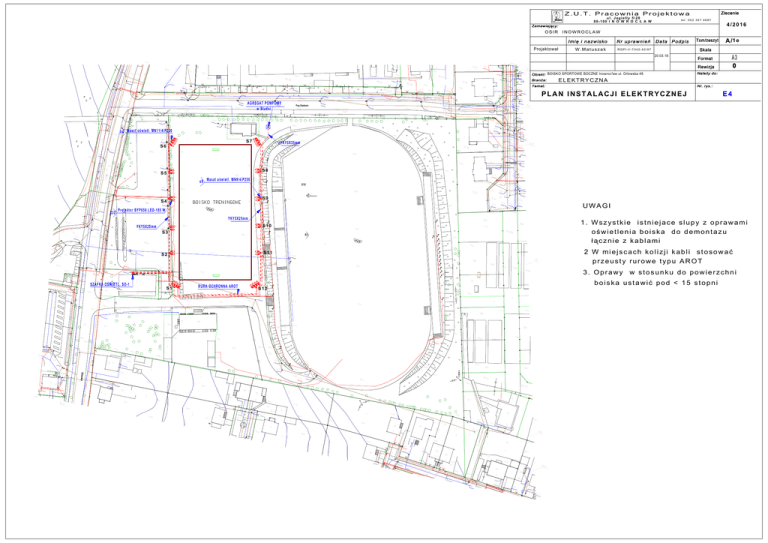 Zlecenie Z.U.T. Pracownia Projektowa ro jb is ul. Jagiełły 5\28 88-100 I N O W R O C Ł A W tel. 052 357 4687 4/2016 Zamawiający: OSIR INOWROCLAW I m i ę i n a z w is k o Projektował W.Matuszak N r u p ra w n i e ń Data Podpis 20.03.16 97.41 0 kd 16 0 16 0 kd 16 0 kd bet. m 95.88 15/26 97.80 95 .87 96.51 wA200 S2 94.18 i k150 99.36 100.2 1 98.89 0 96.39 k 343/11 96.30 eN A RI bet. g 96.86 95.02 t95.95 94.90 96.55 95.98 w40 94.25 94 .53 84 95.21 96.04 95.32 95.90 k e gA 10 0 w Pows 95 .64 tañc j.asf. 96.37 95.62 m2 m2 9 st ks 30 0 a Kwia tkowsk iego 95.95 94.75 eNt 83/1 i 94.92 95.93 bet. st 92.95 95.22 13 95 .76 95.16 95.81 95.12 st 15a k 95.11 92 .11 i k 95.11 93.87 eN st g50 95 .33 t 95.29 95.23 t eN k 94 .33 95.3 6 96.57 94.49 94.16 m2 i 95 .39 0 Powsgta ñca 95.62 Kwia tkow w8 0 skie95 go.17 94 .4 9 83/2 w32 m2 95.50 k10 eN B asf. 11 k100 g 348 85_54 k w3 5 5 96.72 st 95 95.86 .78 93.82 k RI 11a 95.08 st g5 0 96.96 96.02 g 97.00 g 96.38 94.17 95.17 k gA10 0 eN gA50 eN bet. Bp 8 ks 16 0 .0 97 bet. 86_5 4 96.02 96.59 m2 95.28 96.36 7 96.02 12 k 7/2 x2 96 .86 m2 k150 m2 98.25 95.20 93.82 96 .14 bet. t w m 13 95.84 7/1 st 10_54 95.5 97.09 97.5 99 .23 98.00 99.22 96.02 .5 96 t 99 .04 k 6 98 .03 96.0 t 98 .0 g100 99.29 98 .90 99.12 98.54 98.5 101.5 99.5 100 .0 3 98.23 97.28 g 4 14_54 99.20 99 .08 343/ 93.88 g 97.78 bet. bet. bet. k100 w k k g ww w ch.bet. bet. 99.54 98.84 99 .74 w80 99.71 ch.bet. m2 asf. 99 .12 g63 w25 6 7 eNB 5 99 .24 g50 99.25 15 ch.bet. k16 0 42 bet. 99.71 89.21 5 m2 95.11 93 .31 k w w3 2 93.39 354 343/5 m2 99.59 100.89 97.74 97 .14 95.77 94 .88 101.0 w32 43 j.asf. 97.58 349 97.91 k eNA t 101.01 101.7 1 96.49 k150 99.94 100.4 5 16 ciepl. . 94.37 98.02 97.61 101.02 10.53 101.3 96.58 96.13 97.73k i 101.9 114/10 97 .81 i 3 m ciepl ciepl. 95 .39 94.84 k 101.16 100.5 1 eN 101.99 101.29 i 101.63 99.63 wA25 Bi 2/2 98 .13 99.74 98 .46 ciepl . 99.64 4 k w 101.7 7 98.49 eNA w t eN ks160 bet. 101.22 w 101.01 i 100.66 w 101.00 w Orłowska eN 102.5 99.12 ks16 0 355 95.11 98.09 99.71 98.5 8 98.51 100.9 7 m k 101.18 w w w32 w w 96.33 100.4 1 . j.asf 44 101.11 k 99 .36 100.4 9 101.16 bet. 92.26 Br/RI 350 95.84 t 100.76 101.14 ks160 100.02 101.2 1 b eN 101.9 101.2 5 k15 k k 114/9 100.07 94 .95 96.32 48 ch.asf. eN w k 100.9 5 100.07 100.2 5 Bi w k b2 100.5 0 100.7 1 102.0 0 98 .67 97.25 100.3 6 100.64 100.7 4 101.12 RI ch.bet. 98.83 95.19 w stosunku do powierzchni boiska ustawić pod < 15 stopni 96.12 100.10 100.7 3 100.6 2 3. Oprawy 94 .96 95 .78 bet. ciepl. 98.17 98.11 96.32 96.37 rów 115/1 ciepl . dr 98.74 96 .37 100.5 w 100.5 9 9 99 .8 t k 96.3996.39 98.79 j.asf. 99.40 99.31 99.91 asf. ch.bet. 2eNA 2eNA 99.25 eN 100.54 eNA 99.91 99.79 S12 98.85 k100 bet. 100.4 6 100.2 5 ciepl. eNA 100.0 3 wA50 100.3 4 . 100.6 5 351 w w32 t 100.3 3 98 .64 98.64 RURA OCHRONNA AROT S1 bet. 100.3 5 98.74 eeNA 100.3 4 114/11 ciepl 95.91 100.14 100 .24 100.19 e 2/3 2 W miejscach kolizji kabli stosować przeusty rurowe typu AROT 357 352 95.20 k 100.4 2 99.18 96 .25 94.98 99 .70 k 99.90 99.27 Bi x 100.16 wA150 99.7 100.4 k 5 99.5 6 98.82 99 .77 eNA k150 98.65 SZAFKA OŚWIETL. SO-1 100.3 k200 t 95.02 t 98 .01 kd 20 0 9 S11 wA200 eN 100.4 t 99.2 1. Wszystkie istniejace slupy z oprawami oświetlenia boiska do demontazu łącznie z kablami 358 g50 w 99.9 4 w 98.65 99.98 98 .51 100.15 98.5 3 k 100.08 99.25 100.48 99.68 114 100/1 .213_ 53 e eN t eN p w80 e t ch.bet. Ba k eN UWAGI 95 .27 100.3 3 Bz 100.07 99.47 100.01 k 99 .93 k 343/5 8 X4 100.4 9 98.76 98 .26 95.20 w k 99.98 93.31 wA150 98.65 100.7 4 100.8 5 94 .41 93.85 kd150 w 94 .4 0 Br/RI 95.87 beton 100.01 114/14 kd300 98.45 99.84 100.65 100.5 4 bet. 100.8 1 S10 98.55 S3 ch.bet. 100.9 1 kd150 15/36 eN 1 j.bet. 100.92 99.77 99.95 100.04 93.22 94 .42 353 wA50 100.02 97 .57 99.47 97 .93 k 99.40 98 .12 99.72 100.8 6 99.0 YKY5X25mm YKY5X25mm eNA 118 94.53 93.18 94.50 94.05 95.15 94.48 w32 k 93.36 ks200 k w kd200 94.38 eNA 100.86 98.28 95.78 98.37 Bi 99.49 97.04 99.60 97.38 beton 99.21 k 15/34 96 .23 100.9 4 100.35 k 94 .5 1 k 94 .7 3 93.51 st g63 94.58 94.73 93.53 k 99.63 97 99.89 .14 eN 98 .5 3 98.43 97 .2 1 Projektor BYP6502/1LED-185 W X32 BieN k 94 .55 15/33 x2 S9 98.50 98.48 15/32 94.53 93.82 94.52 st kd16 94.28 0 93 .25 kd200 ch.asf. 99.43 k 96 99.43 .83 96 .93 99.54 99.62 kd20 0 k S99.214 99.47 X16 95.82 kd250 94.42 93 .46 E4 15/35 w 93.49 t 99.8 100.5 2 k 99.63 97.56 94.49 93.79 98.33 k 94 .63 k 99.13 97.81 99.17 eN 99.47 k 98.87 kd300 99.32 97 .56 95.42 98.18 eN eNA eN 100.2 99.05 97 .81 99.32 99.26 m 98.39 j.asf. x8 Maszt oświetl. MN9/4/P250 eNA 99.40 g40 94.28 g63 g ks160 w32 94.3693.23 93.02 94.82 99.19 99.26 S8 98.15 kd200 t 98.33 98 .23 Nr. rys.: w32 g110 S5 eN ks200 Or owska 99.01 ks200 98.26 98.82 97.56 99.07 kd150 94.61 w g63 ks150 eN w110 99.02 k300 98.97 9 kd200 eN 94.53 k 98 .98 ELEKTRYCZNA 15/31 eNA 95.88 95.93 97 .82 0 NaleŜy do: g40 98.04 j.bet. eN beton A3 Rewizja 94.68 g 94.5 4 92.92 w 94.70 .92 93 YKY5X35mm B 96.44 eN t S7 Format PLAN INSTALACJI ELEKTRYCZNEJ t 94.55eN 94.76 g63 93 94 .81 93.40 .6g8 .78 94 .72 9494 95.33 94 94.93 93 .67 .74 .87 93.33 0 92.43 93.82 kkd15t kd16 94 .68 0 95.22 kd160 93.86 k k 93.24 w ks150 w32 k k 94 .70 wks160 k w32 94.67 ks160 94 93.41 g63 .80 93.70 94 .62 94.68 92.90 w zb.gaz 93.93 u e eN ch.bet. 96.94 97.60 97.7 1 94 .96 93.55 bet. 5 g2 ch.asf. wA150 98.71 96.09 ch.bet. 97.63 S6 k t 95.38 96.83 97.69 bet. 98.57 97.45 eN 100.0 kd 16 eNA w3 2 eN kd200 97.69 94.83 94.76 9394 .73 .82 94 .85 94 g k k 94.80 .7794.76g63 9493 .85.7 1 t 92.56 ch.asf. ch.asf. i X4 Maszt oświetl. MN11/4/P250 98.56 eN 95.02 1 98.61 96.85 94.84 93.87 93.24 94.85 Przy Stadionie 15/25 t 95.83 Bi 97 k .67 k150 97.65 f. 94.9 1 w90 94.54 93 .04 k w32 w ks150 k 94.44 ww w 94 .71 93 .04 ww w 94 w 94 .71 .72 A /1 e w110 k eN k 97.67 t 95 .10 k 93.08 95.01 93.88 95 .34 95.44 94.00 95.8 1 BranŜa: Temat: e kd150 94.72 94.86 t 2 ks200 Henryka Czamana 97.85 94.91 93.81 k 95.44 93.5 7 95 .68 ch.bet. w32 st 0 kd16 k 95.78 94 .16 96.24 ch.