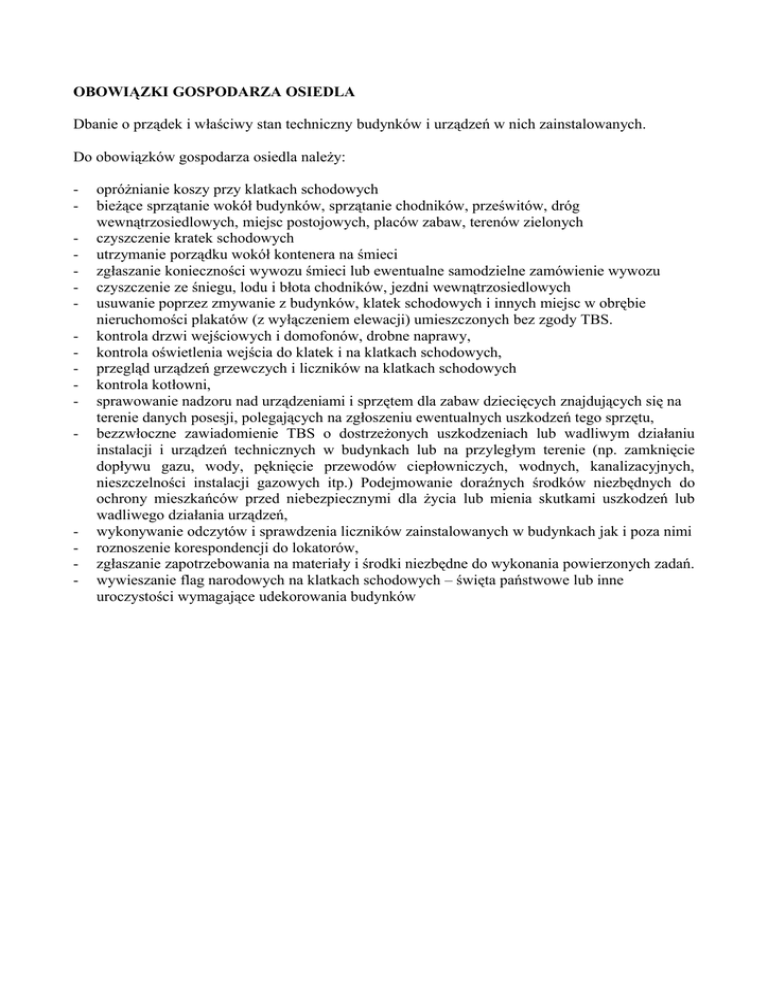OBOWIĄZKI GOSPODARZA OSIEDLA Dbanie o prządek i właściwy stan techniczny budynków i urządzeń w nich zainstalowanych. Do obowiązków gospodarza osiedla należy: - - opróżnianie koszy przy klatkach schodowych bieżące sprzątanie wokół budynków, sprzątanie chodników, prześwitów, dróg wewnątrzosiedlowych, miejsc postojowych, placów zabaw, terenów zielonych czyszczenie kratek schodowych utrzymanie porządku wokół kontenera na śmieci zgłaszanie konieczności wywozu śmieci lub ewentualne samodzielne zamówienie wywozu czyszczenie ze śniegu, lodu i błota chodników, jezdni wewnątrzosiedlowych usuwanie poprzez zmywanie z budynków, klatek schodowych i innych miejsc w obrębie nieruchomości plakatów (z wyłączeniem elewacji) umieszczonych bez zgody TBS. kontrola drzwi wejściowych i domofonów, drobne naprawy, kontrola oświetlenia wejścia do klatek i na klatkach schodowych, przegląd urządzeń grzewczych i liczników na klatkach schodowych kontrola kotłowni, sprawowanie nadzoru nad urządzeniami i sprzętem dla zabaw dziecięcych znajdujących się na terenie danych posesji, polegających na zgłoszeniu ewentualnych uszkodzeń tego sprzętu, bezzwłoczne zawiadomienie TBS o dostrzeżonych uszkodzeniach lub wadliwym działaniu instalacji i urządzeń technicznych w budynkach lub na przyległym terenie (np. zamknięcie dopływu gazu, wody, pęknięcie przewodów ciepłowniczych, wodnych, kanalizacyjnych, nieszczelności instalacji gazowych itp.) Podejmowanie doraźnych środków niezbędnych do ochrony mieszkańców przed niebezpiecznymi dla życia lub mienia skutkami uszkodzeń lub wadliwego działania urządzeń, wykonywanie odczytów i sprawdzenia liczników zainstalowanych w budynkach jak i poza nimi roznoszenie korespondencji do lokatorów, zgłaszanie zapotrzebowania na materiały i środki niezbędne do wykonania powierzonych zadań. wywieszanie flag narodowych na klatkach schodowych – święta państwowe lub inne uroczystości wymagające udekorowania budynków OBOWIĄZKI OSOBY SPRZĄTAJĄCEJ: Ogólne - utrzymanie w należytym stanie sanitarnym i porządkowym klatek schodowych, wiatrołapów, suszarni, wózkowni, korytarzy piwnicznych oraz innych pomieszczeń na terenie nieruchomości przeznaczonych do wspólnego użytku - sprzątanie wózkowni, pralni, suszarni, strychów i korytarzy piwnicznych według potrzeb wynikających ze stanu sanitarnego tych pomieszczeń lub na indywidualne polecenie - informowanie Administracji o zauważonych nieprawidłowościach uszkodzeniach lub innych zdarzeniach mogących mieć związek z szeroko pojętym użytkowaniem budynków Szczegółowe - sprzątanie klatek schodowych – 1 raz w tygodniu - czyszczenie drzwi wejściowych – 1 raz w tygodniu - czyszczenie ścian wykładanych glazurą lub malowanych farbą nadającą się do zmywania, okien i parapetów okiennych na klatkach schodowych oraz w innych pomieszczeniach wspólnego użytku wg potrzeb, ale nie rzadziej niż 1 raz w miesiącu - czyszczenie poręczy wg potrzeb, ale nie rzadziej niż 2 razy w miesiącu - czyszczenie parapetów wg potrzeb, ale nie rzadziej niż 2 razy w miesiącu - Czyszczenie okien na klatkach schodowych i w piwnicach wg potrzeb, ale nie rzadziej niż co 3 miesiące - Sprzątanie piwnic wg potrzeb, ale nie rzadziej niż co 3 miesiące – pierwszy tydzień stycznia, kwietnia, lipca i października