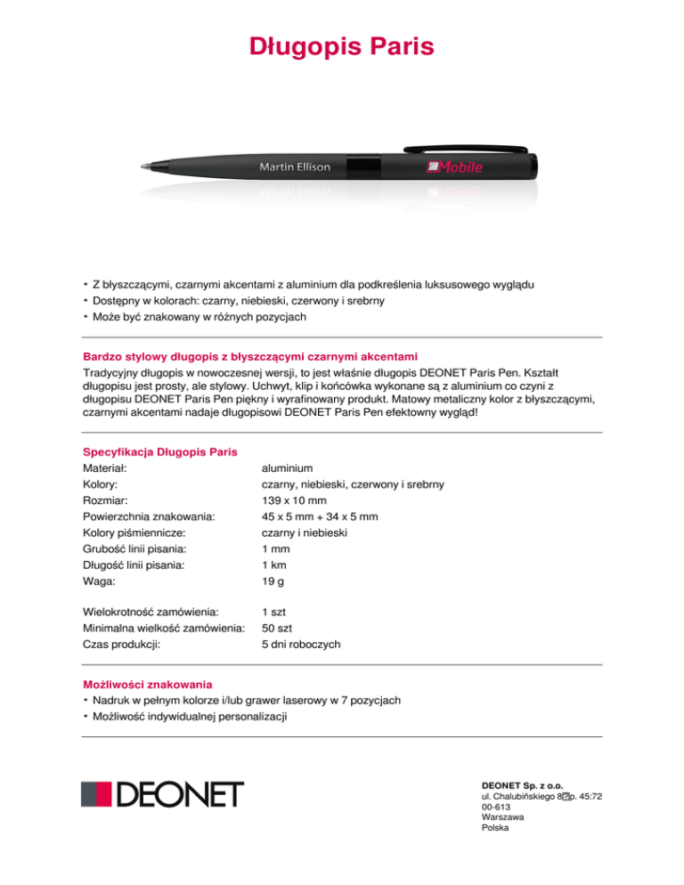 Długopis Paris . Z błyszczącymi, czarnymi akcentami z aluminium dla podkreślenia luksusowego wyglądu . Dostępny w kolorach: czarny, niebieski, czerwony i srebrny . Może być znakowany w różnych pozycjach Bardzo stylowy długopis z błyszczącymi czarnymi akcentami Tradycyjny długopis w nowoczesnej wersji, to jest właśnie długopis DEONET Paris Pen. Kształt długopisu jest prosty, ale stylowy. Uchwyt, klip i końcówka wykonane są z aluminium co czyni z długopisu DEONET Paris Pen piękny i wyrafinowany produkt. Matowy metaliczny kolor z błyszczącymi, czarnymi akcentami nadaje długopisowi DEONET Paris Pen efektowny wygląd! Specyfikacja Długopis Paris Materiał: aluminium Kolory: czarny, niebieski, czerwony i srebrny Rozmiar: 139 x 10 mm Powierzchnia znakowania: 45 x 5 mm + 34 x 5 mm Kolory piśmiennicze: czarny i niebieski Grubość linii pisania: 1 mm Długość linii pisania: 1 km Waga: 19 g Wielokrotność zamówienia: 1 szt Minimalna wielkość zamówienia: 50 szt Czas produkcji: 5 dni roboczych Możliwości znakowania . Nadruk w pełnym kolorze i/lub grawer laserowy w 7 pozycjach . Możliwość indywidualnej personalizacji DEONET Sp. z o.o. ul. Chalubiñskiego 8 p. 45:72 00-613 Warszawa Polska Opakowania Pudełko Frame Etui na długopis Pudełko Tube Pudełko na długopis DEONET Sp. z o.o. ul. Chalubiñskiego 8 p. 45:72 00-613 Warszawa Polska Powered by TCPDF (www.tcpdf.org)