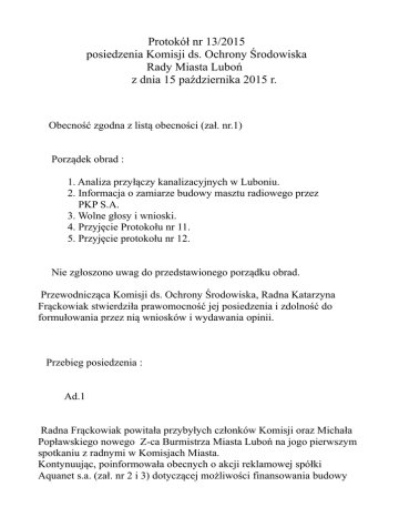 Protokół nr 13/2015 posiedzenia Komisji ds. Ochrony Środowiska Rady Miasta Luboń z dnia 15 października 2015 r. Obecność zgodna z listą obecności (zał. nr.1) Porządek obrad : 1. Analiza przyłączy kanalizacyjnych w Luboniu. 2. Informacja o zamiarze budowy masztu radiowego przez PKP S.A. 3. Wolne głosy i wnioski. 4. Przyjęcie Protokołu nr 11. 5. Przyjęcie protokołu nr 12. Nie zgłoszono uwag do przedstawionego porządku obrad. Przewodnicząca Komisji ds. Ochrony Środowiska, Radna Katarzyna Frąckowiak stwierdziła prawomocność jej posiedzenia i zdolność do formułowania przez nią wniosków i wydawania opinii. Przebieg posiedzenia : Ad.1 Radna Frąckowiak powitała przybyłych członków Komisji oraz Michała Popławskiego nowego Z-ca Burmistrza Miasta Luboń na jogo pierwszym spotkaniu z radnymi w Komisjach Miasta. Kontynuując, poinformowała obecnych o akcji reklamowej spółki Aquanet s.a. (zał. nr 2 i 3) dotyczącej możliwości finansowania budowy przyłączy kanalizacji sanitarnej za ich pośrednictwem za kwotę 1785 zł brutto z której do tej pory skorzystało 54 posesji na 175 zgłoszonych. Z-ca Popławski potwierdził o przeprowadzanej akcji przez spółkę i przekazał, że istnieje możliwość rozłożenia inwestycji na raty jak wynika z ulotki a w szczególnych udokumentowanych sytuacjach Aqanet S.A. odstąpi od egzekwowania należności za Budowę przyłącza co wzbudziło aprobatę wśród radnych. Radny Wolniewicz zapytał, czy mieszkańcy ul. Chopina mieszkających w budynku PKP a nie będący właścicielami mogą również z korzystać z „Promocji Aquanet”? W odpowiedzi Z-ca Popławski odparł, że zadanie to należy do PKP a czy przyłącze zostanie wykonane sprawdzi. Wracając do możliwości wykonania przyłącza sanitarnego „na raty” radna Frąckowiak zapytała o taką możliwość z korzystania osób o średnich dochodach na rodzinę? Z-za Popławski zapewnił, że dopyta o taką możliwość na najbliższym spotkaniu w Spółce Aqanet S.A. Radny Goryniak przybył na KOŚ o 17-15 Radna Frąckowiak poinformowała Burmistrza i radnych o piśmie (zał.nr 4) docierającym do mieszkańców, nakazującym wykonanie przyłącza w terminie 6 miesięcy nie zgodnym z Regulaminem Utrzymania Miasta w Czystości. Z-ca Popławski poprosił o ksero kopii dokumentu i podtrzymał stanowisko radnej o braku takiego zapisu w Regulaminie dodając, że termin ten jest określony jako „niezwłocznie” co ma zachęcić mieszkańców do szybkiego przyłączenia się do sieci kanalizacyjnej. Ad.2 Radna Frąckowiak poinformowała o planowanej inwestycji budowy 40 m. masztu radiowego przez PKP co wzburzyło zebranych radnych. Z-ca Popławski potwierdził i przedstawił dwie lokalizacje zaproponowane przez PKP : - między torami na wysokości ul. Podgórnej (w stronę Mosiny) - za „budką dróżnika 112” (w stronę Mosiny) przy otulinie Wielkopolskiego Parku Narodowego. Mówiąc dalej Z-ca Popławski poinformował, że inwestycja jest nieunikniona i ma za zadanie zwiększenie bezpieczeństwa w szybkim przemieszczaniu się pociągów na trasie Poznań-Wrocław a Miasto będzie robiło wszystko aby oddalić maksymalnie maszt od domostw. Radny Goryniak wyraził obawę czy PKP nie zechce wykorzystać masztu dla telefonii komórkowej a Radny Wolniewicz nawiązał do próby budowy masztów przy ul. Kołątaja i Sobieskiego gdzie Starosta Powiatowy odmówił cofając „Pozwolenia na budowę”. Z-ca Popławski stwierdził, że maszt powstanie a PKP szuka właściwej lokalizacji. Radna Franek opuściła zebranie KOŚ o 17-50 Ad.3 W dalszej części zebrania Radni poruszali spraw komunalnych Miasta dotyczących chodników i odwodnień w rejonie Lasku. Ad.4 Członkowie Komisji Ochrony Środowiska pozytywnie zaopiniowali przyjęcie protokołu 11/2015. 4 głosy- ZA 1 wstrzymujący Ad.5 Członkowie Komisji Ochrony Środowiska pozytywnie zaopiniowali przyjęcie protokołu 12/2015. 4 głosy- ZA 1 wstrzymujący Posiedzenie KOŚ rozpoczęto o godz. 17-00 a zakończono pracę o 18-30. Przewodnicząca Komisji – Katarzyna Frąckowiak Sekretarz – Hieronim Gawelski Załączniki : - (1) – Lista obecności. - (2) – broszura reklamowa Aquanet S.A. - (3) – broszura o dofinansowaniu Aquanet S.A. - (4) – pismo Burmistrz Miasta Luboń z dnia 13 maja 2015. - (5) – plan przyłączy sanitarnych Kolektor Wiroski AQUA. S.A.
