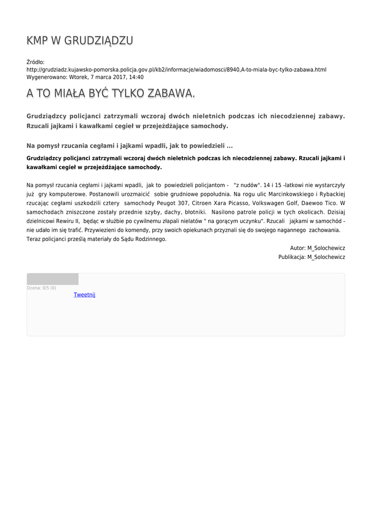 KMP W GRUDZIĄDZU Źródło: http://grudziadz.kujawsko-pomorska.policja.gov.pl/kb2/informacje/wiadomosci/8940,A-to-miala-byc-tylko-zabawa.html Wygenerowano: Wtorek, 7 marca 2017, 14:40 A TO MIAŁA BYĆ TYLKO ZABAWA. Grudziądzcy policjanci zatrzymali wczoraj dwóch nieletnich podczas ich niecodziennej zabawy. Rzucali jajkami i kawałkami cegieł w przejeżdżające samochody. Na pomysł rzucania cegłami i jajkami wpadli, jak to powiedzieli ... Grudziądzcy policjanci zatrzymali wczoraj dwóch nieletnich podczas ich niecodziennej zabawy. Rzucali jajkami i kawałkami cegieł w przejeżdżające samochody. Na pomysł rzucania cegłami i jajkami wpadli, jak to powiedzieli policjantom - "z nudów". 14 i 15 -latkowi nie wystarczyły już gry komputerowe. Postanowili urozmaicić sobie grudniowe popołudnia. Na rogu ulic Marcinkowskiego i Rybackiej rzucając cegłami uszkodzili cztery samochody Peugot 307, Citroen Xara Picasso, Volkswagen Golf, Daewoo Tico. W samochodach zniszczone zostały przednie szyby, dachy, błotniki. Nasilono patrole policji w tych okolicach. Dzisiaj dzielnicowi Rewiru II, będąc w służbie po cywilnemu złapali nielatów " na gorącym uczynku". Rzucali jajkami w samochód nie udało im się trafić. Przywiezieni do komendy, przy swoich opiekunach przyznali się do swojego nagannego zachowania. Teraz policjanci prześlą materiały do Sądu Rodzinnego. Autor: M_Solochewicz Publikacja: M_Solochewicz Ocena: 0/5 (0) Tweetnij