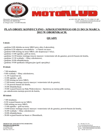 Obornickie Towarzystwo Sportowe MOTOKLUB OBORNIKI ul. Droga Leśna 7, 64-600 Oborniki tel. 0512 282 346, 0604 773 753, 0504 121 485 e-mail: [email protected] www.motokluboborniki.pl PLAN OBOZU KONDYCYJNO - SZKOLENIOWEGO OD 21 DO 24 MARCA 2013 W OBORNIKACH. QUADY I dzień: - godzina 8.00 zbiórka na torze MKO przy ulicy Łukowskiej, - godzina 8.30 odprawa zawodników – w biurze na torze , - godzina 9.00 trening na torze MKO, (do dyspozycji 3 tory), - godzina 13.00 ognisko, grill na torze, - godzina 14.30 koniec treningu (mycie maszyn i wstawienie ich do garażu), powrót busem do hotelu, - godzina 15.30 wykłady + filmy szkoleniowe, - godzina 18.00 obiadokolacja, - godzina 19.00 spotkanie integracyjne (gość specjalny) II dzień: - 7.00 śniadanie, - 9.00 wykłady + filmy szkoleniowe, - 11.30 wyjazd na tor, - 12.00 ognisko - grill, - 13:00 trening na torze MKO, - 17.00 koniec treningu (mycie maszyn i wstawienie ich do garażu), - 17.30 powrót busem do hotelu, - 18.00 obiadokolacja - 19.00 wyjazd busem na Halę Widowiskowo - Sportową na turniej piłki nożnej, - po zakończeniu turnieju powrót do hotelu, III dzień: - 7.00 śniadanie, - 8:30 wyjazd busem na tor MKO, - 9:00 trening na torze MKO, - 13.00 ognisko - grill na torze, - 14:00 koniec treningu (mycie maszyn i wstawienie ich do garażu), powrót busem do hotelu, - 16.00 wykłady + filmy szkoleniowe - 18:00 obiadokolacja, - 20.00 wyjazd busem na basen w Obornikach, OBORNICKIE TOWARZYSTWO SPORTOWE MOTOKLUB OBORNIKI ul. Droga Leśna 7 64-600 Oborniki NIP:766-18-47-553 tel. +48 604 773 753 www.motokluboborniki.pl e-mail: [email protected] Konto: 34905500030000000184830001 fax: + 48 067 261 07 35 Obornickie Towarzystwo Sportowe MOTOKLUB OBORNIKI ul. Droga Leśna 7, 64-600 Oborniki tel. 0512 282 346, 0604 773 753, 0504 121 485 e-mail: [email protected] www.motokluboborniki.pl IV dzień: - 7.00 - śniadanie, − 9.00 - zawody według osobnego harmonogramu i regulaminu - MISTRZOSTWA STREFY POLSKI ZACHODNIEJ w CROSS COUNTRY – I Runda 24.03.2013 − ( podczas zawodów będzie możliwość zdobycia licencji zawodniczej C – uprawniającej do startu w zawodach organizowanych przez PZM ) Koszt za zgrupowania zawiera: - nocleg i wyżywienie w Hotelu - Restauracji „Milenium”, - opłatę za instruktorów, - opłatę za kierownika - opiekuna zgrupowania, - opłatę za ubezpieczenie na obozie, - opłatę za ubezpieczenie na niedzielne zawody, - wpisowe na zawody i wszystkie pozostałe atrakcje: basen, halę sportową, ognisko, grill, napoje (ciepłe i zimne na torze), przejazdy busem, garaż, mycie maszyn, ochrona itd. Każdy uczestnik jest zobowiązany do: - w przypadku nie ukończenia 18 roku życia przedstawienia podpisanej zgody przez prawnego opiekuna na wzięcie udziału w obozie (z numerem jego telefonu), - okazania ważnych badań lekarskich potrzebnych do wzięcia udziału w zawodach niedzielnych obowiązkowo, - zabrania ze sobą sprzętu i pełnego stroju (ochraniacze) umożliwiającego bezpieczną jazdę na torze, - zabrania ze sobą stroju kąpielowego, - zabrania ze sobą stroju i butów sportowych (do biegania i na turniej piłki nożnej). Skład kadry: Kierownik - opiekun zgrupowania: Andrzej Rencz Kadra szkoleniowców motocykl: Łukasz Kędzierski Karol Kędzierski Jacek Lonka Marcin Wójcik Łukasz Wysocki Marcin Spirowski Kadra szkoleniowców quad: Paweł Sobczyk Adam Wężyk Damian Rajczyk Jacek Stelmaszyk Kamil Kępa OBORNICKIE TOWARZYSTWO SPORTOWE MOTOKLUB OBORNIKI ul. Droga Leśna 7 64-600 Oborniki NIP:766-18-47-553 tel. +48 604 773 753 www.motokluboborniki.pl e-mail: [email protected] Konto: 34905500030000000184830001 fax: + 48 067 261 07 35 Obornickie Towarzystwo Sportowe MOTOKLUB OBORNIKI ul. Droga Leśna 7, 64-600 Oborniki tel. 0512 282 346, 0604 773 753, 0504 121 485 e-mail: [email protected] www.motokluboborniki.pl Wszystkich chętnych zapraszamy na zgrupowanie do wspólnych treningów i wymiany doświadczeń, które mają na celu polepszenie naszych umiejętności i poprawę wyników w sezonie 2013. Więcej szczegółowych informacji na naszej stronie internetowej: www.motokluboborniki.pl. Osoby, które zdecydują się na wzięcie udziału w obozie kondycyjno szkoleniowym są proszone o przelanie odpowiedniej kwoty na konto Motoklubu Oborniki: BANK PKO - 6710 2041 28 0000 1502 0066 3278. W razie jakichkolwiek pytań proszę o kontakt z organizatorami: Marcin Biedny Robert Kramer Grzegorz Mantyk tel: 604 773 753, tel: 663 699 540, tel: 504 121 485, Serdecznie zapraszamy, Zarząd Motoklubu Oborniki OBORNICKIE TOWARZYSTWO SPORTOWE MOTOKLUB OBORNIKI ul. Droga Leśna 7 64-600 Oborniki NIP:766-18-47-553 tel. +48 604 773 753 www.motokluboborniki.pl e-mail: [email protected] Konto: 34905500030000000184830001 fax: + 48 067 261 07 35