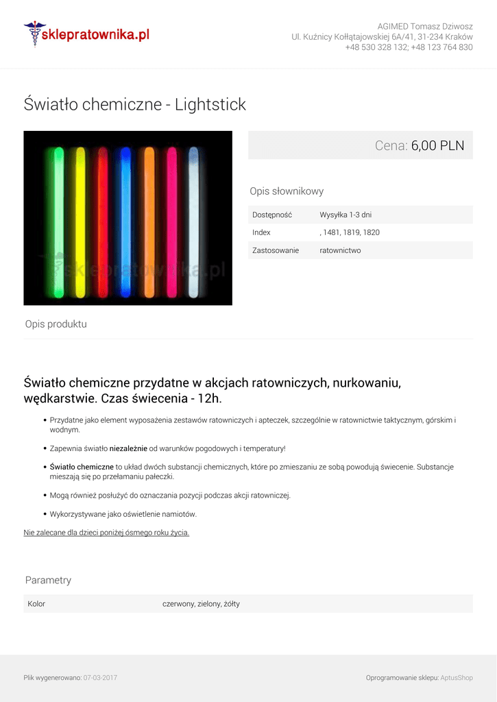 AGIMED Tomasz Dziwosz Ul. Kuźnicy Kołłątajowskiej 6A/41, 31-234 Kraków +48 530 328 132; +48 123 764 830 Światło chemiczne - Lightstick Cena: 6,00 PLN Opis słownikowy Dostępność Wysyłka 1-3 dni Index , 1481, 1819, 1820 Zastosowanie ratownictwo Opis produktu Światło chemiczne przydatne w akcjach ratowniczych, nurkowaniu, wędkarstwie. Czas świecenia - 12h. Przydatne jako element wyposażenia zestawów ratowniczych i apteczek, szczególnie w ratownictwie taktycznym, górskim i wodnym. Zapewnia światło niezależnie od warunków pogodowych i temperatury! Światło chemiczne to układ dwóch substancji chemicznych, które po zmieszaniu ze sobą powodują świecenie. Substancje mieszają się po przełamaniu pałeczki. Mogą również posłużyć do oznaczania pozycji podczas akcji ratowniczej. Wykorzystywane jako oświetlenie namiotów. Nie zalecane dla dzieci poniżej ósmego roku życia. Parametry Kolor Plik wygenerowano: 07-03-2017 Powered by TCPDF (www.tcpdf.org) czerwony, zielony, żółty Oprogramowanie sklepu: AptusShop