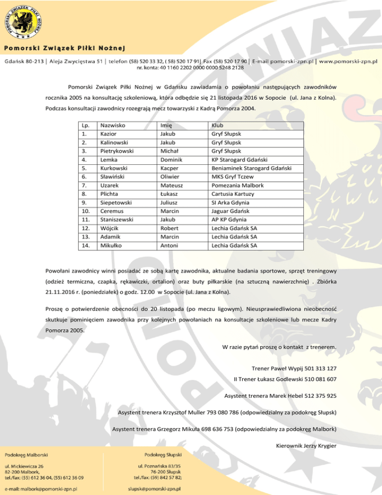 Pomorski Związek Piłki Nożnej w Gdańsku zawiadamia o powołaniu następujących zawodników rocznika 2005 na konsultację szkoleniową, która odbędzie się 21 listopada 2016 w Sopocie (ul. Jana z Kolna). Podczas konsultacji zawodnicy rozegrają mecz towarzyski z Kadrą Pomorza 2004. Lp. 1. 2. 3. 4. 5. 6. 7. 8. 9. 10. 11. 12. 13. 14. Nazwisko Kazior Kalinowski Pietrykowski Lemka Kurkowski Sławiński Uzarek Plichta Siepetowski Ceremus Staniszewski Wójcik Adamik Mikułko Imię Jakub Jakub Michał Dominik Kacper Oliwier Mateusz Łukasz Juliusz Marcin Jakub Robert Marcin Antoni Klub Gryf Słupsk Gryf Słupsk Gryf Słupsk KP Starogard Gdański Beniaminek Starogard Gdański MKS Gryf Tczew Pomezania Malbork Cartusia Kartuzy SI Arka Gdynia Jaguar Gdańsk AP KP Gdynia Lechia Gdańsk SA Lechia Gdańsk SA Lechia Gdańsk SA Powołani zawodnicy winni posiadać ze sobą kartę zawodnika, aktualne badania sportowe, sprzęt treningowy (odzież termiczna, czapka, rękawiczki, ortalion) oraz buty piłkarskie (na sztuczną nawierzchnię) . Zbiórka 21.11.2016 r. (poniedziałek) o godz. 12.00 w Sopocie (ul. Jana z Kolna). Proszę o potwierdzenie obecności do 20 listopada (po meczu ligowym). Nieusprawiedliwiona nieobecność skutkuje pominięciem zawodnika przy kolejnych powołaniach na konsultacje szkoleniowe lub mecze Kadry Pomorza 2005. W razie pytań proszę o kontakt z trenerem. Trener Paweł Wypij 501 313 127 II Trener Łukasz Godlewski 510 081 607 Asystent trenera Marek Hebel 512 375 925 Asystent trenera Krzysztof Muller 793 080 786 (odpowiedzialny za podokręg Słupsk) Asystent trenera Grzegorz Mikuła 698 636 753 (odpowiedzialny za podokręg Malbork) Kierownik Jerzy Krygier