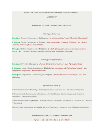 WYNIKI VIII OGÓLNOPOLSKIEGO KONKURSU HISTORYCZNEGO ,,HETMANY” KONKURS ,,STEFAN CZARNIECKI – PROJEKT” Szkoły podstawowe: I miejsce: Szkoła Podstawowa w Słubicach (,,Herb Czarnieckiego” ; aut.: Michalina Mikołajczyk) II miejsce:Szkoła Podstawowa w Gołębiu (,,Gra planszowa – bitwa pod Gołębiem”, aut.: Antoni Jasiocha, Hubert Cybula, Alicja Warda) III miejsce:Szkoła Podstawowa w Mieścisku (portret ,,Dla ojczyzny ratowania wrócim się przez morze”, aut.: Zuzanna Dembna, Agnieszka Muszyńska, Małgorzata Ignaczak) Szkoły ponadgimnazjalne I miejsce:XLVI LO w Warszawie (,,Portret Stefana Czarnieckiego”, aut.: Agnieszka Galas) II miejsce:I Liceum Ogólnokształcące w Chełmie (gra planszowa ,,Ku hetmańskiej chwale”, aut.: Magdalena Gregorowicz, Helena Mazurek) III miejsce:Zespół Szkół Mechanicznych w Łapach (,,Portret Stefana Czarnieckiego” aut.: Piotr Sadowski) Wyróżnienia Kapituły: Szkoła Podstawowa w Czarncy (,,Kościół parafialny w Czarncy”, aut.: Katarzyna Waligórska) Publiczna Szkoła Podstawowa w Ostrołęce (,,Postać Stefana Czarnieckiego”, aut.: Angelika Wąsiewicz, Damian Anczewski) Szkoła Podstawowa w Tykocinie (,,Pomnik hetmana Stefana Czarnieckiego w Tykocinie, aut.: Konrad Tyborowski) I Liceum Ogólnokształcące w Chełmie (Hetman Czarniecki z modeliny”, aut.: Magdalena Osowska) KONKURS WIEDZY O STEFANIE CZARNIECKIM rywalizacja między szkołami Szkoły podstawowe I miejsce: Szkoła Podstawowa w Racławicach II miejsce: Szkoła Podstawowa w Czarncy III miejsce: Szkoła Podstawowa w Ostrołęce Szkoły ponadgimnazjalne I miejsce: Zespół Szkół Ponadgimnazjalnych nr 2 we Włoszczowie II miejsce: Liceum Ogólnokształcące przy Zespole Szkół Gimnazjalnych i Ogólnokształcących w Człuchowie III miejsce (ex aequo):: I Liceum Ogólnokształcące w Chełmie Zespół Szkół nr 5 w Tyszowcach rywalizacja indywidualna Szkoły podstawowe I miejsce: Katarzyna Serwońska ze Szkoły Podstawowej w Racławicach II miejsce: Aneta Potyrała ze Szkoły Podstawowej w Racławicach III miejsce (ex aequo): Mateusz Magdziarz ze Szkoły Podstawowej w Czarncy i Krystian Pyraze Szkoły Podstawowej w Gołębiu Szkoły ponadgimnazjalne I miejsce: Marta Mielniczekz Liceum Ogólnokształcącego przy Zespole Szkół Gimnazjalnych i Ogólnokształcących w Człuchowie II miejsce: Kamil Juśkiewiczz Zespołu Szkół Ponadgimnazjalnych nr 2 we Włoszczowie III miejsce:Karolina Rajekz Zespołu Szkół Ponadgimnazjalnych nr 2 we Włoszczowie