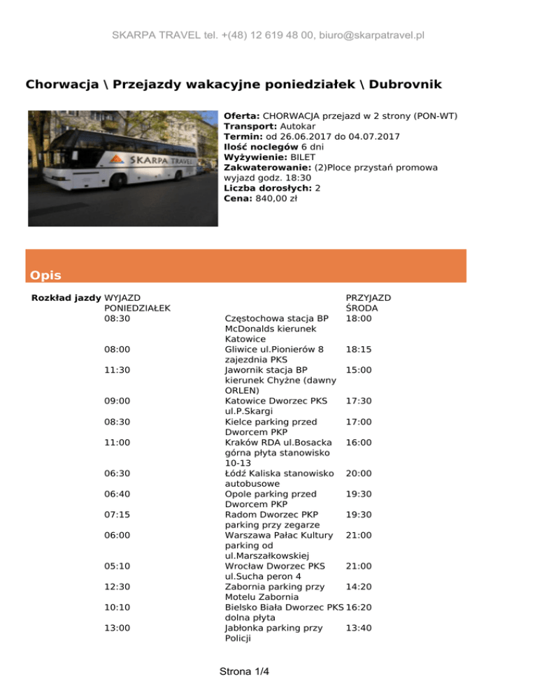 SKARPA TRAVEL tel. +(48) 12 619 48 00, [email protected] Chorwacja \ Przejazdy wakacyjne poniedziałek \ Dubrovnik Oferta: CHORWACJA przejazd w 2 strony (PON-WT) Transport: Autokar Termin: od 26.06.2017 do 04.07.2017 Ilość noclegów 6 dni Wyżywienie: BILET Zakwaterowanie: (2)Ploce przystań promowa wyjazd godz. 18:30 Liczba dorosłych: 2 Cena: 840,00 zł Opis Rozkład jazdy WYJAZD PONIEDZIAŁEK 08:30 08:00 11:30 09:00 08:30 11:00 06:30 06:40 07:15 06:00 05:10 12:30 10:10 13:00 PRZYJAZD ŚRODA 18:00 Częstochowa stacja BP McDonalds kierunek Katowice Gliwice ul.Pionierów 8 18:15 zajezdnia PKS Jawornik stacja BP 15:00 kierunek Chyżne (dawny ORLEN) Katowice Dworzec PKS 17:30 ul.P.Skargi Kielce parking przed 17:00 Dworcem PKP Kraków RDA ul.Bosacka 16:00 górna płyta stanowisko 10-13 Łódź Kaliska stanowisko 20:00 autobusowe Opole parking przed 19:30 Dworcem PKP Radom Dworzec PKP 19:30 parking przy zegarze Warszawa Pałac Kultury 21:00 parking od ul.Marszałkowskiej Wrocław Dworzec PKS 21:00 ul.Sucha peron 4 Zabornia parking przy 14:20 Motelu Zabornia Bielsko Biała Dworzec PKS 16:20 dolna płyta Jabłonka parking przy 13:40 Policji Strona 1/4 SKARPA TRAVEL tel. +(48) 12 619 48 00, [email protected] 09:25 Tychy stacja ORLEN przy 16:50 trasie Katowice-Bielsko ul.Beskidzka WYJAZD WTOREK PRZYJAZD WTOREK 05:30 08:00 WYJAZD WTOREK Ploce przystań promowa 18:30 Dubrovnik parking przy moście 17:00 F.Tudjmana WYJAZD WTOREK 1. Na wyjazd potrzebny ważny paszport lub dowód osobisty. Cena w PLN zawiera Przejazd autokarem, ubezpieczenie komunikacyjne, opłatę na Turystyczny Fundusz Gwarancyjny. Uwagi przewoźnika 1.Transport na trasach antenowych w Polsce możliwy jest mikrobusem, autokarem klasy turystycznej, samochodem osobowym lub innym przewoźnikiem np. Polskim Busem, Luxbusem, PKP, PKS itp. Ewentualną zmianę godzin odjazdów podamy najpóźniej na 24 godziny przed odjazdem. Trasa połączeń na terenie kraju zależy od zgłoszeń z poszczególnych miast, co może spowodować, ze przejazd nie będzie realizowany najkrótszą z możliwych tras. 2. Na trasach poza granicami Polski transport odbywa się autokarami wyposażonymi w siedzenia uchylne, klimatyzację, toalety, video i nagłośnienie. Przy małej ilości osób, możliwość przewozu uczestników małym autobusem bez WC i mini baru, wtedy toalety na postojach płatne przez przewoźnika. 3. Podane godziny wyjazdów i przyjazdów mogą ulec zmianie z różnych przyczyn np. złe warunki drogowe, atmosferyczne, zwiększanie ruchu na drogach szczególnie w szczycie sezonu letniego i inne. 4. Prosimy o przybycie na miejsce zbiórki najpóźniej 15 minut przed planowaną godziną odjazdu. Miejsca w autokarze są przydzielane w kolejności podpisania umowy, a klienci o miejscach informowani są przez obsługę na miejscu zbiórki. W autokarze obowiązuje całkowity zakaz palenia papierosów oraz spożywania alkoholu. Osoby korzystające z samego przejazdu, powinny obowiązkowo ubezpieczyć się na czas pobytu. Przewoźnik gwarantuje tylko ubezpieczenie na czas przejazdu. Uwagi organizatora 1. Do poruszania się po krajach należących do strefy Schengen potrzebny jest dokument podróży: dowód osobisty lub paszport. Prosimy pamiętać o dokumencie dla dzieci. 2. Warunki uczestnictwa w imprezach organizowanych przez SKARPA TRAVEL Sp. z o.o. stanowią integralną część oferty, dostępne są w biurach sprzedających ofertę oraz na stronie: www.skarpatravel.pl. 3. W dniu wykupienia imprezy/ wpłaty zaliczki klient ma możliwość wykupienia dodatkowego ubezpieczenia od kosztów rezygnacji z imprezy zgodnie z Ogólnymi Warunkmi Ubezpieczenia KOSZTÓW IMPREZY TURYSTYCZNEJ w wysokości 4,41% jednak nie później niż 5 dni od dnia podpisania umowy. Praktyczne informacje Najblizsza placówka dyplomatyczna:Ambasada RP, Krlezin Gvozd 3, 10000 Zagreb Strona 2/4 SKARPA TRAVEL tel. +(48) 12 619 48 00, [email protected] tel. (+385) 14834575, 4834579 fax. (+385)14834577 Wydzial Konsularnytel/fax ( +385) 14899444 Obowiązująca waluta: 1 kuna (HRK) = 100 lip 1 EUR = ok. 7,2 kun Rozkład jazdy Miasto wyjazdu Miejsce wyjazdu Godzina wyjazdu Bielsko Biała Dworzec PKS dolna płyta (antenka) 10:10 20 zł Częstochowa stacja BP McDonald's kierunek Katowice (antenka) ul.Pionierów 8, zajezdnia PKS (antenka) parking przy Policji 08:30 60 zł 08:00 20 zł 13:00 - stacja benzynowa BP (dawny Orlen) kierunek na Chyżne Dworzec PKS ul.P.Skargi (antenka) 11:30 - 09:00 20 zł Kielce parking przed Dworcem PKP (antenka) 08:30 60 zł Kraków Dworzec PKS , stanowiska G 9-11 ul.Bosacka parking przed Dworcem PKP (antenka) 11:00 - 06:40 80 zł Radom Dworzec PKP parking przy zegarze (antenka) 07:15 80 zł Tychy stacja ORLEN przy trasie E-75 ul.Beskidzka (antenka) PKiN parking od ul.Marszałkowskiej (antenka) tymczasowy dworzec POLBUS-PKS (antenka) 09:25 20 zł 06:00 100 zł 05:10 80 zł parking przy Motelu Zabornia 12:30 - Gliwice Jabłonka Jawornik Katowice Opole Warszawa Wrocław Zabornia Strona 3/4 Dopłata SKARPA TRAVEL tel. +(48) 12 619 48 00, [email protected] Łódż Kaliska stanowiska autobusowe (antenka) Strona 4/4 Powered by TCPDF (www.tcpdf.org) 06:30 100 zł