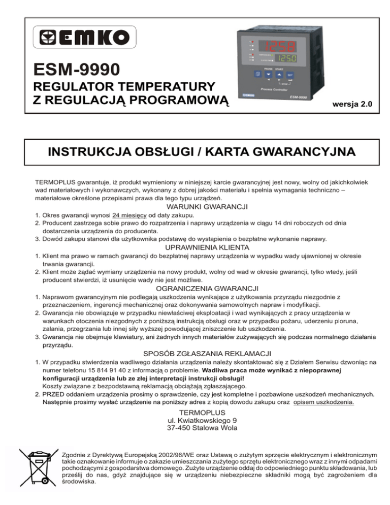 ESM-9990 REGULATOR TEMPERATURY Z REGULACJĄ PROGRAMOWĄ wersja 2.0 INSTRUKCJA OBSŁUGI / KARTA GWARANCYJNA TERMOPLUS gwarantuje, iż produkt wymieniony w niniejszej karcie gwarancyjnej jest nowy, wolny od jakichkolwiek wad materiałowych i wykonawczych, wykonany z dobrej jakości materiału i spełnia wymagania techniczno – materiałowe określone przepisami prawa dla tego typu urządzeń. WARUNKI GWARANCJI 1. Okres gwarancji wynosi 24 miesięcy od daty zakupu. 2. Producent zastrzega sobie prawo do rozpatrzenia i naprawy urządzenia w ciągu 14 dni roboczych od dnia dostarczenia urządzenia do producenta. 3. Dowód zakupu stanowi dla użytkownika podstawę do wystąpienia o bezpłatne wykonanie naprawy. UPRAWNIENIA KLIENTA 1. Klient ma prawo w ramach gwarancji do bezpłatnej naprawy urządzenia w wypadku wady ujawnionej w okresie trwania gwarancji. 2. Klient może żądać wymiany urządzenia na nowy produkt, wolny od wad w okresie gwarancji, tylko wtedy, jeśli producent stwierdzi, iż usunięcie wady nie jest możliwe. OGRANICZENIA GWARANCJI 1. Naprawom gwarancyjnym nie podlegają uszkodzenia wynikające z użytkowania przyrządu niezgodnie z przeznaczeniem, ingerencji mechanicznej oraz dokonywania samowolnych napraw i modyfikacji. 2. Gwarancja nie obowiązuje w przypadku niewłaściwej eksploatacji i wad wynikających z pracy urządzenia w warunkach otoczenia niezgodnych z poniższą instrukcją obsługi oraz w przypadku pożaru, uderzeniu pioruna, zalania, przegrzania lub innej siły wyższej powodującej zniszczenie lub uszkodzenia. 3. Gwarancja nie obejmuje klawiatury, ani żadnych innych materiałów zużywających się podczas normalnego działania przyrządu. SPOSÓB ZGŁASZANIA REKLAMACJI 1. W przypadku stwierdzenia wadliwego działania urządzenia należy skontaktować się z Działem Serwisu dzwoniąc na numer telefonu 15 814 91 40 z informacją o problemie. Wadliwa praca może wynikać z niepoprawnej konfiguracji urządzenia lub ze złej interpretacji instrukcji obsługi! Koszty związane z bezpodstawną reklamacją obciążają zgłaszającego. 2. PRZED oddaniem urządzenia prosimy o sprawdzenie, czy jest kompletne i pozbawione uszkodzeń mechanicznych. Następnie prosimy wysłać urządzenie na poniższy adres z kopią dowodu zakupu oraz opisem uszkodzenia. TERMOPLUS ul. Kwiatkowskiego 9 37-450 Stalowa Wola Zgodnie z Dyrektywą Europejską 2002/96/WE oraz Ustawą o zużytym sprzęcie elektrycznym i elektronicznym takie oznakowanie informuje o zakazie umieszczania zużytego sprzętu elektronicznego wraz z innymi odpadami pochodzącymi z gospodarstwa domowego. Zużyte urządzenie oddaj do odpowiedniego punktu składowania, lub prześlij do nas, gdyż znajdujące się w urządzeniu niebezpieczne składniki mogą być zagrożeniem dla środowiska. 1. CHARAKTERYSTYKA. Regulator przeznaczony jest do współpracy z termoparą typu K. Posiada dwa wyświetlacze LED: górny wyświetlacz wskazuje aktualną wartość mierzoną, zaś dolny parametry programu oraz wartość zadaną. Regulator ma 2 wyjścia pracujące równolegle: OP3: sterujące przekaźnikowe OP1: sterujące SSR Regulator steruje obiektem według wartości zadanej zmieniającej się w czasie zgodnie z zadanym programem. Maksymalna liczba kroków w programie wynosi 8. Przyrząd stosowany jest do kontroli procesów przemysłowych. Montowany jest w tablicy za pomocą dołączonym uchwytów montażowych. 2. DANE TECHNICZNE 2 Wejście: Termopara K, zakres: -200...+1300°C Dokładność pomiaru: ±0,25% zakresu kompensacja zimnych końców: automatyczna ±0,1°C/1°C Okres próbkowania: 330 ms Rozdzielczość wskazań: 1°C Wyświetlacz: podwójny LED, 4 cyfry o wysokości 14 i 9mm Metoda regulacji: PID z funkcją automatycznego doboru nastaw ON-OFF z histerezą Wyjście regulacyjne: przekaźnikowe 5A 250V~, trwałość 10 cykli półprzewodnikowe SSR max. 18V= 20mA Montaż: w otworze o wymiarach: 92 x 92mm Stopień i klasa ochrony: IP65 / II Zasilanie: 100...240V~ ±15% 50/60Hz Pobór mocy: max 6 VA Separacja galwaniczna: 2kV Warunki pracy: 0...50°C; 0...90%RH (bez kondensacji) Warunki składowania: -40...85°C; 0...90%RH (bez kondensacji) 5 3. PANEL PRZEDNI. wskaźnik stopni Celsiusza wskaźnik stopni Fahrenheita wskaźnik jednostki wyświetlacz wartości mierzonej diody sygnalizacji aktywacji wyjść, odpowiednio: - wyjście sterujące SSR - wyjście dodatkowe - wyjście sterujące przekaźnikowe °C wyświetlacz: - numeru i rodzaj kroku - czasu do zakończenia kroku - wartości zadanej °F OP1 RAMP/SOAK INFO OP2 ELAPSED TIME OP3 wskaźnik numeru kroku ASET1 ASET2 klawisz zwiększający wartość służy również do uruchamiania procesu PAUSE START SET klawisz zatwierdzający wskaźnik czasu pozostałego do zakończenia kroku STOP ESM-4430 ESM-9990 klawisz konfiguracji klawisze służące do zatrzymania procesu klawisz zmniejszający wartość oraz zatrzymujący proces 4. OBSŁUGA REGULATORA. 4.1. KONFIGURACJA PROGRAMU. Wbudowana funkcja regulacji programowej (tzw. ramping) pozwala na zapamiętanie 8-krokowego programu. Regulator kontroluje proces, sekwencyjnie przełączając kolejne nastawy w zadanych odstępach czasu. Każdy krok programu składa się z trzech nastaw: - wartości zadanej - czasu narastania (opadania) (maksymalny czas 99godzin i 99 minut) - czasu przetrzymania (maksymalny czas 99godzin i 99 minut) - ostatnia cyfra oznacz numer kroku. - nastawa czasu na wartość 0 oznacza, że krok zostanie pominięty. °C °F OP1 RAMP/SOAK INFO OP2 ELAPSED TIME OP3 służy do rozpoczęcia i zakończenia trybu programowania ASET1 ASET2 PAUSE START SET STOP służy do przejścia do kolejnego parametru oraz do akceptacji zmian służą do zmiany wartości parametrów Uwagi: - aby anulować nastawę, w dowolnej chwili naciśnij klawisz Informacja: Aby usprawnić szybkie zwiększanie lub zmniejszanie wartości nastaw: przytrzymując klawisz lub stale przez minimum 5 sekund, dzięsiąte części jedności zamienią się 