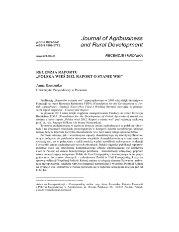 pISSN 1899-5241 eISSN 1899-5772 Journal of Agribusiness and Rural Development www.jard.edu.pl RECENZJE I KRONIKA RECENZJA RAPORTU „POLSKA WIEŚ 2012. RAPORT O STANIE WSI” Anna Rzeszutko Uniwersytet Przyrodniczy w Poznaniu Publikację „Raportów o stanie wsi” zapoczątkowano w 2000 roku dzięki inicjatywie Fundacji na rzecz Rozwoju Rolnictwa FDPA (Foundation for the Development of Polish Agriculture) i fundacji Know-How Fund z Wielkiej Brytanii stawiając za pierwowzór raport angielski – Countryside Report. W połowie 2012 roku dzięki ciągłemu zaangażowaniu Fundacji na rzecz Rozwoju Rolnictwa FDPA (Foundation for the Development of Polish Agriculture) ukazał się siódmy z kolei raport „Polska wieś 2012. Raport o stanie wsi” pod redakcją naukową prof. dr. hab. Jerzego Wilkina i dr Iwony Nurzyńskiej. Tematyka podejmowana w raporcie dotyczy zmian zachodzących w polskim rolnictwie i na obszarach wiejskich, postrzeganych w kategorii zasobu narodowego, którego rozwój leży w interesie nie tylko mieszkańców wsi, lecz także całego społeczeństwa. Zarówno obecny, jak i wcześniejsze raporty charakteryzują się interdyscyplinarnością w podejściu do problemów obszarów wiejskich i kompleksowością w spojrzeniu na sytuację wsi, co w połączeniu z cyklicznością wydań umożliwia uchwycenie tendencji i dynamiki zmian zachodzących na tych obszarach. Dzięki ciągłości publikacji raportów możliwe stało się otrzymanie kompleksowego obrazu zmieniającego się rolnictwa i wsi w Polsce: od okresu historycznego przełomu – transformacji ustrojowej, poprzez okres poprzedzający wstąpienie Polski do Unii Europejskiej i towarzyszące temu przygotowania, do czasów obecnych – członkostwa Polski w Unii Europejskiej, kiedy za sprawą realizacji Wspólnej Polityki Rolnej zmiany te ulegają zintensyfikowaniu i nabierają przyspieszenia. Analizie wpływu integracji europejskiej i Wspólnej Polityki Rolnej na sytuację wsi i rolnictwa w Polsce poświęca się w raporcie szczególne miejsce już od kilku lat. Copyright © Wydawnictwo Uniwersytetu Przyrodniczego w Poznaniu Adres do korespondencji – Corresponding author: mgr Anna Rzeszutko, Katedra Ekonomii i Polityki Gospodarczej w Agrobiznesie, ul. Wojska Polskiego 28, 60-637 Poznań, Poland, e-mail: [email protected] 184 A. Rzeszutko Stałymi zagadnieniami podejmowanymi w raportach są: przemiany demograficzne na wsi, sytuacja rolnictwa, przekształcenia struktury ekonomiczno-społecznej wsi, kwestie środowiskowe na obszarach wiejskich, a także zmiany poglądów politycznych mieszkańców wsi. Ponadto w każdym raporcie są podejmowane tematy specjalne, mające szczególnie duże znaczenie dla funkcjonowania i rozwoju obszarów wiejskich. W raporcie z 2012 roku tematami tymi były sytuacja i szanse młodzieży wiejskiej oraz przestrzenne zróżnicowanie obszarów wiejskich w Polsce. Wskazane zagadnienia są opracowywane przez naukowców reprezentujących różne dziedziny nauk społecznych. „Polska wieś 2012. Raport o stanie wsi” składa się z ośmiu rozdziałów. W pierwszym rozdziale, pt. „Ludność wiejska”, autor – prof. dr hab. Izasław Frenkel (Instytut Rozwoju Wsi i Rolnictwa PAN) – analizuje zagadnienia związane z tendencją zmian liczby ludności na obszarach wiejskich, omawia czynniki demograficzne warunkujące te zmiany, takie jak: przyrost naturalny, dzietność kobiet, długość życia czy procesy migracyjne. Bada też strukturę ludności wiejskiej według wieku, płci i poziomu wykształcenia, a także podejmuje ważną problematykę zatrudnienia i bezrobocia na wsi. Autor wskazuje, że na obszarach wiejskich za sprawą dodatniego salda migracji wewnętrznych wieś-miasto i przyrostu naturalnego utrzymuje się wzrostowa tendencja liczby ludności. Struktura wiekowa społeczeństwa wiejskiego w Polsce jest stosunkowo młoda w porównaniu ze strukturą wiekową mieszkańców miast oraz mieszkańców innych krajów europejskich. Pod względem przemian demograficznych dotyczących modelu dzietności wieś upodabnia się do miasta. Następuje dość szybka poprawa poziomu wykształcenia ludności wiejskiej, choć nadal jest on gorszy niż w mieście. Wydłuża się przeciętne trwanie życia. Od 2009 roku, po okresie spadku poziomu bezrobocia, obserwuje się pogarszanie sytuacji na rynku pracy na wsi. Wskaźniki zatrudnienia charakteryzują się tendencją zniżkową (w szczególności w bezrolnych gospodarstwach domowych), natomiast stopy bezrobocia – zwyżkową. Natomiast w strukturze zatrudnienia obserwuje się dalsze procesy dezagraryzacji, choć odsetek pracujących w rolnictwie w Polsce jest nadal jednym z najwyższych spośród wszystkich krajów Unii Europejskiej. Rozdział drugi, pt. „Przemiany w rolnictwie ze szczególnym uwzględnieniem przemian strukturalnych” autorstwa prof. dr. hab. Walentego Poczty (Uniwersytet Przyrodniczy w Poznaniu), zawiera obraz procesów rozwojowych sektora rolnego w Polsce, dokonujących się w warunkach członkostwa w Unii Europejskiej i funkcjonowania w ramach Wspólnej Polityki Rolnej. Autor, poprzez wykazanie wzrostu wartości produkcji rolnej i dynamicznego wzrostu poziomu dochodów rolniczych, wskazuje na zmiany kategorii ilościowych, które w połączeniu z przemianami strukturalnymi (zmiany struktury obszarowej i ekonomicznej gospodarstw, zmiany w zasobach czynników produkcji, ich poziomu produktywności i w relacjach między nimi, zmiany struktury produkcji) składają się na rozwój sektora rolnego w Polsce. Wyraźny postęp obserwuje się w zakresie przemian struktury obszarowej i wytwórczej rolnictwa. Spada liczba małych i średnich gospodarstw rolnych oraz zmniejsza się obszar użytkowanej przez nie ziemi rolniczej. Wzrost tych wielkości następuje w grupach obszarowych powyżej 30 ha UR. W odniesieniu do struktury wytwórczej dominującym kierunkiem zmian jest wzrost skali wytwarzania. Ponadto autor przedstawia sytuacj