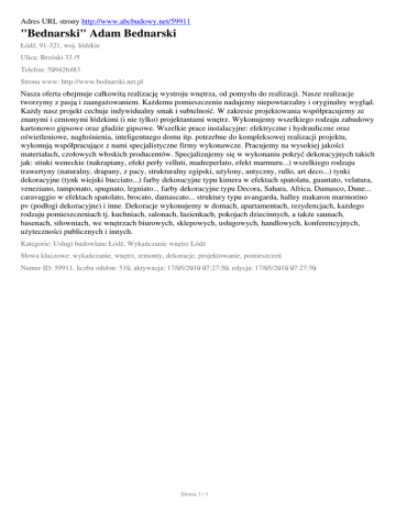 Adres URL strony http://www.abcbudowy.net/59911 "Bednarski" Adam Bednarski Łódź, 91-321, woj. łódzkie Ulica: Brzóski 33 /5 Telefon: 509426483 Strona www: http://www.bednarski.net.pl Nasza oferta obejmuje całkowitą realizację wystroju wnętrza, od pomysłu do realizacji. Nasze realizacje tworzymy z pasją i zaangażowaniem. Każdemu pomieszczeniu nadajemy niepowtarzalny i oryginalny wygląd. Każdy nasz projekt cechuje indywidualny smak i subtelność. W zakresie projektowania współpracujemy ze znanymi i cenionymi łódzkimi (i nie tylko) projektantami wnętrz. Wykonujemy wszelkiego rodzaju zabudowy kartonowo gipsowe oraz gładzie gipsowe. Wszelkie prace instalacyjne: elektryczne i hydrauliczne oraz oświetleniowe, nagłośnienia, inteligentnego domu itp. potrzebne do kompleksowej realizacji projektu, wykonują współpracujące z nami specjalistyczne firmy wykonawcze. Pracujemy na wysokiej jakości materiałach, czołowych włoskich producentów. Specjalizujemy się w wykonaniu pokryć dekoracyjnych takich jak: stiuki weneckie (nakrapiany, efekt perły velluti, madreperlato, efekt marmuru...) wszelkiego rodzaju trawertyny (naturalny, drapany, z pacy, strukturalny egipski, użylony, antyczny, rullo, art deco...) tynki dekoracyjne (tynk wiejski bucciato...) farby dekoracyjne typu kimera w efektach spatolatu, guantato, velatura, veneziano, tamponato, spugnato, legniato... farby dekoracyjne typu Decora, Sahara, Africa, Damasco, Dune... caravaggio w efektach spatolato, brocato, damascato... struktury typu avangarda, halley makaron marmorino pv (podłogi dekoracyjne) i inne. Dekoracje wykonujemy w domach, apartamentach, rezydencjach, każdego rodzaju pomieszczeniach tj. kuchniach, salonach, łazienkach, pokojach dziecinnych, a także saunach, basenach, siłowniach, we wnętrzach biurowych, sklepowych, usługowych, handlowych, konferencyjnych, użyteczności publicznych i innych. Kategorie: Usługi budowlane Łódź, Wykańczanie wnętrz Łódź Słowa kluczowe: wykańczanie, wnętrz, remonty, dekoracje, projektowanie, pomieszczeń Numer ID: 59911, liczba odsłon: 510, aktywacja: 17/05/2010 07:27:50, edycja: 17/05/2010 07:27:50 Strona 1 / 1