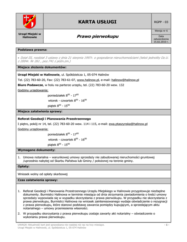 KARTA USŁUGI RGPP - 03 Wersja nr 6 Urząd Miejski w Halinowie Prawo pierwokupu Data zatwierdzenia 15.02.2010 r. Podstawa prawna: • Dział III, rozdział 3 ustawy z dnia 21 sierpnia 1997r. o gospodarce nieruchomościami (tekst jednolity Dz.U. z 2004r. Nr 261 , poz.741 z późn.zm.) Miejsce złożenia dokumentów: Urząd Miejski w Halinowie, ul. Spółdzielcza 1, 05-074 Halinów Tel. (22) 783-60-20, Fax: (22) 783-61-07, www.halinow.pl, e-mail: [email protected] Biuro Podawcze, w holu na parterze urzędu, tel. (22) 783-60-20 wew. 132 Godziny urzędowania: poniedziałek 800 - 1700 wtorek - czwartek 800 - 1600 piątek 800 - 1500 Miejsce załatwienia sprawy: Referat Geodezji i Planowania Przestrzennego I piętro, pokój nr 14, tel. (22) 783-60-20 wew. 114 i 115, e-mail: [email protected] Godziny urzędowania: poniedziałek 800 - 1700 wtorek - czwartek 800 - 1600 piątek 800 - 1500 Wymagane dokumenty: 1. Umowa notarialna – warunkowej umowy sprzedaży nie zabudowanej nieruchomości gruntowej /uprzednio nabytej od Skarbu Państwa lub Gminy / położonej na terenie gminy. Opłaty: Wniosek wolny od opłaty skarbowej Czas załatwienia sprawy: 1. Referat Geodezji i Planowania Przestrzennego Urzędu Miejskiego w Halinowie przygotowuje niezbędne dokumenty. Burmistrz Halinowa w terminie miesiąca od dnia otrzymania zawiadomienia o treści umowy sprzedaży wypowiada się w wypadku skorzystania z prawa pierwokupu. W przypadku nie skorzystania z prawa pierwokupu, Burmistrz Halinowa na wniosek zainteresowanego wydaje oświadczenie o rezygnacji z prawa pierwokupu, które stanowi podstawę zawarcia pomiędzy kupującym, a sprzedającym aktu notarialnego – umowy przeniesienia własności. 2. W przypadku skorzystania z prawa pierwokupu zostaje zawarty akt notarialny – oświadczenie o wykonaniu prawa pierwokupu. UWAGA! Aktualność kart jest sprawdzana nie rzadziej niż raz na trzy miesiące. Urząd Miejski w Halinowie, ul. Spółdzielcza 1, 05-074 Halinów -1- Tryb odwoławczy: Nie przewiduje się trybu odwoławczego, gdyż podstawą wszczęcia sprawy jest oświadczenie woli złożone przed notariuszem. Akt notarialny – warunkowa umowa sprzedaży zawiera pouczenie o przysługującym gminie prawie pierwokupu. Podjęte w konsekwencji zawartej warunkowej umowy sprzedaży stanowisko Burmistrza Halinowa nie jest decyzją administracyjną w rozumieniu przepisów Kodeksu Postępowania Administracyjnego. Dodatkowe informacje: Skorzystanie lub nie skorzystanie z prawa pierwokupu jest sprawą rozpatrywaną z urzędu. Zgodnie z art. 24 ustawy z dnia 29 sierpnia 1997 r. o ochronie danych osobowych (Dz. U. Nr 101, poz. 926 z późniejszymi zmianami) informuję, że dane osobowe zebrane w celu rozpatrywania spraw wniesionych do Urzędu, są gromadzone w Urzędzie Miejskim w Halinowie 05-074, przy ul. Spółdzielczej 1. Zebrane dane osobowe są przetwarzane w celu rozpatrzenia sprawy wniesionej do Urzędu, przez pracowników Urzędu upoważnionych do przetwarzania danych osobowych. Każdy kogo dane osobowe są gromadzone i przetwarzane w Urzędzie Miejskim w Halinowie , ma prawo dostępu do swoich danych oraz wnoszenia o ich poprawianie. Miejsce na notatki: Metryczka Imię i nazwisko - stanowisko Podpis Data Opracowała: Ewa Ptaszyńska - Inspektor ds. gospodarki gruntami 15.02.2010 Sprawdziła: Krystyna Skwarek - Kierownik RGPP 15.02.2010 Zatwierdziła: Jolanta Damasiewicz - Burmistrz 15.02.2010 UWAGA! Aktualność kart jest sprawdzana nie rzadziej niż raz na trzy miesiące. Urząd Miejski w Halinowie, ul. Spółdzielcza 1, 05-074 Halinów -2-