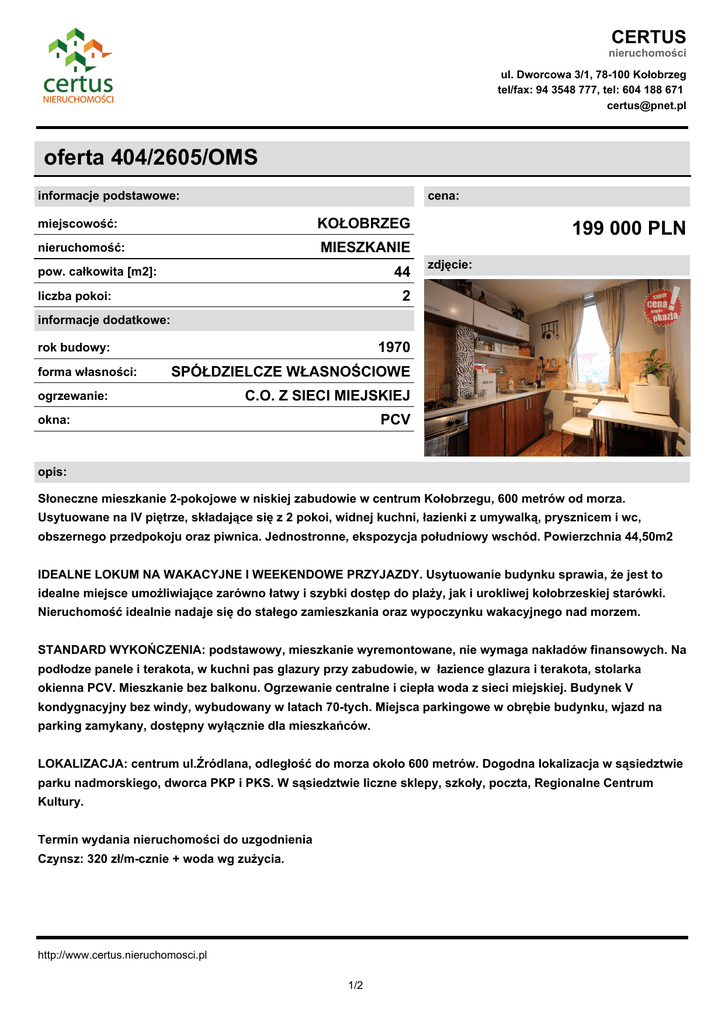 CERTUS nieruchomości ul. Dworcowa 3/1, 78-100 Kołobrzeg tel/fax: 94 3548 777, tel: 604 188 671 [email protected] oferta 404/2605/OMS informacje podstawowe: cena: miejscowość: KOŁOBRZEG nieruchomość: MIESZKANIE 44 pow. całkowita [m2]: 199 000 PLN zdjęcie: 2 liczba pokoi: informacje dodatkowe: 1970 rok budowy: forma własności: SPÓŁDZIELCZE WŁASNOŚCIOWE ogrzewanie: C.O. Z SIECI MIEJSKIEJ PCV okna: opis: Słoneczne mieszkanie 2-pokojowe w niskiej zabudowie w centrum Kołobrzegu, 600 metrów od morza. Usytuowane na IV piętrze, składające się z 2 pokoi, widnej kuchni, łazienki z umywalką, prysznicem i wc, obszernego przedpokoju oraz piwnica. Jednostronne, ekspozycja południowy wschód. Powierzchnia 44,50m2 IDEALNE LOKUM NA WAKACYJNE I WEEKENDOWE PRZYJAZDY. Usytuowanie budynku sprawia, że jest to idealne miejsce umożliwiające zarówno łatwy i szybki dostęp do plaży, jak i urokliwej kołobrzeskiej starówki. Nieruchomość idealnie nadaje się do stałego zamieszkania oraz wypoczynku wakacyjnego nad morzem. STANDARD WYKOŃCZENIA: podstawowy, mieszkanie wyremontowane, nie wymaga nakładów finansowych. Na podłodze panele i terakota, w kuchni pas glazury przy zabudowie, w łazience glazura i terakota, stolarka okienna PCV. Mieszkanie bez balkonu. Ogrzewanie centralne i ciepła woda z sieci miejskiej. Budynek V kondygnacyjny bez windy, wybudowany w latach 70-tych. Miejsca parkingowe w obrębie budynku, wjazd na parking zamykany, dostępny wyłącznie dla mieszkańców. LOKALIZACJA: centrum ul.Źródlana, odległość do morza około 600 metrów. Dogodna lokalizacja w sąsiedztwie parku nadmorskiego, dworca PKP i PKS. W sąsiedztwie liczne sklepy, szkoły, poczta, Regionalne Centrum Kultury. Termin wydania nieruchomości do uzgodnienia Czynsz: 320 zł/m-cznie + woda wg zużycia. http://www.certus.nieruchomosci.pl 1/2 CERTUS nieruchomości ul. Dworcowa 3/1, 78-100 Kołobrzeg tel/fax: 94 3548 777, tel: 604 188 671 [email protected] W celu uzyskania szczegółowych informacji o ofercie prosimy o kontakt telefoniczny, bądź mailowy http://www.certus.nieruchomosci.pl 2/2