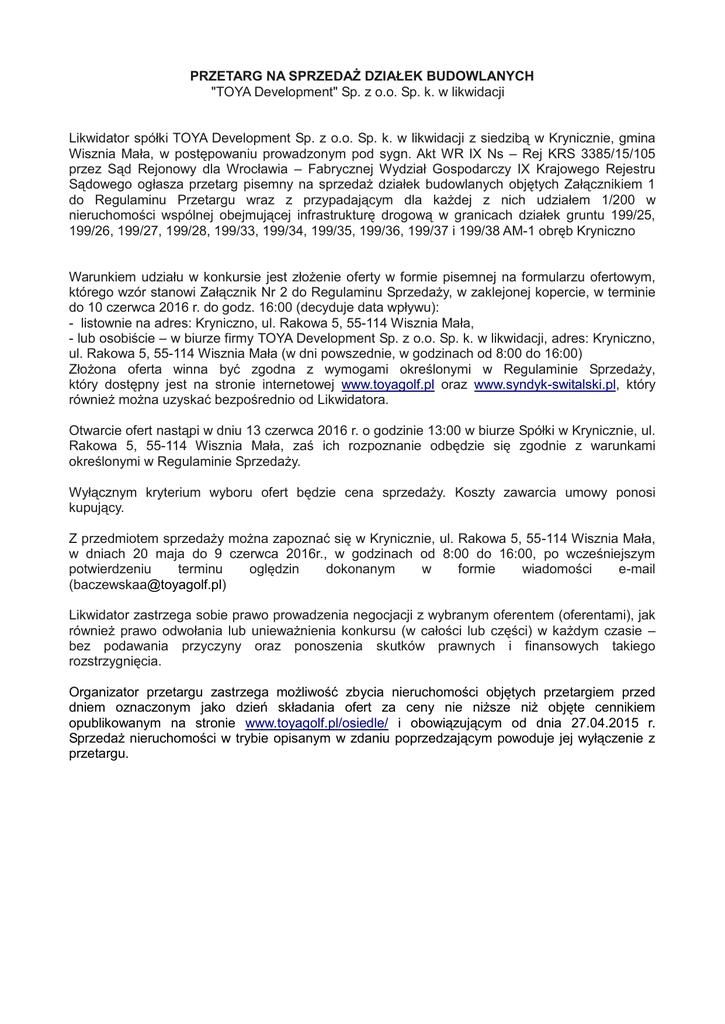 PRZETARG NA SPRZEDAŻ DZIAŁEK BUDOWLANYCH "TOYA Development" Sp. z o.o. Sp. k. w likwidacji Likwidator spółki TOYA Development Sp. z o.o. Sp. k. w likwidacji z siedzibą w Krynicznie, gmina Wisznia Mała, w postępowaniu prowadzonym pod sygn. Akt WR IX Ns – Rej KRS 3385/15/105 przez Sąd Rejonowy dla Wrocławia – Fabrycznej Wydział Gospodarczy IX Krajowego Rejestru Sądowego ogłasza przetarg pisemny na sprzedaż działek budowlanych objętych Załącznikiem 1 do Regulaminu Przetargu wraz z przypadającym dla każdej z nich udziałem 1/200 w nieruchomości wspólnej obejmującej infrastrukturę drogową w granicach działek gruntu 199/25, 199/26, 199/27, 199/28, 199/33, 199/34, 199/35, 199/36, 199/37 i 199/38 AM-1 obręb Kryniczno Warunkiem udziału w konkursie jest złożenie oferty w formie pisemnej na formularzu ofertowym, którego wzór stanowi Załącznik Nr 2 do Regulaminu Sprzedaży, w zaklejonej kopercie, w terminie do 10 czerwca 2016 r. do godz. 16:00 (decyduje data wpływu): - listownie na adres: Kryniczno, ul. Rakowa 5, 55-114 Wisznia Mała, - lub osobiście – w biurze firmy TOYA Development Sp. z o.o. Sp. k. w likwidacji, adres: Kryniczno, ul. Rakowa 5, 55-114 Wisznia Mała (w dni powszednie, w godzinach od 8:00 do 16:00) Złożona oferta winna być zgodna z wymogami określonymi w Regulaminie Sprzedaży, który dostępny jest na stronie internetowej www.toyagolf.pl oraz www.syndyk-switalski.pl, który również można uzyskać bezpośrednio od Likwidatora. Otwarcie ofert nastąpi w dniu 13 czerwca 2016 r. o godzinie 13:00 w biurze Spółki w Krynicznie, ul. Rakowa 5, 55-114 Wisznia Mała, zaś ich rozpoznanie odbędzie się zgodnie z warunkami określonymi w Regulaminie Sprzedaży. Wyłącznym kryterium wyboru ofert będzie cena sprzedaży. Koszty zawarcia umowy ponosi kupujący. Z przedmiotem sprzedaży można zapoznać się w Krynicznie, ul. Rakowa 5, 55-114 Wisznia Mała, w dniach 20 maja do 9 czerwca 2016r., w godzinach od 8:00 do 16:00, po wcześniejszym potwierdzeniu terminu oględzin dokonanym w formie wiadomości e-mail ([email protected]) Likwidator zastrzega sobie prawo prowadzenia negocjacji z wybranym oferentem (oferentami), jak również prawo odwołania lub unieważnienia konkursu (w całości lub części) w każdym czasie – bez podawania przyczyny oraz ponoszenia skutków prawnych i finansowych takiego rozstrzygnięcia. Organizator przetargu zastrzega możliwość zbycia nieruchomości objętych przetargiem przed dniem oznaczonym jako dzień składania ofert za ceny nie niższe niż objęte cennikiem opublikowanym na stronie www.toyagolf.pl/osiedle/ i obowiązującym od dnia 27.04.2015 r. Sprzedaż nieruchomości w trybie opisanym w zdaniu poprzedzającym powoduje jej wyłączenie z przetargu.