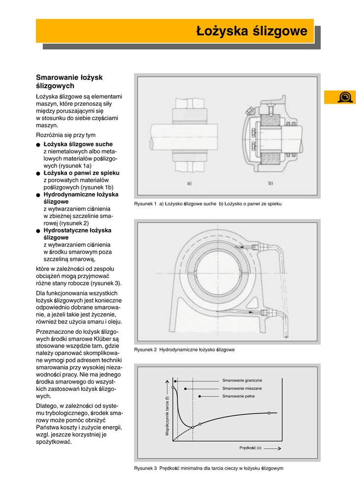 £o¿yska œlizgowe Smarowanie ³o¿ysk œlizgowych £o¿yska œlizgowe s¹ elementami maszyn, które przenosz¹ si³y miêdzy poruszaj¹cymi siê w stosunku do siebie czêœciami maszyn. Rozró¿nia siê przy tym l l l l £o¿yska œlizgowe suche z niemetalowych albo metalowych materia³ów poœlizgowych (rysunek 1a) £o¿yska o panwi ze spieku z porowatych materia³ów poœlizgowych (rysunek 1b) Hydrodynamiczne ³o¿yska œlizgowe z wytwarzaniem ciœnienia w zbie¿nej szczelinie smarowej (rysunek 2) Hydrostatyczne ³o¿yska œlizgowe z wytwarzaniem ciœnienia w œrodku smarowym poza szczelin¹ smarow¹, Rysunek 1 a) £o¿ysko œlizgowe suche b) £o¿ysko o panwi ze spieku które w zale¿noœci od zespo³u obci¹¿eñ mog¹ przyjmowaæ ró¿ne stany robocze (rysunek 3). Dla funkcjonowania wszystkich ³o¿ysk œlizgowych jest konieczne odpowiednio dobrane smarowanie, a je¿eli takie jest ¿yczenie, równie¿ bez u¿ycia smaru i oleju. Dlatego, w zale¿noœci od systemu trybologicznego, œrodek smarowy mo¿e pomóc obni¿yæ Pañstwa koszty i zu¿ycie energii, wzgl. jeszcze korzystniej je spo¿ytkowaæ. Rysunek 2 Hydrodynamiczne ³o¿ysko œlizgowe Smarowanie graniczne Smarowanie mieszane Wspó³czynnik tarcia (f) Przeznaczone do ³o¿ysk œlizgowych œrodki smarowe Klüber s¹ stosowane wszêdzie tam, gdzie nale¿y opanowaæ skomplikowane wymogi pod adresem techniki smarowania przy wysokiej niezawodnoœci pracy. Nie ma jednego œrodka smarowego do wszystkich zastosowañ ³o¿ysk œlizgowych. Smarowanie pe³ne Prêdkoœæ (v) Rysunek 3 Prêdkoœæ minimalna dla tarcia cieczy w ³o¿ysku œlizgowym