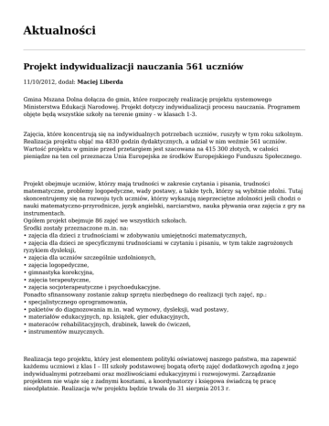 Aktualności Projekt indywidualizacji nauczania 561 uczniów 11/10/2012, dodał: Maciej Liberda Gmina Mszana Dolna dołącza do gmin, które rozpoczęły realizację projektu systemowego Ministerstwa Edukacji Narodowej. Projekt dotyczy indywidualizacji procesu nauczania. Programem objęte będą wszystkie szkoły na terenie gminy - w klasach 1-3. Zajęcia, które koncentrują się na indywidualnych potrzebach uczniów, ruszyły w tym roku szkolnym. Realizacja projektu objąć ma 4830 godzin dydaktycznych, a udział w nim weźmie 561 uczniów. Wartość projektu w gminie przed przetargiem jest szacowana na 415 300 złotych, w całości pieniądze na ten cel przeznacza Unia Europejska ze środków Europejskiego Funduszu Społecznego. Projekt obejmuje uczniów, którzy mają trudności w zakresie czytania i pisania, trudności matematyczne, problemy logopedyczne, wady postawy, a także tych, którzy są wybitnie zdolni. Tutaj skoncentrujemy się na rozwoju tych uczniów, którzy wykazują nieprzeciętne zdolności jeśli chodzi o nauki matematyczno-przyrodnicze, język angielski, narciarstwo, nauka pływania oraz zajęcia z gry na instrumentach. Ogółem projekt obejmuje 86 zajęć we wszystkich szkołach. Środki zostały przeznaczone m.in. na: • zajęcia dla dzieci z trudnościami w zdobywaniu umiejętności matematycznych, • zajęcia dla dzieci ze specyficznymi trudnościami w czytaniu i pisaniu, w tym także zagrożonych ryzykiem dysleksji, • zajęcia dla uczniów szczególnie uzdolnionych, • zajęcia logopedyczne, • gimnastyka korekcyjna, • zajęcia terapeutyczne, • zajęcia socjoterapeutyczne i psychoedukacyjne. Ponadto sfinansowany zostanie zakup sprzętu niezbędnego do realizacji tych zajęć, np.: • specjalistycznego oprogramowania, • pakietów do diagnozowania m.in. wad wymowy, dysleksji, wad postawy, • materiałów edukacyjnych, np. książek, gier edukacyjnych, • materaców rehabilitacyjnych, drabinek, ławek do ćwiczeń, • instrumentów muzycznych. Realizacja tego projektu, który jest elementem polityki oświatowej naszego państwa, ma zapewnić każdemu uczniowi z klas I – III szkoły podstawowej bogatą ofertę zajęć dodatkowych zgodną z jego indywidualnymi potrzebami oraz możliwościami edukacyjnymi i rozwojowymi. Zarządzanie projektem nie wiąże się z żadnymi kosztami, a koordynatorzy i księgowa świadczą tę pracę nieodpłatnie. Realizacja w/w projektu będzie trwała do 31 sierpnia 2013 r. Pojęcie indywidualizacji Występowanie różnic indywidualnych między poszczególnymi uczniami jest zjawiskiem pedagogicznie normalnym. Od szkoły wymaga się, by każdy uczeń był traktowany indywidualnie, z uwzględnieniem jego zasobów i potrzeb, które w efekcie różnicują uczniów. Nowy model pomocy psychologiczno-pedagogicznej promuje indywidualizację kształcenia polegającą na niwelowaniu niekorzystnych różnic między uczniami, przy jednoczesnym rozwijaniu cech pozytywnych. W myśl obowiązujących przepisów indywidualizacją obejmuje się szczególnie uczniów, u których rozpoznano lub zdiagnozowano specjalne potrzeby edukacyjne. Pojęcie indywidualizacji nie jest pojęciem nowym. Zajmowali się nim liczni, znani pedagodzy. Literatura z tego zakresu zgodnie wskazuje, że celem indywidualizacji pracy ucznia, najogólniej mówiąc, jest poprawienie wyników uczenia się dzięki wykorzystaniu indywidualnych właściwości uczącego się i zwiększaniu jego indywidualnych możliwości. Nauczyciel, który zamierza stosować indywidualizuję, musi zatem poznać cechy, właściwości uczniów, które wyznaczają ich możliwości, określają sposób uczenia się. Bez tego indywidualizacja jest niemożliwa. Podstawy prawne Po wprowadzeniu reformy programowej indywidualizacja nauczania przejawia się w wielu aktach prawnych. Nowa podstawa programowa czyni z indywidualizacji podstawowy sposób pracy z uczniami, zaś rozporządzenia zebrane w tzw. pakiet poradniany określają warunki i sposób jej wdrożenia. Rozporządzenie o ocenianiu zobowiązuje nauczycieli do indywidualizowania pracy z uczniem zarówno na obowiązkowych, jak i dodatkowych zajęciach edukacyjnych, odpowiednio do potrzeb rozwojowych i edukacyjnych oraz możliwości psychofizycznych ucznia. Konieczność uwzględniania w procesie nauczania indywidualnych możliwości uczniów zakładają również pozostałe rozporządzenia z pakietu, w tym dotyczące kształcenia uczniów niepełnosprawnych oraz niedostosowanych społecznie. Wiodącą rolę pełni rozporządzenie w sprawie zasad udzielania i organizacji pomocy psychologiczno-pedagogicznej w publicznych przedszkolach, szkołach i placówkach, określające nową koncepcję jej udzielania i organizacji. Zgodnie z nowym modelem pomocy każdy nauczyciel ma obowiązek rozpoznawania możliwości i potrzeb uczniów oraz w razie konieczności udzielenia potrzebnej pomocy. Agata Chorągwicka