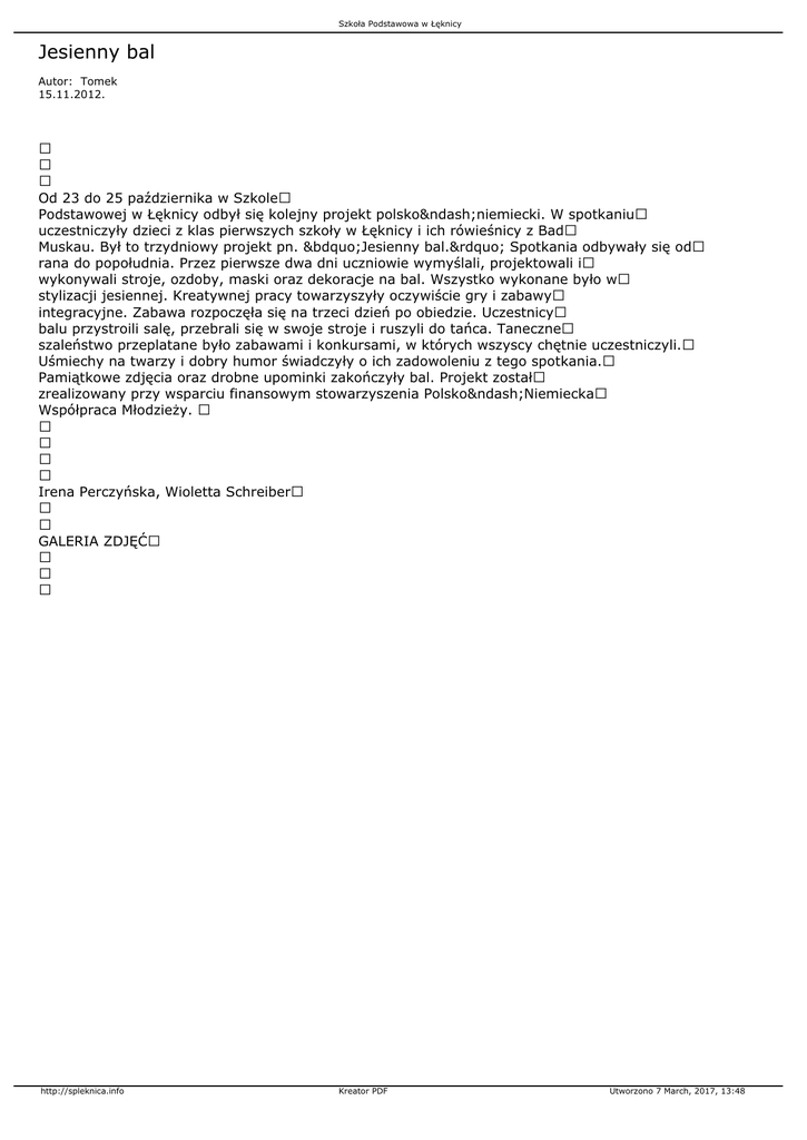 Szkoła Podstawowa w Łęknicy Jesienny bal Autor: Tomek 15.11.2012. Od 23 do 25 października w Szkole Podstawowej w Łęknicy odbył się kolejny projekt polsko–niemiecki. W spotkaniu uczestniczyły dzieci z klas pierwszych szkoły w Łęknicy i ich rówieśnicy z Bad Muskau. Był to trzydniowy projekt pn. „Jesienny bal.” Spotkania odbywały się od rana do popołudnia. Przez pierwsze dwa dni uczniowie wymyślali, projektowali i wykonywali stroje, ozdoby, maski oraz dekoracje na bal. Wszystko wykonane było w stylizacji jesiennej. Kreatywnej pracy towarzyszyły oczywiście gry i zabawy integracyjne. Zabawa rozpoczęła się na trzeci dzień po obiedzie. Uczestnicy balu przystroili salę, przebrali się w swoje stroje i ruszyli do tańca. Taneczne szaleństwo przeplatane było zabawami i konkursami, w których wszyscy chętnie uczestniczyli. Uśmiechy na twarzy i dobry humor świadczyły o ich zadowoleniu z tego spotkania. Pamiątkowe zdjęcia oraz drobne upominki zakończyły bal. Projekt został zrealizowany przy wsparciu finansowym stowarzyszenia Polsko–Niemiecka Współpraca Młodzieży. Irena Perczyńska, Wioletta Schreiber GALERIA ZDJĘĆ http://spleknica.info Kreator PDF Utworzono 7 March, 2017, 13:48