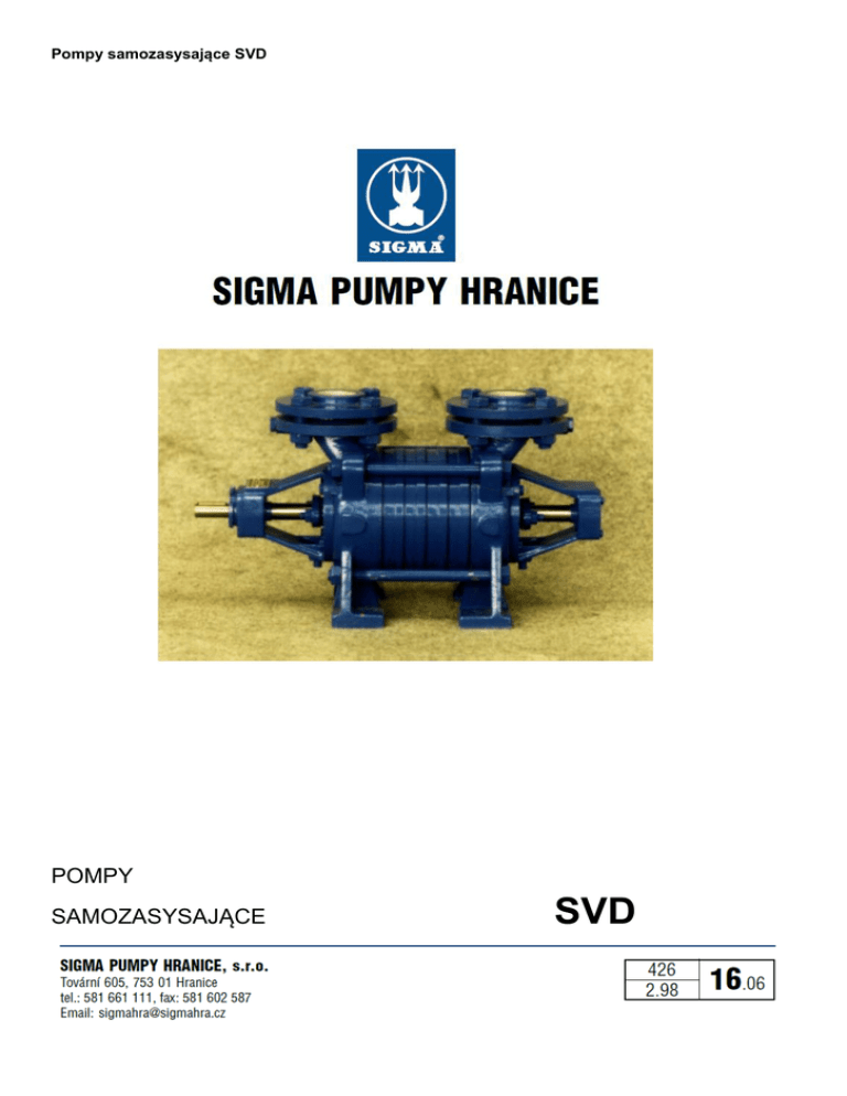 Pompy samozasysające SVD POMPY SAMOZASYSAJĄCE SVD Pompy samozasysające SVD ze strony napędu. Na specjalne wymaganie mogą być dostarczone i prawoskrętne. Zastosowanie Pompy samozasysające sekcyjne odśrodkowe szeregu SVD są przeznaczone do pompowania wody do picia i wody użytkowej do 90oC bez zanieczyszczeń mechanicznych. W wykonaniu do pompowania materiałów palnych są odpowiednie do pompowania materiałów palnych I. – IV. Klasy. Możliwe jest użyć je do pompowania olejów do maks. wiskozy kinematycznej 37 mm2.s-1. Główną zaletą jest zdolność samozasysająca (wysokość ssawna do 8 m). Charakteryzują się szeregowaniem poszczególnych sekcji (stopni) za sobą w ilości odpowiadającej wymaganej wysokości transportowej. Wykonanie materiałowe Obudowa ssawna i tłoczna, wkładka ssawna i tłoczna, kołnierze gwintowe, obudowy łożyskowe, pokrywa uszczelnienia są z żeliwa szarego. Wirniki są z mosiądzu i wał ze stali. Uszczelnienie sznurowe jest w jakości odpowiadającej pompowanej cieczy. Uszczelkę wybiera się wg pompowanej cieczy bądź miękką lub mechaniczną. Akcesoria Pompy są dostarczane z kryzami razem z uszczelnieniami i śrubami. Otwory w obudowie ssącej i tłocznej dla podłączenia manometru i próżnomierza są opatrzone zatyczkami. Opis Pompy szeregu SVD są odśrodkowe, horyzontalne, samozasysające, konstruowane dla bezpośredniego połączenia z silnikiem napędowym. Pompa składa się z obudowy ssącej i tłocznej, wkładki ssącej i tłocznej, obudowy łożyska, pokrywy uszczelnienia, wału z wirnikami i łożysk. Szyjka ssąca i tłoczna jest wyprowadzona zawsze w górę. Między obudowę ssącą i tłoczną są włożone wkładki ssawne i tłoczne z wirnikami w ilości wg wymaganego ciśnienia. Te wkładki są między obudową ssącą i tłoczną ściągnięte śrubami. Wał pompy jest umieszczony na obu stronach w łożysku kulkowym. Wał jest uszczelniony miękkim uszczelnieniem sznurowym albo uszczelnieniem mechanicznym. Pompy są postawione na szerokiej podstawie obudowy tłocznej lub na pół podstawach obudowy ssawnej i tłocznej. Wykonanie pomp SVD Pompy SVD są budowane dla bezpośredniego napędu silnikiem elektrycznym. Dostarczane są ze sposobami napędu wg CSN 11 0021. Napęd 1 – pompa sama z wolnym końcem wału Napęd 9 – pompa z zupełnie elastycznym łącznikiem i z silnikiem elektrycznym na wspólnej płycie fundamentowej. Na specjalne wymaganie dostarczamy: Napęd 2 – pompa z zupełnie elastycznym łącznikiem Napęd 3 – pompa z zupełnie elastycznym łącznikiem i z płytą fundamentową wspólną dla pompy i silnik. Dane dla zamówienia - wymagane parametry - cel zastosowania - rodzaj i temperatura pompowanej cieczy - typ i wykonanie pompy - napięcie eksploatacyjne Kierunek obrotów Pompy szeregu SVD są lewoskrętne, tj. kierunek obrotów wału jest przeciw kierunku wskazówek zegara przy spojrzeniu Dane techniczne Typ pompy DN szyjka ssawna/tłoc zna Q [l.s-1] H [m] Moc [kW] Wariant z uszczelką mech. Waga [kg] napęd 1 nie tak Wymienione moce pomp są ważne dla obrotów n=1450 min -1 i wody czystej o temperaturze 15oC, p=1000 kg.m-3, przy wysokości ssącej 7 m i miękkim sznurowym uszczelnieniu. Pompy samozasysające SVD Informacyjny przekrój pompy – uszczelka miękka 1 Obudowa ssawna 2 Obudowa tłoczna 3 Wkładka ssawna 4 Wkładka tłoczna 5 Wirnik 6 Obudowa łożyska 7 Obudowa łożyska 8 Pokrywa uszczelnienia 11 Wał 16 Łożysko 21 Uszczelnienie sznurowe 23 Uszczelnienie Pompy samozasysające SVD Informacyjny przekrój pompy – uszczelnienie mechaniczne 1 Obudowa ssawna 2 Obudowa tłoczna 3 Wkładka ssawna 4 Wkładka tłoczna 5 Wirnik 6 Obudowa łożyska 7 Obudowa łożyska 11 Wał 16 Łożysko 23 Uszczelnienie 51 Uszczelnienie mechaniczne 53 Pokrywa uszczelnienia Pompy samozasysające SVD Szkic wymiarowy Pompy samozasysające SVD Szkic wymiarowy Pompy samozasysające SVD Diagram informacyjny pompy