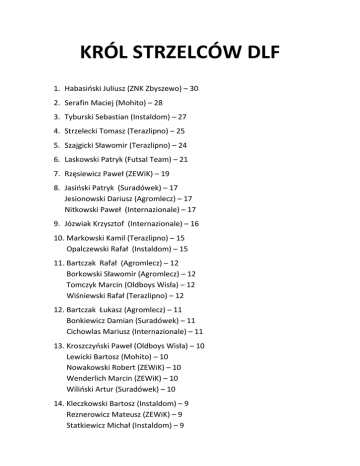 KRÓL STRZELCÓW DLF 1. Habasiński Juliusz (ZNK Zbyszewo) – 30 2. Serafin Maciej (Mohito) – 28 3. Tyburski Sebastian (Instaldom) – 27 4. Strzelecki Tomasz (Terazlipno) – 25 5. Szajgicki Sławomir (Terazlipno) – 24 6. Laskowski Patryk (Futsal Team) – 21 7. Rzęsiewicz Paweł (ZEWiK) – 19 8. Jasiński Patryk (Suradówek) – 17 Jesionowski Dariusz (Agromlecz) – 17 Nitkowski Paweł (Internazionale) – 17 9. Józwiak Krzysztof (Internazionale) – 16 10. Markowski Kamil (Terazlipno) – 15 Opalczewski Rafał (Instaldom) – 15 11. Bartczak Rafał (Agromlecz) – 12 Borkowski Sławomir (Agromlecz) – 12 Tomczyk Marcin (Oldboys Wisła) – 12 Wiśniewski Rafał (Terazlipno) – 12 12. Bartczak Łukasz (Agromlecz) – 11 Bonkiewicz Damian (Suradówek) – 11 Cichowlas Mariusz (Internazionale) – 11 13. Kroszczyński Paweł (Oldboys Wisła) – 10 Lewicki Bartosz (Mohito) – 10 Nowakowski Robert (ZEWiK) – 10 Wenderlich Marcin (ZEWiK) – 10 Wiliński Artur (Suradówek) – 10 14. Kleczkowski Bartosz (Instaldom) – 9 Reznerowicz Mateusz (ZEWiK) – 9 Statkiewicz Michał (Instaldom) – 9 15. Kwiatkowski Marcin (Futsal Team) – 8 16. Groszkiewicz Dariusz (Agromlecz) – 7 Habasiński Mateusz (ZNK Zbyszewo) – 7 Tadajewski Michał (Suradówek) – 7 Ziółkowski Ireneusz (Oldboys Wisła) – 7 17. Białoskórski Mateusz (Instaldom) – 6 Chojnacki Dominik (Internazionale) – 6 Grudziński Marcin (Internazionale) – 6 Olewiński Paweł (Instaldom) – 6 Raniszewski Sebastian (Oldboys Wisła) – 6 Szymański Daniel (Internazionale) – 6 Wyczałkowski Paweł (ZEWiK) – 6 18. Dzierżanowski Piotr (ZNK Zbyszewo) – 5 Kotkiewicz Hubert (Terazlipno) – 5 Olewiński Damian (Oldboys) – 5 Raniszewski Tomasz (Mohito) – 5 Sieradziński Michał (Internazionale) – 5 Szklarczyk Dominik (Instaldom) – 5 19. Kraśnicki Damazy (ZEWiK) – 4 Kryger Mariusz (ZNK Zbyszewo) – 4 Lewandowski Jarosław (ZNK Zbyszewo) – 4 Lipiński Dariusz (Suradówek) – 4 Ośmiałowski Michał (Mohito) – 4 Paszyński Sebastian (Oldboys Wisła) – 4 Pietrzycki Edward (Internazionale) – 4 Żuchowski Kamil (ZNK Zbyszewo) – 4 20. Dąbrowski Marcin (Mohito) – 3 Górecki Hubert (Futsal Team) – 3 Jaskólski Dawid (Instaldom) – 3 Jóźwiak Sebastian (Internazionale) – 3 Majewski Krzysztof (Futsal Team) – 3 Nowakowski Piotr (Futsal Team) – 3 Sadowski Dariusz (Agromlecz) – 3 Szarpatowski Michał (Terazlipno) – 3 Szkodziński Arkadiusz (Mohito) – 3 21. Bukowski Damian (Internazionale) – 2 Chojnicki Marcin (Mohito) – 2 Pawłowski Krzysztof (Oldboys Wisła) – 2 Pekrul Wojciech (Futsal Team) – 2 Piekarski Marcin (Oldboys Wisła) – 2 Piórkowski Mariusz (Futsal Team) – 2 Raszka Daniel (Internazionale) – 2 Sadowski Tomasz (Agromlecz) – 2 Wawszczyk Jakub (Mohito) – 2 Wyszyński Arkadiusz (Futsal Team) – 2 22. Bartczak Jan (Agromlecz) – 1 Bonowicz Damian (Suradówek) – 1 Dykowski Adrian (Oldboys Wisła) – 1 Górecki Mateusz (Instaldom) – 1 Grączewski Przemysław (Instaldom) – 1 Grączewski Tomasz (Instaldom) – 1 Kacprzak Krystian (Futsal Team) – 1 Kauwa Konrad (Futsal Team) – 1 Kijek Marek (ZEWiK) – 1 Kołodziejski Mariusz (Mohito) – 1 Kwiatkowski Michał (Agromlecz) – 1 Muranowski Dawid (Suradówek) – 1 Nierychlewski Paweł (Instaldom) – 1 Pańkowski Maciej (Instaldom) – 1 Piekarski Maciej (ZNK Zbyszewo) – 1 Pokłacki Dariusz (Terazlipno) – 1 Prokopiak Bartosz (Internazionale) – 1 Sadowski Robert (Agromlecz) – 1 Słupecki Michał (Terazlipno) – 1 Szajgicki Patryk (Terazlipno) – 1 Świątecki Grzgorz (Suradówek) – 1 Tyburski Kamil (ZNK Zbyszewo) – 1 Waśko Łukasz (ZEWiK) – 1 Wojnowski Artur (Internazionale) – 1 Żuchowski Arkadiusz (ZNK Zbyszewo) – 1